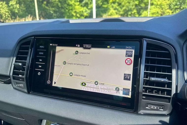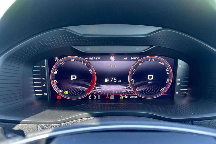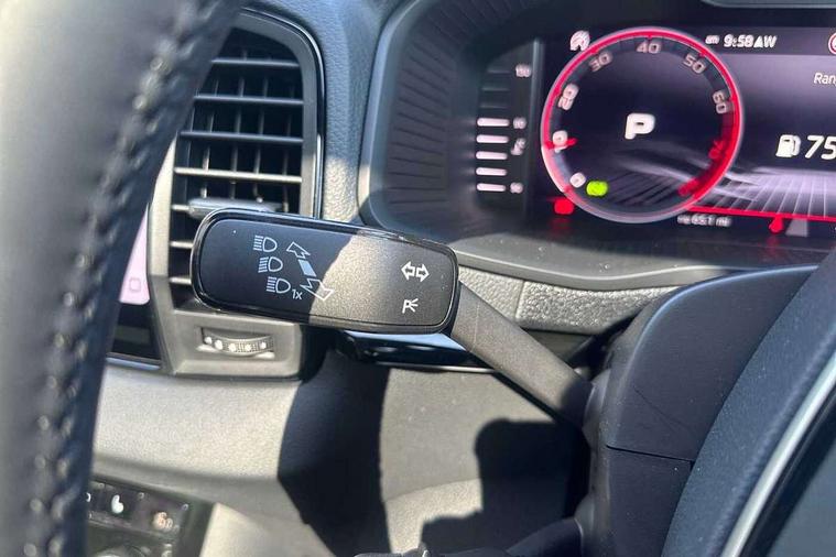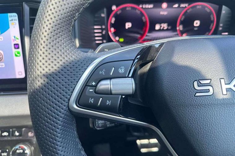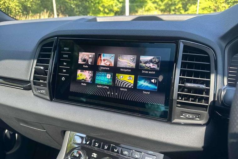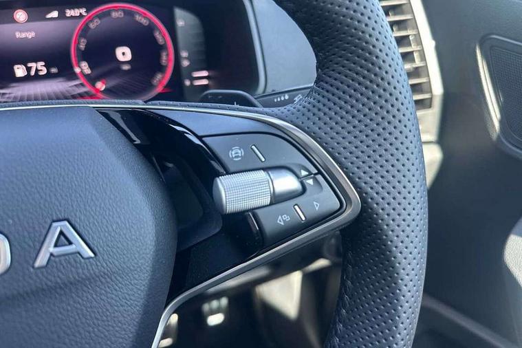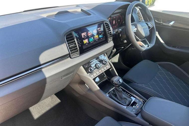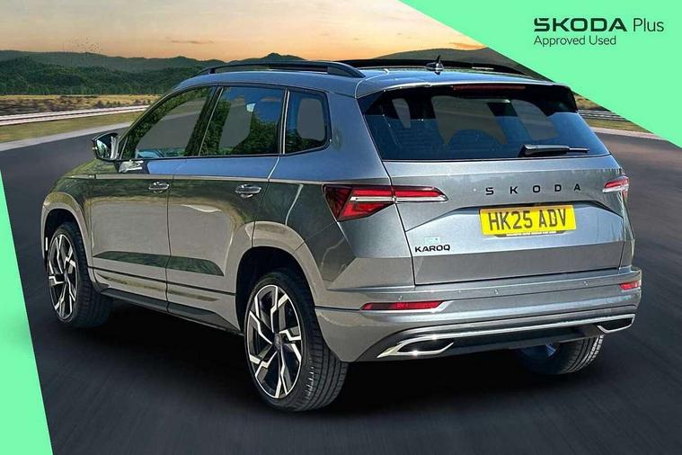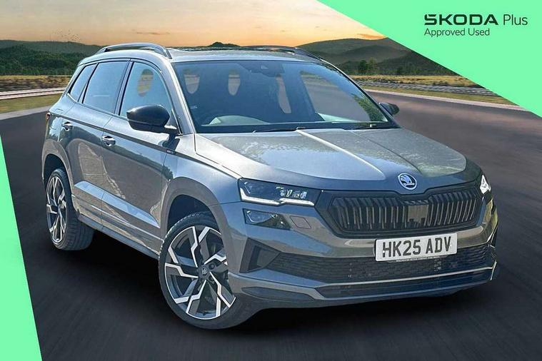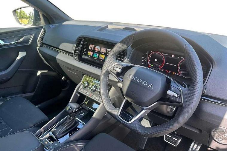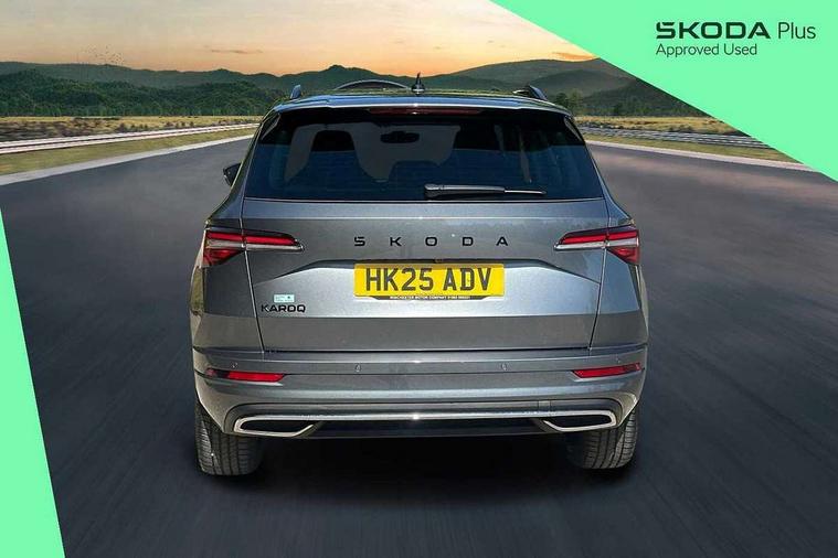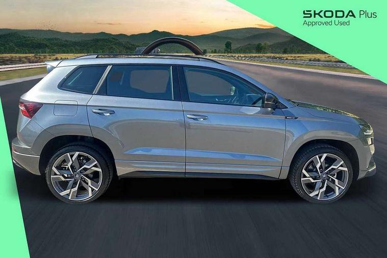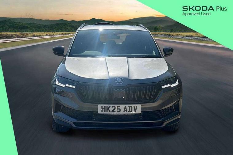 Advanced driver attention and drowsiness monitor, Emergency services call system, Outside temperature gauge, Sensor for driver assistance systems, Service interval indicator, SmartLink wireless for Apple and wired for Android, Start/stop system with regenerative braking, Traffic sign recognition, USB C Port x 2 in front centre console, Virtual Cockpit - 10.25" digital display, Virtual pedal with electrically operated boot door, Wireless smartphone charging, DAB radio with Bluetooth, USB connection, Acoustic glass, Aero front windscreen wipers with intermittent function, Auto dimming rear view mirror with light and rain sensors, Black door mirrors, Black electric window control buttons, Black radiator grille, Black roof rails, Body colour door handles, Electric front and rear windows with child proof lock, Extended rear roof spoiler, Front door steps with SportLine logo, Heated rear windscreen, LED daytime running lights, LED rear lights with high functionality welcome effect and dynamic indicators, Light assistant (coming/leaving home/tunnel light), Panoramic sliding sunroof, Plastic scuff plates in door apertures, Privacy glass, Protective door side sills in body colour, Rear diffuser, Rear side wing doors, Rear window wiper with washer system and intermittent control, Safety reflectors on front doors, Skoda lettering on tailgate in black, Sportline badge on front fender, Sports front and rear bumpers, Third brake light, Unique dark chrome design logo on alloy wheels, 1.5 litre bottle holders in driver and front passenger door panels, 12V socket in boot, 12v socket in front centre armrest with storage compartment and rear air vents, 2 x Tablet holder, 3 rear height adjustable headrests, 3 seat bench in 2nd row, 3 spoke sports leather heated multifunction steering wheel with DSG paddles, 4 foldable roof handles with rear coat hooks, Black floor carpet, Cargo elements in boot, Chrome inner door handles, Foldable hooks in the boot, Front head restraints, Height adjustable front three point seats belts with tensioners, Height/reach adjust steering wheel, Ice scraper, Illuminated glovebox, Illuminated luggage compartment, Isofix child seat preparation for front passenger seat, Isofix child seat preparation outer rear, Manual lumbar support for front seats, Pen holder, Pollen filter, Rear backrest release from boot, Rear boot cover, Rear package tray, Rear reading lights, Rear seats fixed folding and divided 60:40, Rubbish bin door, Safety vest holder, Single front passenger seat, Skoda lettering on steering wheel, Sportline decorative inserts, Storage box in upper central dashboard closed, Sunvisors with illuminated vanity mirrors, Textile floor mats, Ticket holder, Titan black interior ceiling, Umbrella under passenger seat, Under passenger seat storage compartment, Columbus pack - Karoq, LED Interior lighting pack with Skoda welcome logo - Karoq, Light Pack - Karoq, Non Smokers pack, Performance pack - Karoq, Winter plus pack with heated front and rear seats - Karoq, Automatic door unlocking in case of crash, Automatic fuel cut off in case of crash, Driver airbag, Electronic parking brake with auto hold function, Emergency rear braking signal, ESC (incl. ABS+MSR+ASR+EDS+HBA+DSR+RBS+MKB), Front side airbags, Head airbags, Hill hold control, Knee airbags, Passenger airbag with switch-off function, Pedestrian monitor, Seatbelt reminder signalisation and pretensioner for all seats, Three point seatbelts rear, Two tone horn, Tyre pressure monitor, Alarm with interior monitoring, back up horn and tilt sensor with safe function, Electronic engine immobiliser, Keyless entry and start/stop, Remote central locking with 2 remote folding keys, Black air vent surround, Black centre console, carbon door decor, Satin black dashboard, Satin black door trim, 19" Sagittarius anthracite alloy wheels, Anti-theft wheel bolts protection, Breakdown and tool kit,