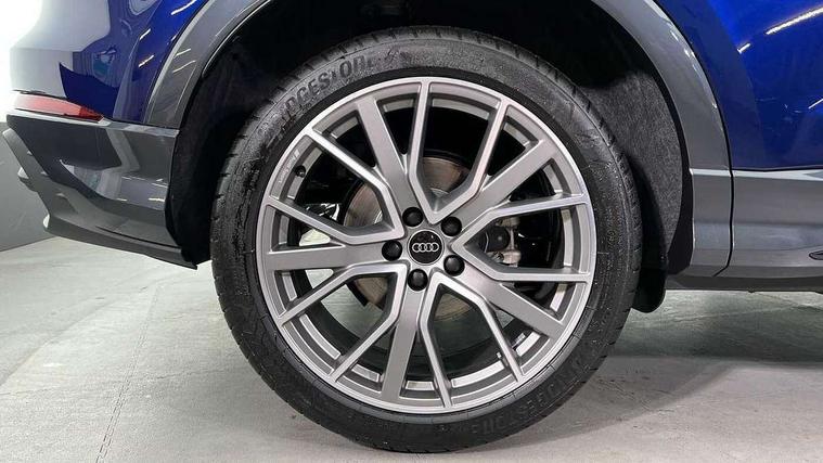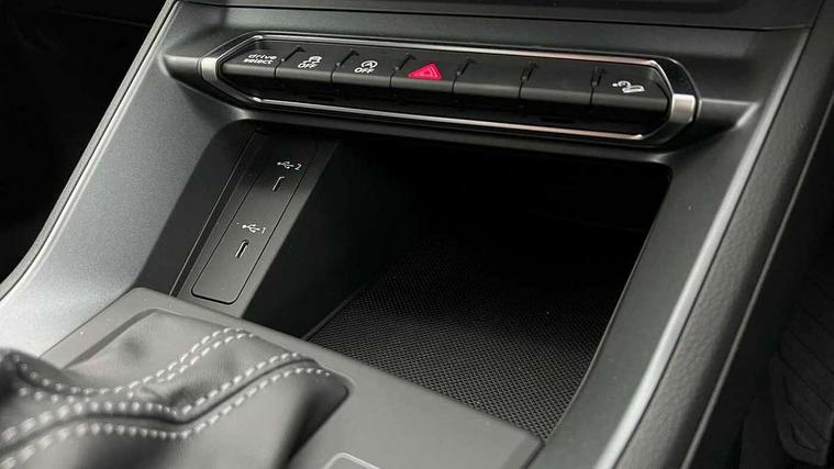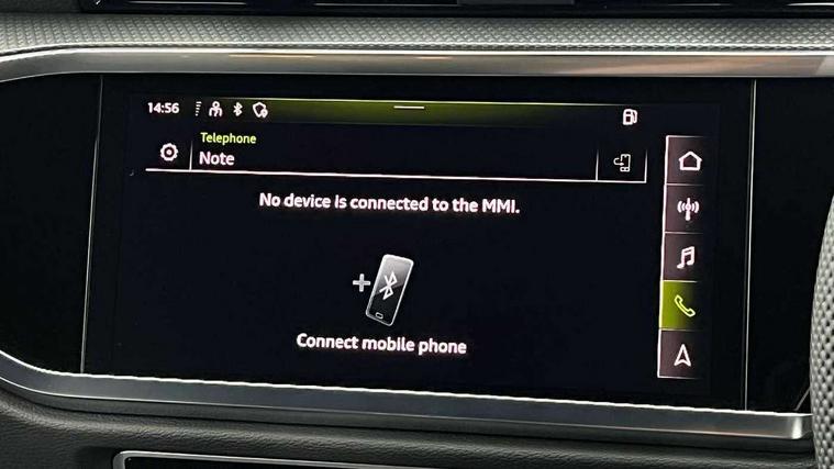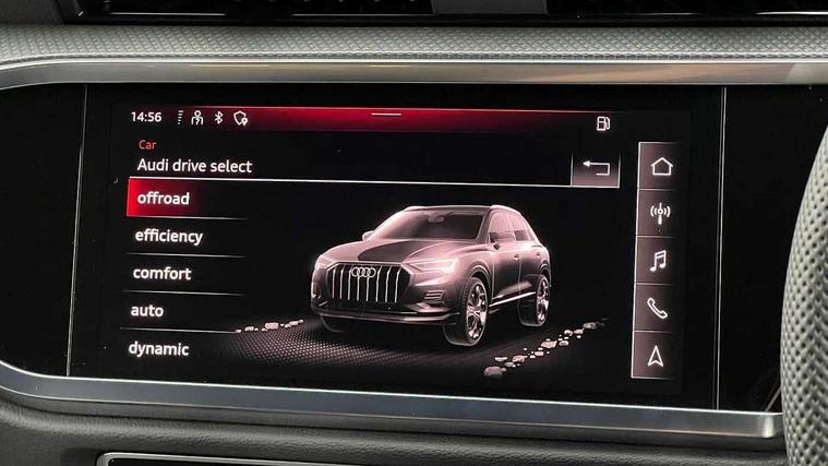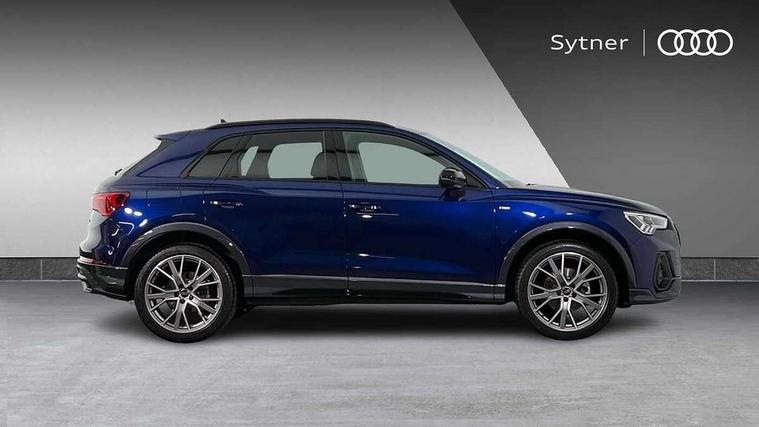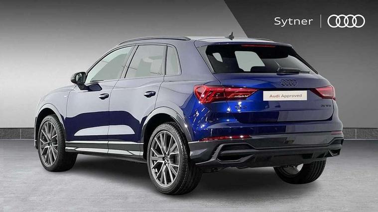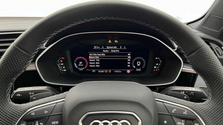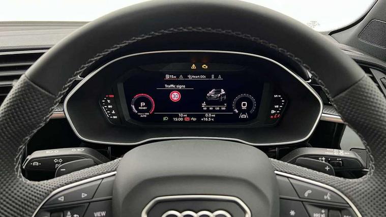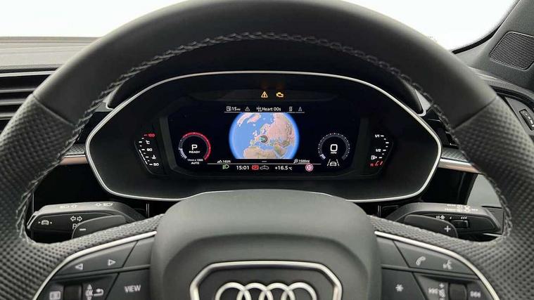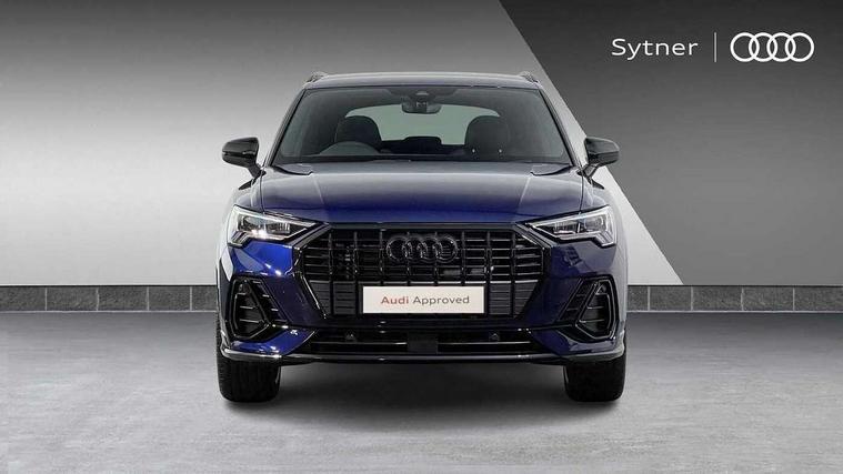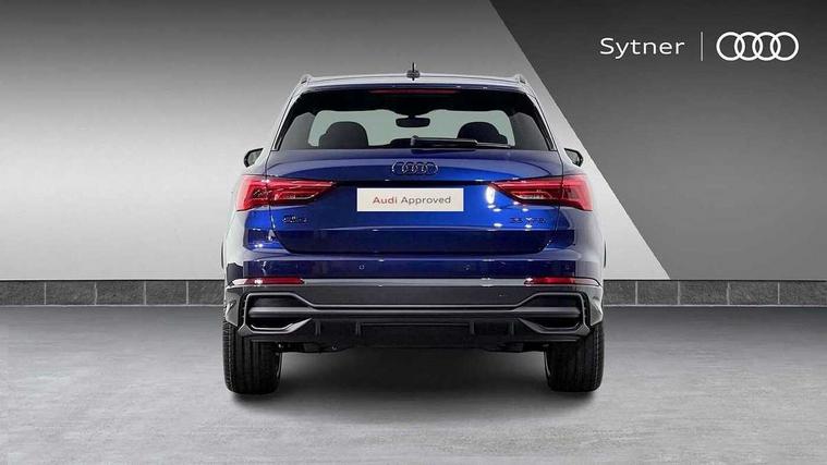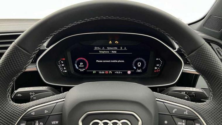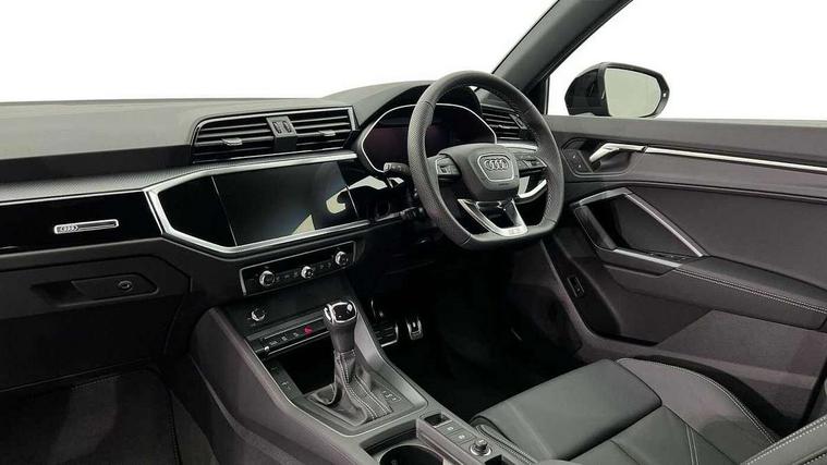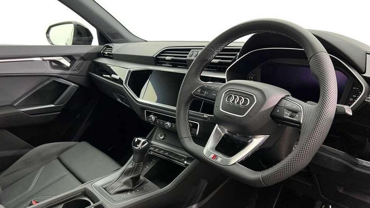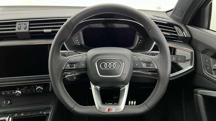 Amazon alexa Integration, Audi connect safety and service, Audi drive select, Audi lane departure warning, Audi smartphone interface includes wireless Apple carplay/Android Auto, Audi Virtual Cockpit - 10.25" display, Bluetooth interface, Camera based traffic sign recognition, Distraction and Fatigue warning, Legal emergency call, MMI Navigation Plus with high resolution 10.1 inch touchscreen colour display, Power operated tailgate, Progressive steering, Service interval indicator, Start stop system with recuperation, Voice control system with natural language interaction, Sports suspension, 2 USB-C ports with charge and data functions, 6 passive loudspeakers, DAB digital radio module, Acoustic windscreen, Audi Beam uses LEDs to project the Audi logo onto the ground as you exit your Q3, Auto dimming door mirrors, Auto dimming frameless rear view mirror, Black roof rails, Electrically folding, adjustable and heated door mirrors with integrated LED side indicators and kerb view function for passenger side, Front and rear electric windows, Front fog lights, Grille vertical bars in aluminium silver/Matt, High gloss black finish B and C pillars, LED Dynamic rear indicators, LED headlights with LED daytime running lights, LED rear lights, LED third brake light, Privacy glass dark tinted rear and rear-side windows (from B-pillar backwards), Rain and light sensors, Rear diffuser grille in grained matt black, Rear diffuser strip in matt anthracite black, Rear side wing doors, Rear wiper, S line bumpers in contrasting Manhattan grey, Variable front intermittent wipers, 12V socket in rear centre console, 3 seat bench in 2nd row, 40:20:40 folding with manual adjustment for 60:40 forwards/backwards position and backrest angle, Adjustable rear seat bench/backrest with centre armrest and cupholder, Black cloth headlining, Dual zone electronic climate control, Electric lumbar support, Front and rear black floor mats with contrast stitching in rock grey, Front and rear headrests, Front centre armrest, Height and reach adjustable steering wheel, Illuminated door sill trims with S logo, ISOFIX child seat mounting for front passenger with airbag deactivation and outer rear seat including top tether attachment point for outer rear seats, Manual front seats with height adjustment, Perforated leather gearknob, Single front passenger seat, Stainless steel luggage compartment sill finisher, Stainless steel pedals, Twin leather upholstery with front sport seats + S embossing, Black styling pack - Q3, Non smoking pack - Q3, 3x3 point rear seatbelts, 6 airbags - Driver, front passenger, curtain and side windows, Audi pre-sense front with pedestrain and cyclist recognition, Electrically operated child locks on rear doors, Electromechanical parking brake, Electronic stabilisation control including ABS, ASR and EDL, Front seatbelt reminder, Hill descent control, Hill hold assist, Pre sense basic, Seatbelt monitoring, Tyre pressure warning, Warning triangle and first aid kit, Anti theft wheel bolts, Immobiliser, Remote central locking, Thatcham approved category 1 anti theft alarm, Aluminium look interior elements, Detail dashboard around MMI touch colour display in glass look, black with surround in aluminium look, Leatherette door armrest, Piano black inlay,