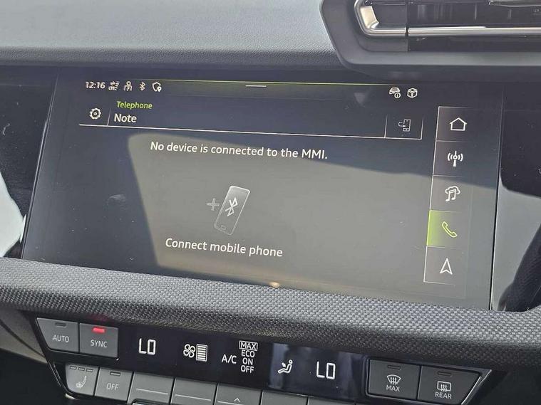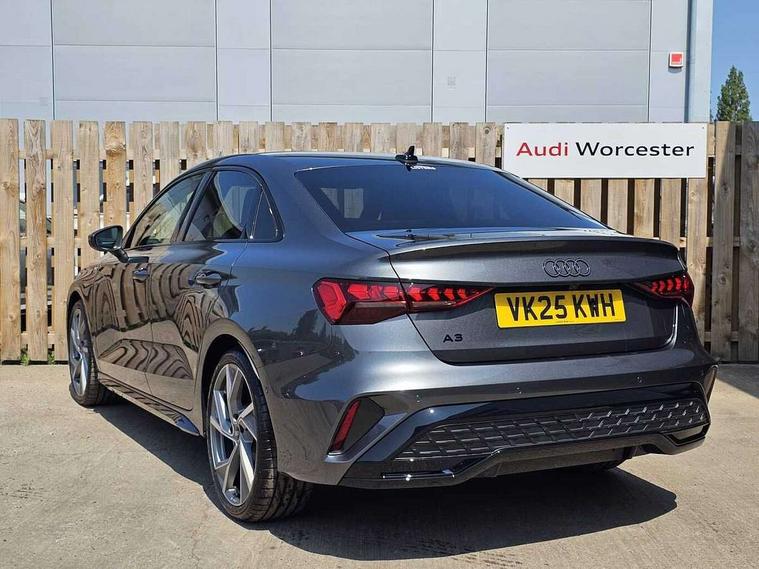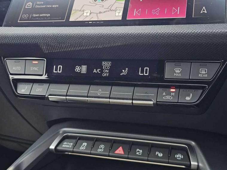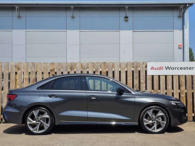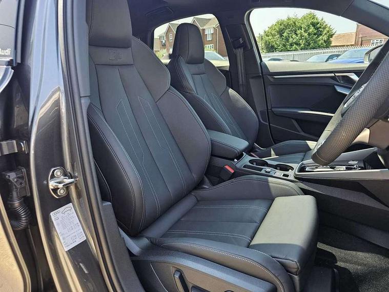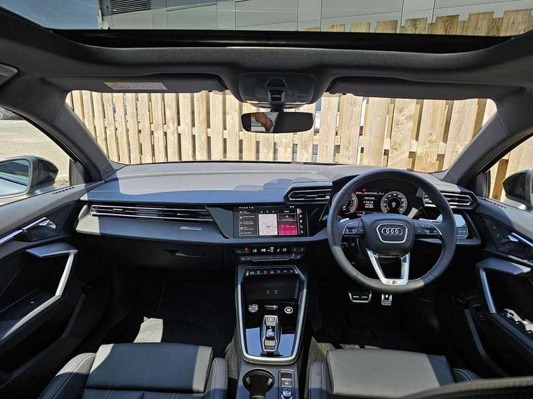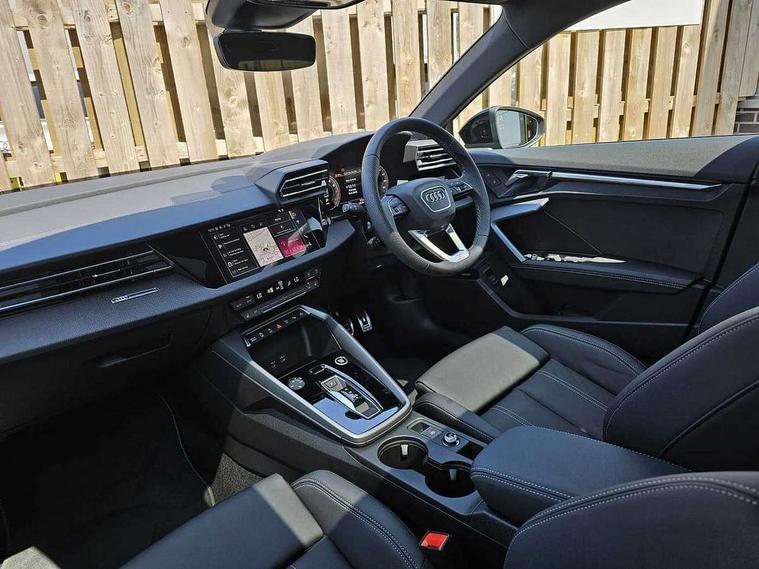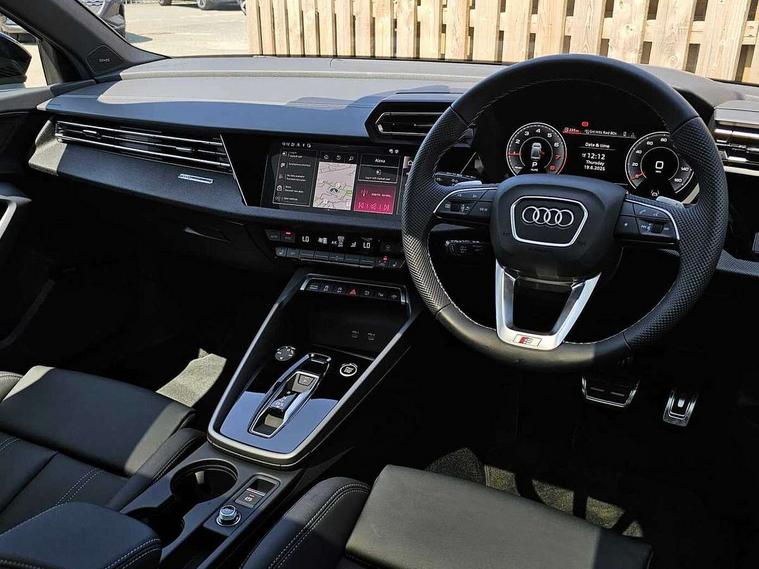 Adjustable speed limiter, Audi drive select, Audi smartphone interface with app store includes wireless Apple carplay, Android auto and Amazon alexa integration, Audi virtual cockpit plus - 12.3" full HD resolution dynamic digital instrument cluster, Automatic start/stop system with recuperation, Bluetooth interface, Camera based traffic sign recognition, Collision avoidance assistant, Cruise control, Distraction and Fatigue warning, e-Call (emergency call), Electromechanical power speed sensitive steering, Emergency assist, Lane departure warning system, MMI Navigation Plus with high resolution 10.1" colour touch screen display, Park Assist with parking system Plus, Service indicator, Trip computer, Voice control system with natural language interaction, Sports suspension, Audi Phonebox light with wireless charging, Audi sound system - 10 loudspeakers including centre loudspeaker and subwoofer, DAB Digital radio, USB ports with charging function in the rear, Acoustic glass windscreen, All weather light, Anthracite grey Audi rings (front and rear), Audi beam uses LEDs to project the Audi logo onto the ground as you exit your A3, Auto dimming frameless rear view mirror, Automatic dynamic range control, Black accents front and rear bumpers, Black accents in the area of the Audi single frame grille, Black accents window trims strips, Dipped beam, main beam, position light and turning light, Electrically adjustable/heated/folding/auto dimming door mirrors with integrated LED indications + kerb view function for passenger side, Exterior model badging, Front and rear side air inlets in grained matt black with dark liquid chrome frame, Front electric windows, Heat insulating glass windscreen, Illuminated door sills with aluminium inserts at the front with S logo, Intersection light, LED 3rd brake light, LED brake lights, LED daytime running x3, LED headlights with LED rear lights and dynamic rear indicators, LED rear number plate lights, LED reverse light, LED tail lights, Light and rain sensors, Manoeuvring light, Motorway light, Privacy glass - dark tinted rear window, rear door and side windows, Rear boot, Rear diffuser and grill in grained matt black with inlay in dark liquid chrome, Rear electric windows, Rear side wing doors, Static Cornering lights, 12V socket and storage compartment in front centre console, 3 seat bench in 2nd row, 3 spoke flat bottomed leather multifunction sport steering wheel with gear shift paddles, 3-zone deluxe automatic air conditioning, 4 way electrically adjustable lumbar support for driver and front passenger, 40/20/40 split folding rear seat bench, Black cloth headlining, Black front and rear floor mats, Front and rear centre armrest in artificial leather with contrasting stitching on armrests and instrument panel, Front and rear headrests, Heated front seats, Height and reach adjustable steering wheel, Manual boot compartment lid, Manually adjustable front seats, Rear centre armrest with cupholder, S badging on the steering wheel, Seat side bolsters, Single front passenger seat, Stainless steel pedals and front footrest in black, Twin leather upholstery with front sports seats S embossed logo, Aluminium interior elements pack - A3, 3x3 point rear seat belts, Driver and front passenger airbag with passenger airbag deactivation, Electronic Stabilisation Control (ESC) including ABS, ASR and EDL, First aid kit with warning triangle and 2 safety vests, Front side airbags with head airbags and interaction airbag, Hill hold assist, Pre-sense front with pedestrian and cyclist detection, Seatbelt monitoring, Tyre pressure loss indicator, Anti theft alarm, Anti-theft wheel bolts, Electronically operated child locks, Immobiliser, Remote central locking with safelock, Black dashboard,