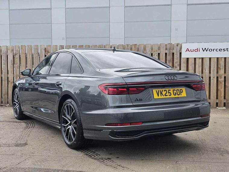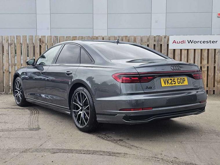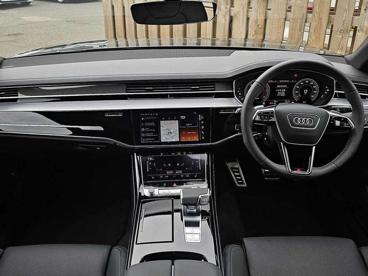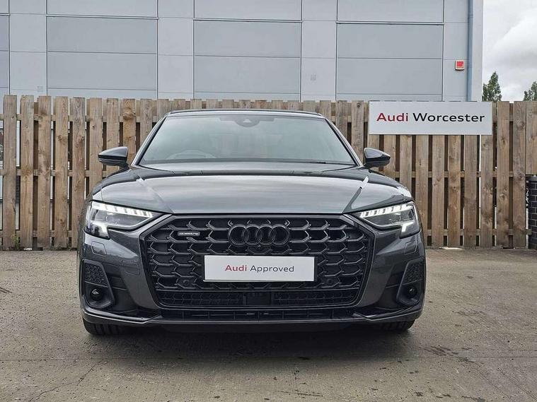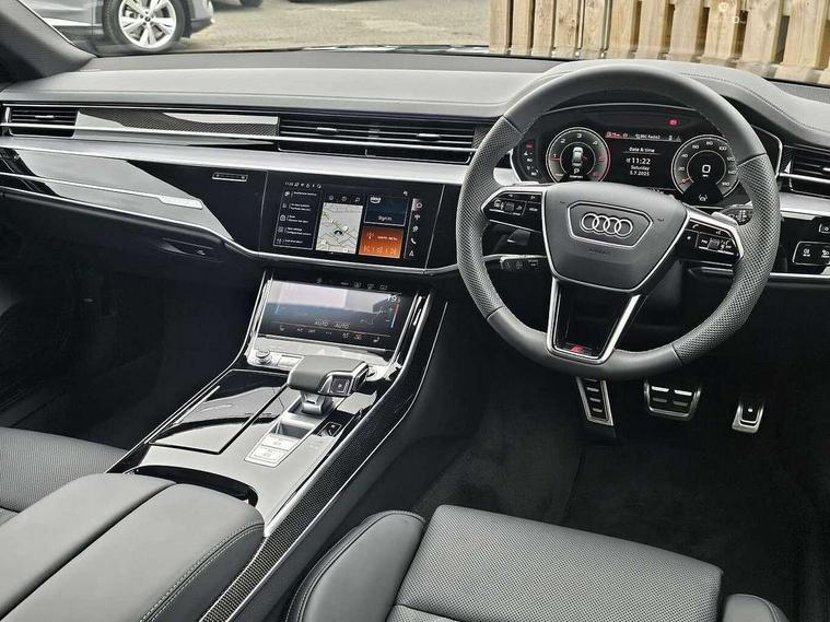 'Lights On' Reminder warning buzzer, Adaptive cruise control with cruise assist, emergency assist, efficiency assist, swerve assist, turn assist and speed limiter, Audi connect safety and service (e-call), Audi drive select, Audi parking system plus with front and rear sensors, Audi smartphone interface with app store includes wireless Apple carplay, Android auto and Amazon alexa integration, Audi virtual cockpit, Bluetooth interface, Camera based traffic sign recognition, Convenience key, Electro - mechanical power assisted steering, Head up Display, MMI navigation plus with MMI touch + Twin touch screens with haptic feedback, Operating buttons in black, glass look with haptic feedback including extended aluminium look, Power door closure, Power operated tailgate, Rear view camera, Remote fuel filler release, Service interval indicator, 24 litre AdBlue tank, 48V Mild hybrid technology, 8 speed transmission with hill hold assist, 82 litre fuel tank, Adaptive air suspension, Diesel particulate filter, Quattro all wheel drive with self locking centre differential, Audi music interface, Audi sound system, DAB digital radio module, MMI radio plus, USB connection, Acoustic double glazing, All-weather, manoeuvring, position, static cornering, turning and motorway lights with automatic dynamic headlight range control, Audi space frame, Auto dimming rear view mirror, Body colour bumpers, Dipped beam, Electric front windows, Electric rear windows with isolation switch, Electric sunblinds for rear window and rear door windows, Electrically adjustable heated folding + automatically dimming exterior mirrors with memory function and integrated LED indicators, Front wash/wipe with interval delay, HD matrix LED headlights with dynamic light presentation and dynamic indicators, Headlight cleaning system, Heat insulating darkened glass in side and rear windows, Heat insulating glass windscreen, Heated rear windscreen, Heated windscreen washer jets, High beam assist, LED brake lights, LED daytime running lights, LED third brake light, OLED rear lights with changeable rear light signature, Privacy glass, Rear boot, Rear side wing doors, Welcome/leaving lighting, 12V socket, 2 zone automatic air conditioning, 3 seat rear bench with centre armrest in 2nd row, 4 way electric lumbar support for driver and front passenger, Audi phone box light, Black cloth headlining, Centre console with cupholders, Comfort centre armrest, Door pockets with bottle holder, Driver and front passenger side sunvisors with illuminated vanity mirrors, Dust/pollen filters, Electric front seats with memory function, Front floor mats, Glove compartment cooling, Heated front seats, Height/reach electric steering column with easy exit function, Illuminated door sill trims with aluminium inlays and S diamond emblem, Isofix child seat mounting points on outer rear seats, Leather gearknob, Passenger footwell storage net, Reading lights, Rear floor mats, Rear headrests, Roof mounted sunglasses holder, Single front passenger seat, Stainless steel pedals and footrest, Upper and lower dashboard, carpet in black, Valcona leather upholstery with front sports seats in diamond quilted with S embossed logo, Black exterior styling pack - A8, Chrome exterior pack - A8, Extended LED Interior multi coloured light pack - A8, 3 point seatbelts on all rear seats, ABS/EBD, Active front headrest system, ASR traction control, Audi pre sense basic, Audi pre sense front, Black brake calipers, Driver/Front Passenger airbags, EDL traction control, Electromechanical parking brake, ESP, Extended pedestrian protection measures, Front and rear disc brakes, Front and rear side airbags with head airbag system, Front passenger airbag deactivation, Rear child proof door locks, Seatbelt reminder + electric contact in buckle + advanced safety equipment, Tyre pressure loss indicator, Warning triangle and first aid kit, Anti theft alarm tow away protection, Anti-theft wheel bolts and wheel loosening detection, Remote central locking, Carbon vector upper inlays, Dark matt brushed aluminium lower inlays,