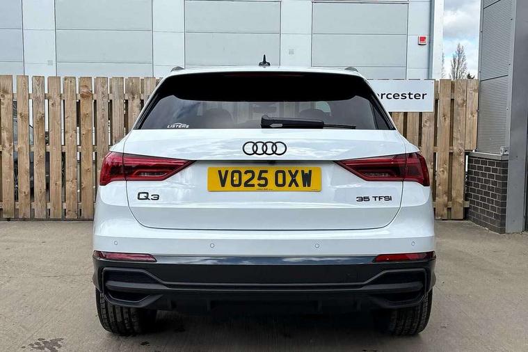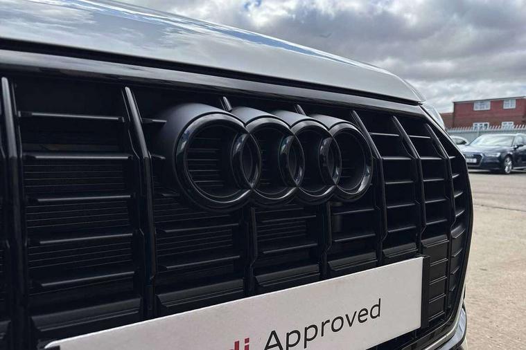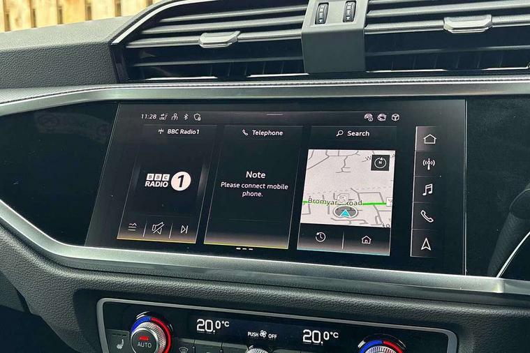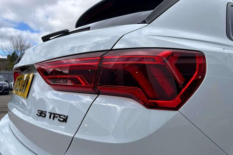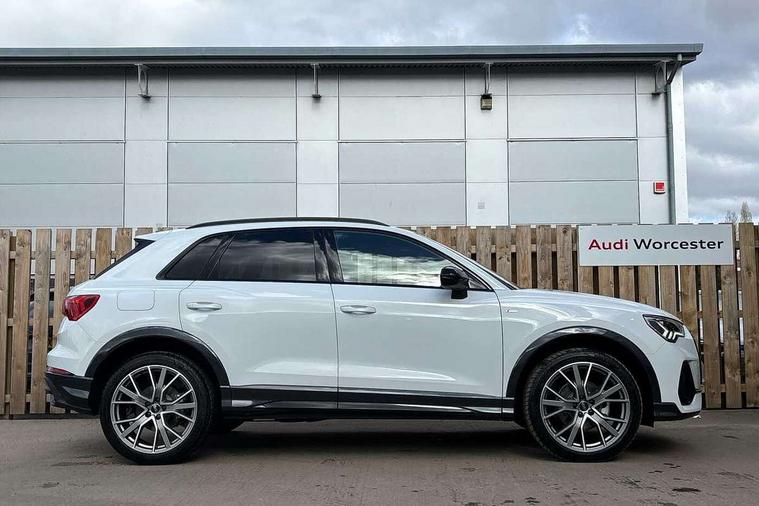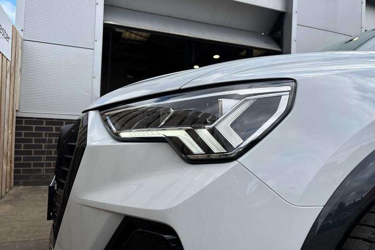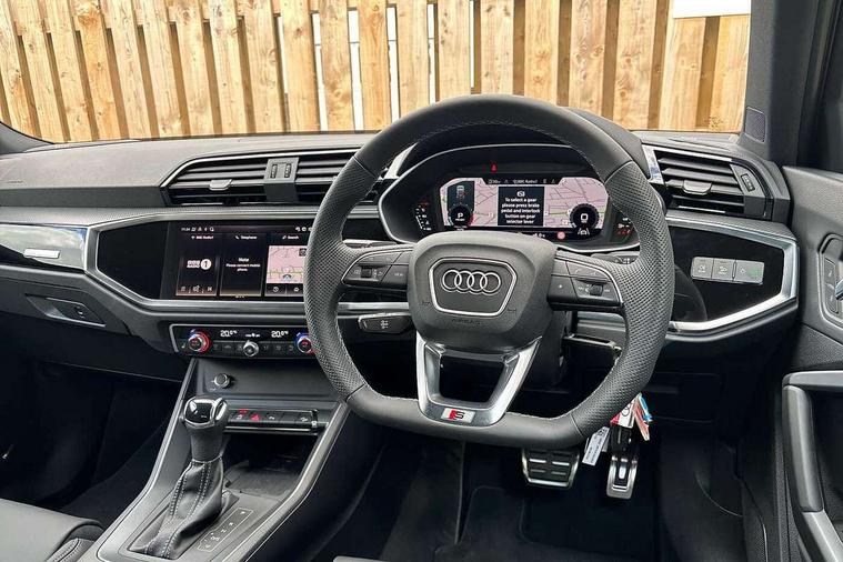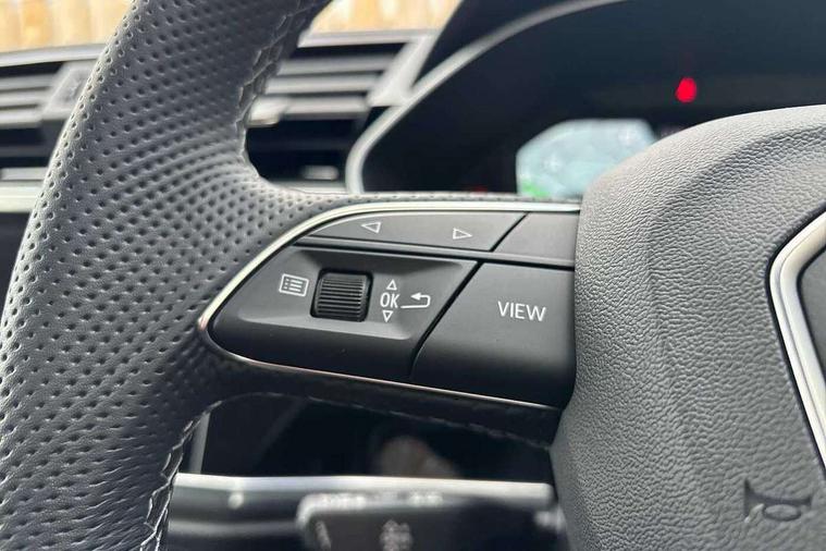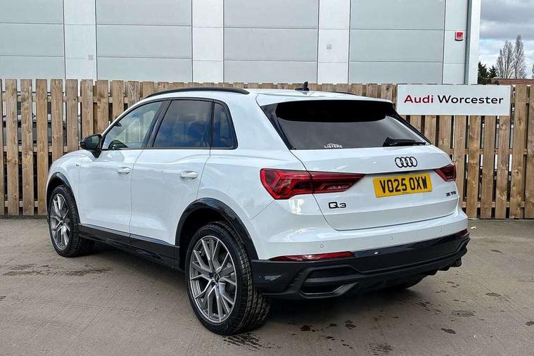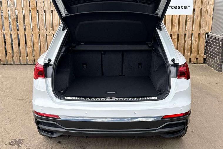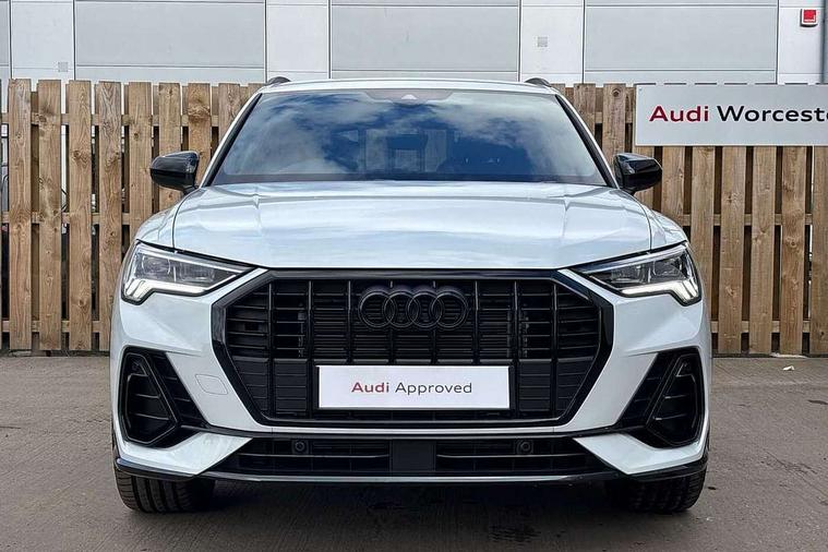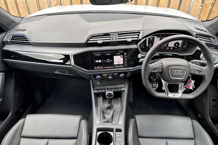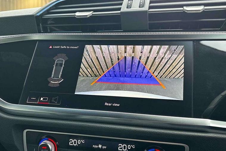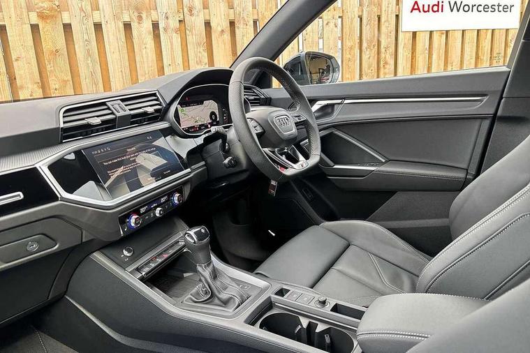 Amazon alexa Integration, Audi connect safety and service, Audi drive select, Audi lane departure warning, Audi smartphone interface includes wireless Apple carplay/Android Auto, Audi Virtual Cockpit - 10.25" display, Bluetooth interface, Camera based traffic sign recognition, Distraction and Fatigue warning, Legal emergency call, MMI Navigation Plus with high resolution 10.1 inch touchscreen colour display, Power operated tailgate, Progressive steering, Service interval indicator, Start stop system with recuperation, Voice control system with natural language interaction, Sports suspension, 2 USB-C ports with charge and data functions, 6 passive loudspeakers, DAB digital radio module, Acoustic windscreen, Audi Beam uses LEDs to project the Audi logo onto the ground as you exit your Q3, Auto dimming door mirrors, Auto dimming frameless rear view mirror, Black roof rails, Electrically folding, adjustable and heated door mirrors with integrated LED side indicators and kerb view function for passenger side, Front and rear electric windows, Front fog lights, Grille vertical bars in aluminium silver/Matt, High gloss black finish B and C pillars, LED Dynamic rear indicators, LED headlights with LED daytime running lights, LED rear lights, LED third brake light, Privacy glass dark tinted rear and rear-side windows (from B-pillar backwards), Rain and light sensors, Rear diffuser grille in grained matt black, Rear diffuser strip in matt anthracite black, Rear side wing doors, Rear wiper, S line bumpers in contrasting Manhattan grey, Variable front intermittent wipers, 12V socket in rear centre console, 3 seat bench in 2nd row, 40:20:40 folding with manual adjustment for 60:40 forwards/backwards position and backrest angle, Adjustable rear seat bench/backrest with centre armrest and cupholder, Black cloth headlining, Dual zone electronic climate control, Electric lumbar support, Front and rear black floor mats with contrast stitching in rock grey, Front and rear headrests, Front centre armrest, Height and reach adjustable steering wheel, Illuminated door sill trims with S logo, ISOFIX child seat mounting for front passenger with airbag deactivation and outer rear seat including top tether attachment point for outer rear seats, Manual front seats with height adjustment, Perforated leather gearknob, Single front passenger seat, Stainless steel luggage compartment sill finisher, Stainless steel pedals, Twin leather upholstery with front sport seats + S embossing, Black styling pack - Q3, Non smoking pack - Q3, 3x3 point rear seatbelts, 6 airbags - Driver, front passenger, curtain and side windows, Audi pre-sense front with pedestrain and cyclist recognition, Electrically operated child locks on rear doors, Electromechanical parking brake, Electronic stabilisation control including ABS, ASR and EDL, Front seatbelt reminder, Hill descent control, Hill hold assist, Pre sense basic, Seatbelt monitoring, Tyre pressure warning, Warning triangle and first aid kit, Anti theft alarm, Anti theft wheel bolts, Immobiliser, Remote central locking, Aluminium look interior elements, Detail dashboard around MMI touch colour display in glass look, black with surround in aluminium look, Leatherette door armrest, Piano black inlay,
