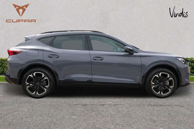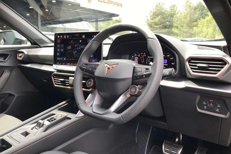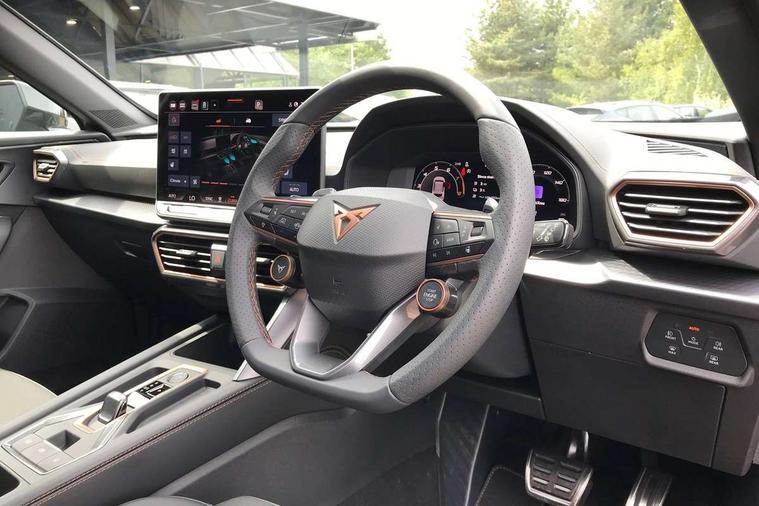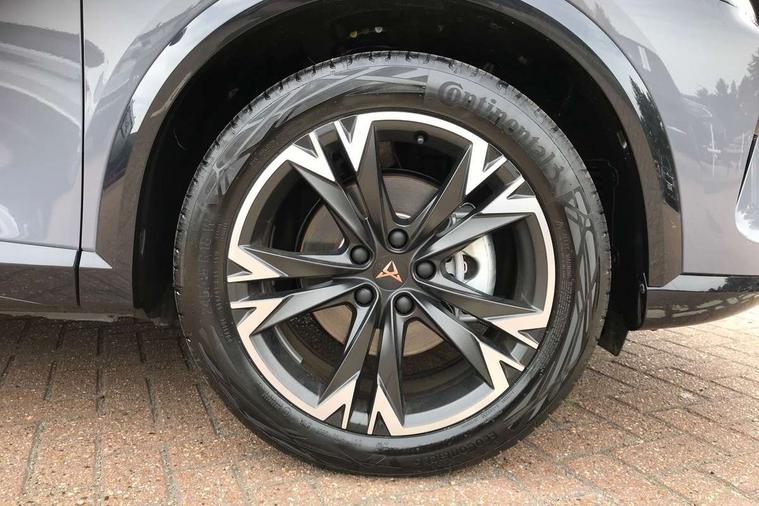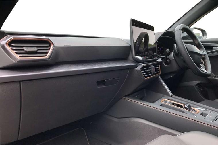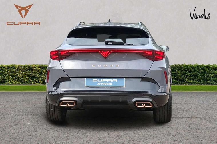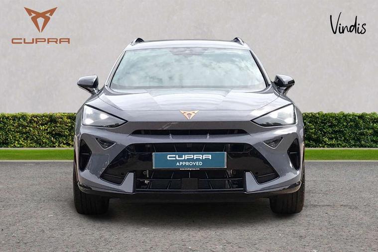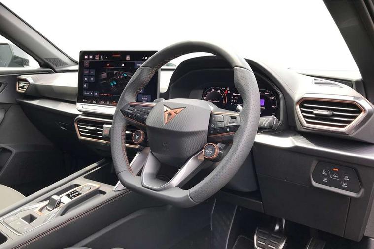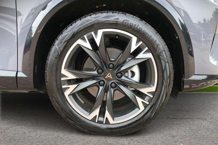 10.25" digital cockpit and configurable dashboard, Adaptive cruise control with follow-to-stop and speed limiter, Advanced driver alert system, Driving profile selection, Dynamic road sign display, Emergency steering support with turn assist, Forward collision warning with automatic braking, Front and rear parking sensors, Front cross traffic assist, Full link phone integration, Lane assist, Progressive steering, RPM, trip computer, outside temp gauge, instrument light brightness, low fuel warning light, lights on reminder, gearshift indicator, Service interval indicator, Start/stop system with regenerative braking, Voice control system, Wired Android Auto, Wireless apple carplay, Wireless phone charger, 10 amp mode 2 charging cable, 32 amp mode 3 charging cable, CUPRA sport suspension, Electronic locking differential and dynamic traction support, 2 front and 2 rear USB type C sockets, 7 speakers, Media system with navigation, 12.9" touchscreen display, voice control, DAB, steering wheel mounted controls, Auto dimming rear view mirror, Body colour door handles, Body coloured bumpers, Dark grey wing mirror, Daytime running light with automatic headlight control and coming home feature, Door panel ambient lighting, Dynamic headlight range control, Electric front/rear windows, Electrically adjustable, heated and folding door mirrors, Gloss black roof rails and window surrounds, High beam assist, LED 3rd brake light, LED front fog lamps with cornering function, LED Headlights, LED Taillights with dynamic indicator, Rain sensing wipers, Rear diffuser with copper simulated exhaust pipes, Rear fog lights, Rear side wing doors, Rear wash/wipe, Tinted rear windows, Welcome lights (within exterior mirror housing), 12V socket, 2 front and 2 rear reading lights, 3 seat bench in 2nd row, 60/40 split rear bench seat with armrest and mechanical seat release, Black headlining, Black interior roof lining, Cupra sports pedals, Dust/pollen filter, Front and rear head restraints, Front centre armrest, Heated supersports multifunction leather steering wheel with satellite buttons and gear shift paddles, Height/reach adjust steering wheel, Illuminated aluminium doorsteps, Illuminated interior front door sills, Illuminated sunvisor with mirror, Interior ambient lighting, Isofix, Manually adjustable height and lumbar support for front seats, PVC/Cloth upholstery with copper stitching + Sport seats, Satellite steering wheel, Single front passenger seat, Storage pockets on rear of front seats, Three zone climate control with control panel in rear, 3 point seatbelts on all rear seats, ABS, Brake control system - ESC and brake booster, Child proof door locks, Driver and front passenger airbags with front passenger airbag de-activation, Electronic parking brake, Front and rear disc brakes, Front side curtain airbags, Hill hold control, Public e-call, Seat belt reminder for front and rear seats, Tyre pressure monitoring system, Anti theft alarm system, Central locking system Keyless Go, Locking wheel bolts, Warranty - 5 years/90, 000 miles, Copper and aluminium interior detailing, 18" Sonora machined silver alloy wheels, Breakdown and tool kit,