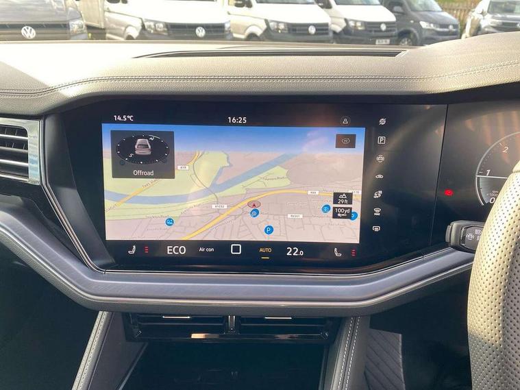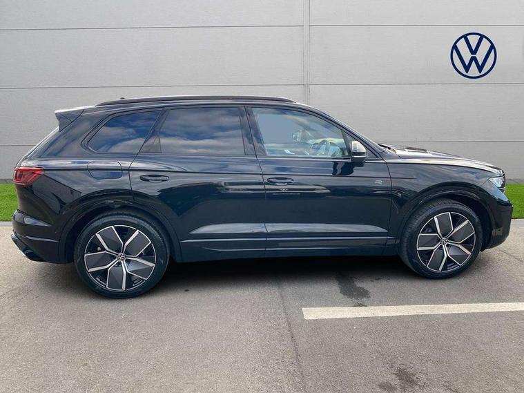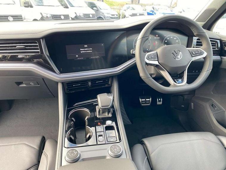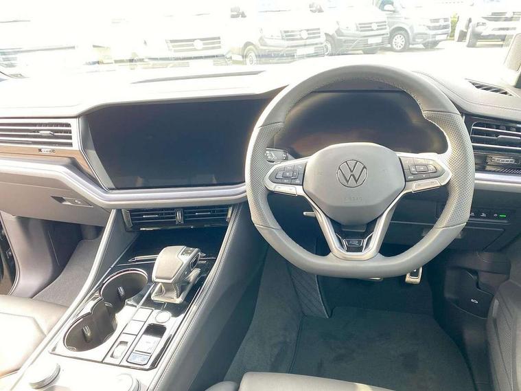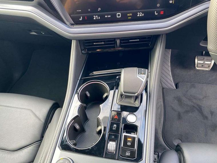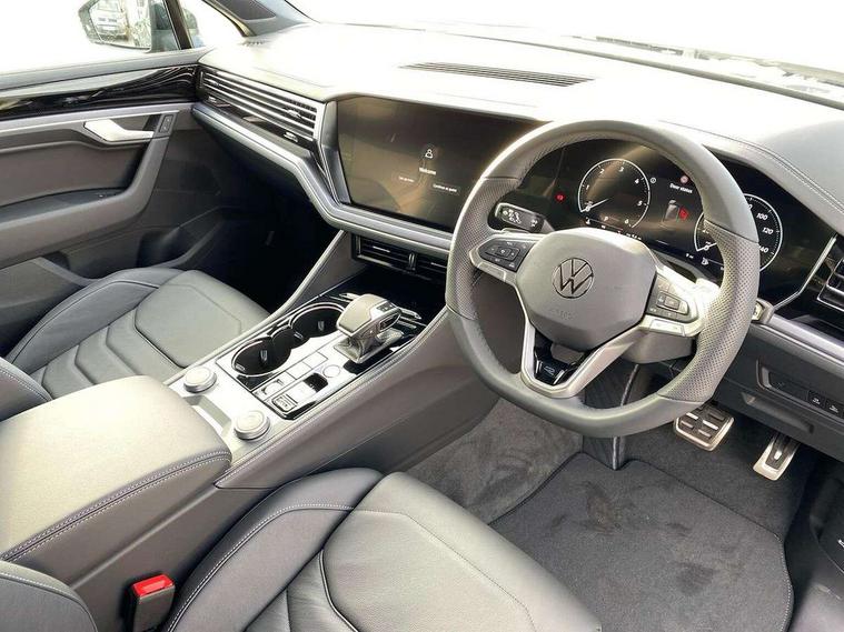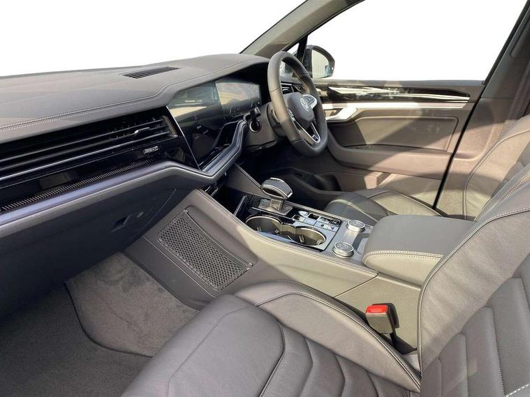 15" Screen Top infotainment system Premium (MIB3), Adaptive cruise control, Advanced driver attention and drowsiness monitor, Driver profile selection, Dynamic road sign display, E-Sim card for online connectivity, eCall emergency system, Innovision cockpit, Intelligent park assist, Mobile phone interface with inductive charging, Multi-colour Active Info display, Park Assist - Sensor controlled steering aid to assist parallel or bay parking, PAS, Warning signal and warning light for front and rear seatbelts not fastened, Wireless app connect, Adaptive chassis control, DAB Digital radio, Diversity antenna for AM/ FM reception, We Connect and We Connect Plus functionality, Automatic coming/leaving home lighting function, Automatic headlights, Black door mirrors, Black style comfort bumpers, Dynamic headlight range control with dynamic cornering light, Electric front tilt/slide panoramic sunroof and fixed rear sunroof, Electrically power adjustable, heated, folding, auto dimming, front passenger exterior door mirror lowering function, External USB type C socket and charging sockets, Gloss black roof rails, HD LED Matrix beam plus digital headlight projection with variable light distribution, Headlight washers, Highway light, LED 3rd brake light, LED daytime running lights, LED rear combination lamp with variable lighting functions and special styling, Poor weather light, Rain sensor, Rear exhaust tailpipe, Rear fog light with back up light on both sides, Rear light bar and illuminated logo, Rear side wing doors, Rear wiper, Stainless steel door sill protection, 12V socket in centre console, 3 rear headrests, 3 seat bench in 2nd row, 4 zone climate control, Airbag label on sun visor and B-pillar, Brushed stainless steel pedals, Double sun visors with illuminated vanity mirrors, Front + rear carpet mats, Front centre armrest, Leather wrapped multifunction sports steering wheel, heated, with touch control and shift paddles, Mechanical rear seat release, Power adjustable lumbar support in front, Power seats in front, right side with memory features and seat cushion depth adjustment, Rear seat backrest and split folding with center armrest, Single front passenger seat, Memory pack plus - Touareg, 3 point seatbelts, outer rear with ECE lable, ABS, Child locks on rear doors, Curtain airbags, Driver and front passenger safety-optimised head restraints, Driver/Front Passenger airbags, Extended pedestrian protection measures, Front assist, Front seat side impact airbags, Generative braking with start and stop system, Height adjustable 3 point front seatbelts with pre tensioners, Passenger airbag deactivate switch, Three 3 point rear seatbelts, Two tone horn, Tyre pressure loss indicator, Warning triangle and first aid kit, Alarm system with interior protection, Easy open and close sensor controlled luggage compartment opening and closing with remote unlocking, Keyless Access Keyless locking and starting system with SAFELOCK, Aluminium decorative inserts, Black decorative trims, Gloss black decorative inserts in centre console, Tool kit,