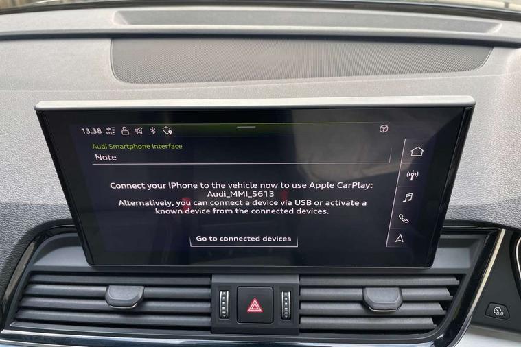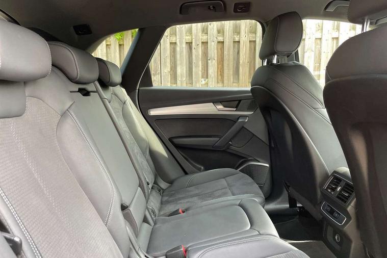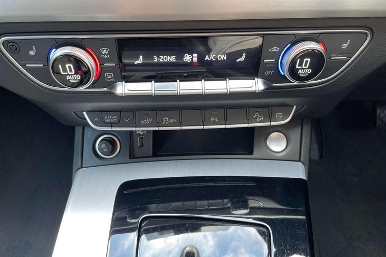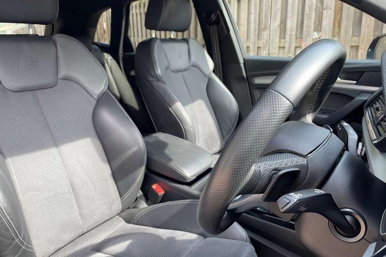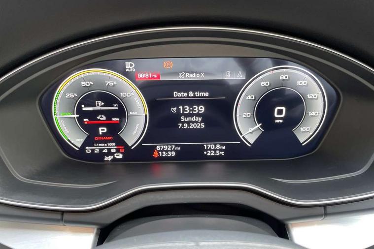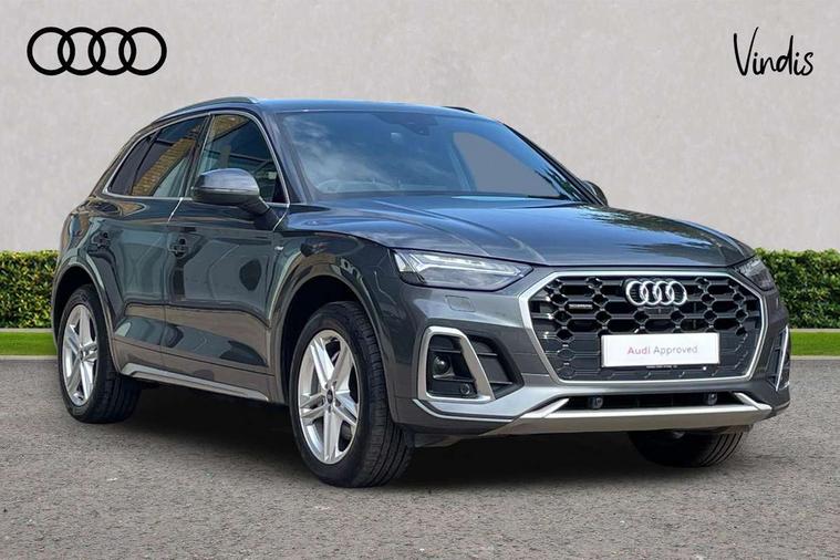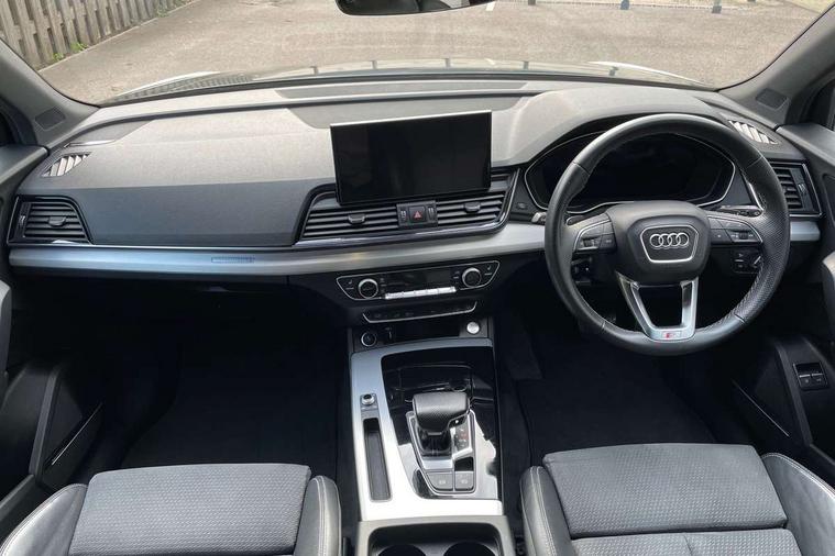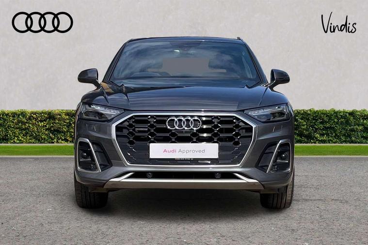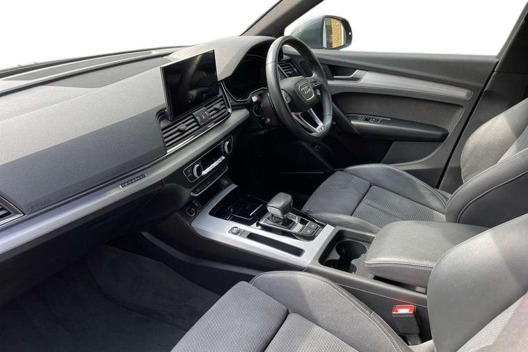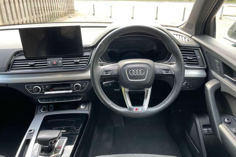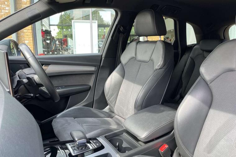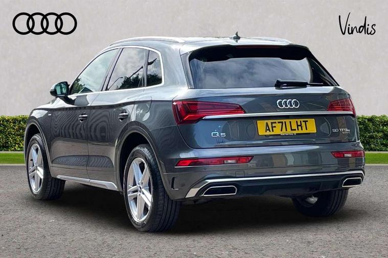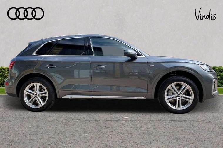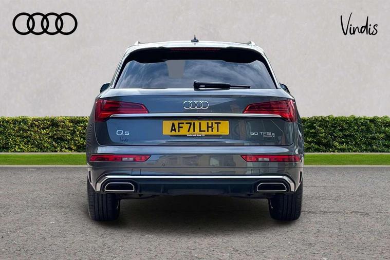 Audi connect safety and service (e-call), Audi connect with Amazon Alexa Integration, Audi drive select, Audi virtual cockpit plus with 12.3" screen and three different layout designs, Audi wireless smartphone interface, Automatic start-stop system with coasting functionality and efficiency programme, Bluetooth interface, Electro - mechanical power assisted steering, MMI navigation plus with 10.1" touch screen, Power tailgate, Reversing camera, Service interval indicator, Voice control system with Audi hotword activation "Hey Audi", 3 pin 10 amp domestic charging cable, Dynamic suspension, Quattro on demand, Type 2 mode 3 22kW 32 amp charging cable, Type 2 socket for AC charging, 2 x USB charging port with aux input socket, DAB Digital radio, Acoustic windscreen, Aluminium roof rails, Audi matrix LED headlights with dynamic front and rear indicators, Auto dimming rear view mirror, Automatic headlights and windscreen wipers, Body colour bumpers, Body colour door mirrors, Body colour rear diffuser with matt aluminium silver surrounds, Body colour underbody protection, Chrome plated exhaust trims, Door sills in Selenite silver, Electric adjustable/heated/folding door mirrors, Front air inlet surrounds in aluminium, Front and rear electric windows, Front radiator grille in honeycomb design, Headlight washers, Lower bumpers painted in contrast Manhattan grey, Rear chrome trim strip below lights, Rear privacy glass and rear side windows, Rear spoiler, Rear wiper, Roof bars, S Line badges on the front wings, S Line front and rear bumpers, S Line side skirts, 3 rear headrests, 40:20:40 split folding rear seat with rear centre armrest, Black cloth headlining, Comfort front centre armrest, Contrast stitching on seats, steering wheel and gear lever gaiter, Deluxe 3 zone electronic climate control, Front/rear floor mats, Gear lever in black leather, Heated front seats, Height adjustable front head restraints, Height/reach adjustable steering column, Illuminated door sill trims with S logo, ISOFIX child seat mounting and top tether, Manual seat adjustment with 4-way electric lumbar support, Rear seat bench plus, Sunvisors with vanity mirrors, Trunk roller cover, High gloss pack - Q5, LED interior light pack - Q5, 3 point seatbelts on all seats, 6 airbags - Driver, front passenger, curtain and side airbags, Electrically operated child locks on rear doors, Electromechanical parking brake, Electronic stabilisation control including ABS, ASR and EDL, Front passenger airbag deactivation, Hill descent control, Hill hold assist, Multi collision brake assist, Pop-up bonnet for pedestrian protection, Pre sense city, Seat belt force limiter, Seatbelt monitoring, Tyre pressure warning, Warning triangle and first aid kit, Anti theft alarm, Anti-theft wheel bolts, Keyless Go access/ignition system, Matt brushed aluminium inlays, Tool kit, Tyre repair kit,