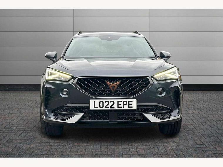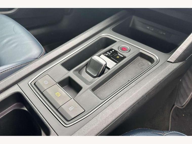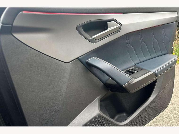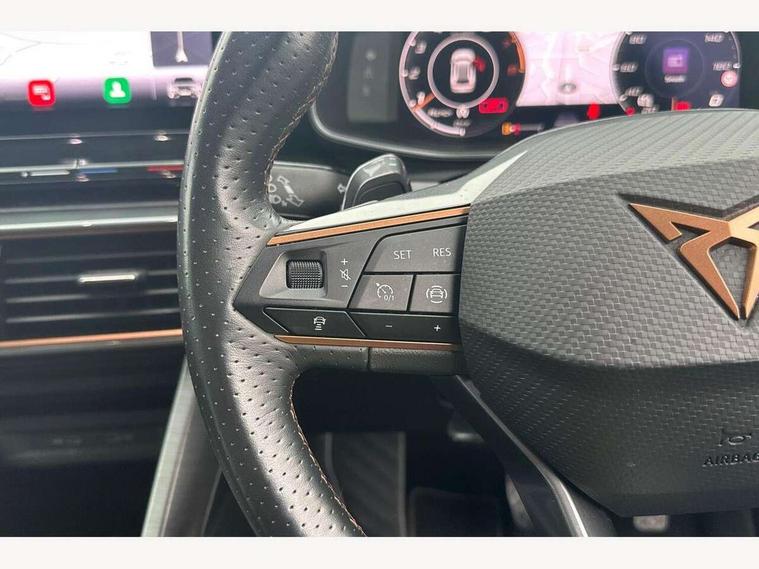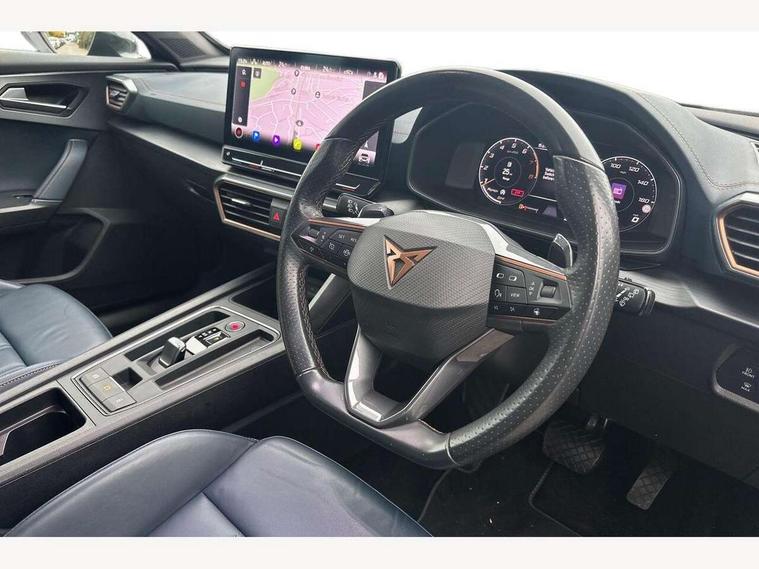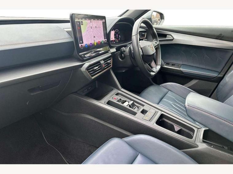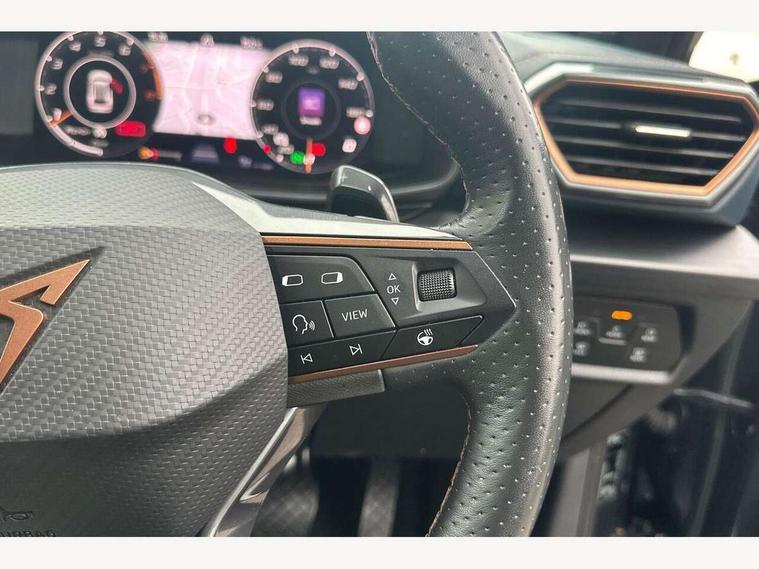 Digital cockpit and configurable dashboard, Driver alert system, Driving profile selection, E-call, Forward collision warning with automatic braking, Lane assist, Navigation system with 12'' Touchscreen Display, Park assist (inc front/rear parking sensors), PAS, Predictive adaptive cruise control with speed limiter, Rear view camera, RPM, trip computer, outside temp gauge, instrument light brightness, low fuel warning light, lights on reminder, gearshift indicator, Service interval indicator, Start/stop system with regenerative braking, Voice control system, Wireless apple carplay, Wireless phone charger, Electronic locking differential and dynamic traction support, Standard suspension, 2 front and 2 rear USB type C sockets, Auxiliary input socket, DAB radio, Auto dimming rear view mirror, Body colour door handles, Body coloured bumpers, Dark grey wing mirror, Daytime running light with automatic headlight control and coming home feature, Dynamic headlight range control, Electric front/rear windows, Electrically adjustable heated and folding door mirrors with memory function, Front fog lamps with cornering function, Gloss black roof rails and window surrounds, LED Headlights, LED Taillights with dynamic indicator, Rain sensing wipers, Rear diffuser with black simulated exhaust pipes, Rear side wing doors, Rear wash/wipe, Third brake light, Tinted rear windows, Welcome lights, 12v power supply in centre console, 12V socket, 12v socket in loadspace, 2 front and 2 rear reading lights, 230V socket, 3 seat bench in 2nd row, 60/40 split rear bench seat with armrest and mechanical seat release, Dust/pollen filter, Front and rear head restraints, Front centre armrest, Height/reach adjust steering wheel, Illuminated interior front door sills, Illuminated sunvisor with mirror, Isofix, Leather multi function heated steering wheel with gear shift paddles, Luggage tie-down hooks, Single front passenger seat, Three zone climate control with control panel in rear, Variable luggage/load compartment floor, Wraparound lighting, Genuine Nappa leather Pack - Cupra, 3 point seatbelts on all rear seats, ABS, Brake control system - ESC and brake booster, Child proof door locks, Driver and front passenger airbags with front passenger airbag de-activation, Electronic parking brake, Front and rear disc brakes, Front side curtain airbags, Hill hold control, Seat belt reminder for front and rear seats, Tyre pressure monitoring system, Anti theft alarm system, Keyless entry and start system (KESSY), Locking wheel bolts, Copper and aluminium interior detailing, 19" 'Exclusive' machined sport matte black and silver alloy wheels,