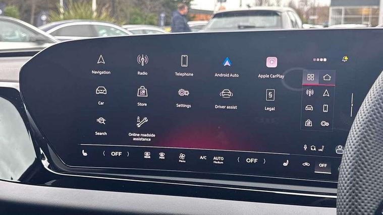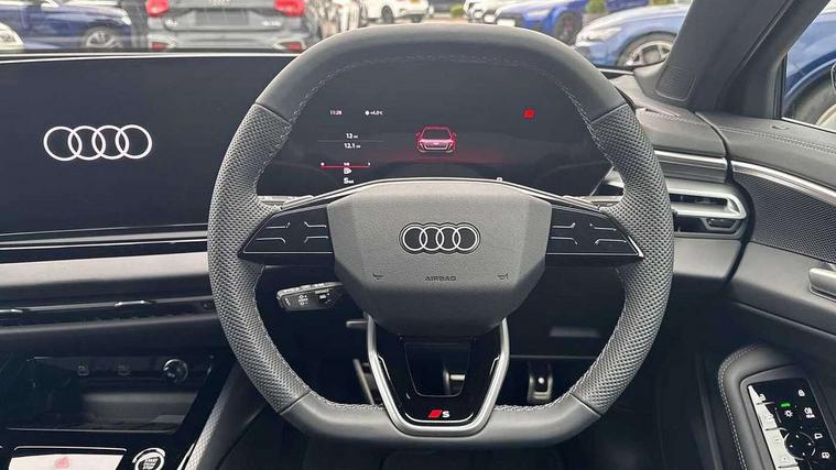 Adaptive cruise control, Advanced driver attention and fatigue montior, Audi application store, Audi assistant, Audi connect emergency call and service, Audi drive select, Audi smartphone interface, Audi virtual cockpit plus with 11.9" OLED colour display, Automatic start/stop system with coasting functionality, Camera based traffic sign recognition, Intersection assist, Lane departure warning, MMI navigation plus with high resolution 14.5" OLED touchscreen colour display, Park assist plus, Parking system plus with 360 display, Progressive steering with servotronic, Rear view camera, Swerve assist and turn assist, Traffic sign based speed limiter, Sports suspension lowered by 20mm, 2 USB-C ports in both the front and rear, Audi sound system impressive sound with 10 loudspeakers including centre speaker and subwoofer, 6-channel amplifier with a total output of 180 watts, DAB digital radio reception, Smartphone compartment with wireless charging, Aluminium roof rails, Aluminium window trims, Auto dimming rear view mirror, Body colour door mirrors, Door mirrors - electrically adjustable, heated, folding and auto dimming on both sides, Front and rear electric windows, Front door sill trims with aluminium inlays, illuminated with 'S' logo, High beam assist, LED headlights Plus incl. digital daytime running lights, turning light, all-weather light, motorway light, manouevring light and intersection light, LED rear lights pro incl. dynamic rear indicators and illuminated light strip with animated coming and leaving home function, LED third brake light, Privacy glass, Rear and side windows with heat insulating glass, Rear side wing doors, Rear wash/wipe, S Line badges on the front wings, S line bumpers, radiator grille and diffuser in phantom black and diffuser insert in matt anthracite, White rhombus logo projection light in exterior mirrors, Windscreen with acoustic glazing, 3 rear headrests, 3 seat rear bench, 3 spoke leather steering wheel with multi-function buttons with touch control, flattened on top and bottom, with S badging and contrast stitching, 3-zone automatic climate control, 40:20:40 split folding rear seat bench with centre armrest and cup holders, Comfort front centre armrest, Front and rear floor mats, Front seats with manual adjustment for position and 4-way electric lumbar support, Front sport seats with integrated headrest and S embossed logo, Headlining in black cloth, Heated front seats, i-Size child seat mounting on the front passenger side and outer rear seats, i-Size and top tether on the outer rear seats, Luggage compartment lid, electrically opening and closing, Manual steering column height and depth adjustment, Single front passenger seat, Stainless steel pedals and footrest, Steering wheel grips in perforated leather and shift paddles, Ambient lighting package plus - A5, 3x3 point rear seat belts, Driver airbag, Electric child safety locks, First aid kit with warning triangle and vests, Front emergency brake assist, Front passenger airbag, Front passenger airbag deactivation, Front side airbags with head airbag system and front interaction airbag, Hill hold assist, Seat belt monitoring with rear seat occupant reminder, Tyre pressure loss indicator, Anti theft alarm, Anti-theft wheel bolts, Keyless Go, Accent surfaces and control buttons in gloss black, Black dashboard with contrast stitching, Inlays in matt brushed aluminium with linear embossing, anthracite, Softwrap in leatherette with contrast stitching, Upper and lower interior elements in leatherette, Tyre repair kit,