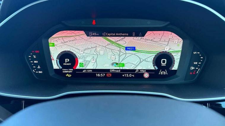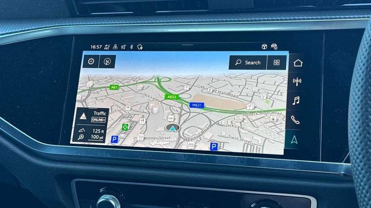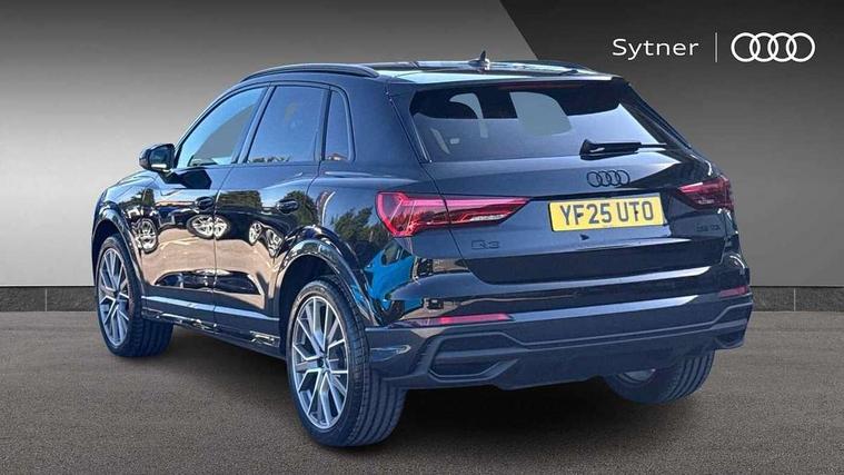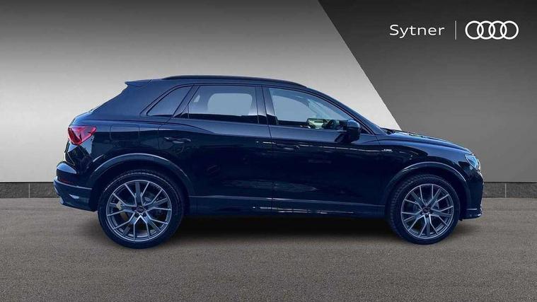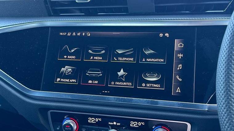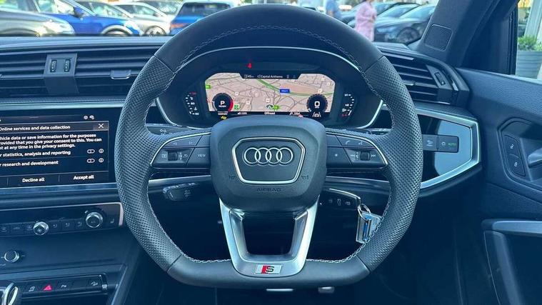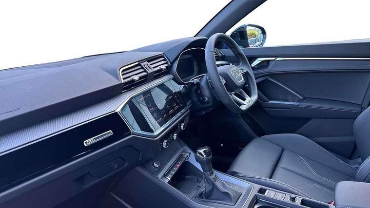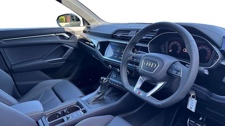 Amazon alexa Integration, Audi connect safety and service, Audi drive select, Audi lane departure warning, Audi Virtual Cockpit - 10.25" display, Bluetooth interface, Camera based traffic sign recognition, Distraction and Fatigue warning, Legal emergency call, MMI Navigation Plus with high resolution 10.1 inch touchscreen colour display, Power operated tailgate, Progressive steering, Service interval indicator, Smartphone interface includes wireless Apple carplay/Android Auto, Start stop system with recuperation, Voice control system with natural language interaction, Diesel particulate filter, Sports suspension, 2 USB-C ports with charge and data functions, 6 passive loudspeakers, DAB digital radio module, Acoustic windscreen, Audi Beam uses LEDs to project the Audi logo onto the ground as you exit your Q3, Auto dimming door mirrors, Auto dimming frameless rear view mirror, Black roof rails, Electrically folding, adjustable and heated door mirrors with integrated LED side indicators and kerb view function for passenger side, Front and rear electric windows, Front fog lights, Grille vertical bars in aluminium silver/Matt, High gloss black finish B and C pillars, LED Dynamic rear indicators, LED headlights with LED daytime running lights, LED rear lights, LED third brake light, Privacy glass dark tinted rear and rear-side windows (from B-pillar backwards), Rain and light sensors, Rear diffuser grille in grained matt black, Rear diffuser strip in matt anthracite black, Rear side wing doors, Rear wiper, S line bumpers in contrasting Manhattan grey, Variable front intermittent wipers, 12V socket in rear centre console, 3 seat bench in 2nd row, 40:20:40 folding with manual adjustment for 60:40 forwards/backwards position and backrest angle, Adjustable rear seat bench/backrest with centre armrest and cupholder, Black cloth headlining, Dual zone electronic climate control, Electric lumbar support, Front and rear black floor mats with contrast stitching in rock grey, Front and rear headrests, Front centre armrest, Height and reach adjustable steering wheel, Illuminated door sill trims with S logo, ISOFIX child seat mounting for front passenger with airbag deactivation and outer rear seat including top tether attachment point for outer rear seats, Manual front seats with height adjustment, Perforated leather gearknob, Single front passenger seat, Stainless steel luggage compartment sill finisher, Stainless steel pedals, Twin leather upholstery with front sport seats + S embossing, Black styling pack - Q3, Non smoking pack - Q3, 3x3 point rear seatbelts, 6 airbags - Driver, front passenger, curtain and side windows, Audi pre-sense front with pedestrain and cyclist recognition, Electrically operated child locks on rear doors, Electromechanical parking brake, Electronic stabilisation control including ABS, ASR and EDL, Front seatbelt reminder, Hill descent control, Hill hold assist, Pre sense basic, Seatbelt monitoring, Tyre pressure warning, Warning triangle and first aid kit, Anti theft wheel bolts, Immobiliser, Remote central locking, Thatcham approved category 1 anti theft alarm, Aluminium look interior elements, Detail dashboard around MMI touch colour display in glass look, black with surround in aluminium look, Leatherette door armrest, Piano black inlay,