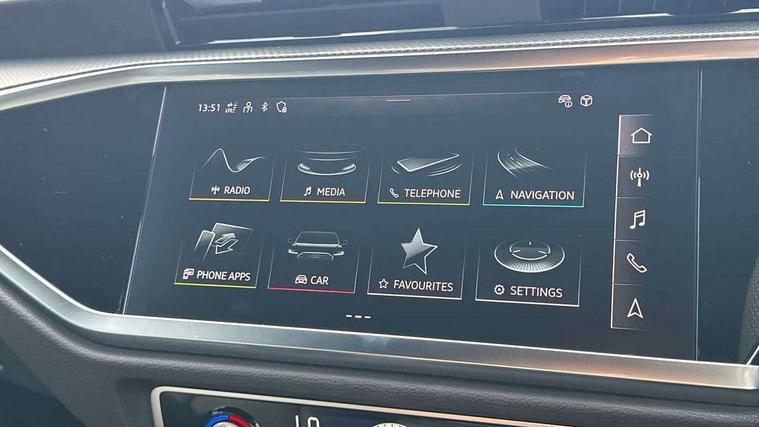 Amazon alexa Integration, Audi connect safety and service, Audi drive select, Audi lane departure warning, Audi smartphone interface includes wireless Apple carplay/Android Auto, Audi Virtual Cockpit - 10.25" display, Bluetooth interface, Camera based traffic sign recognition, Distraction and Fatigue warning, Legal emergency call, MMI Navigation Plus with high resolution 10.1 inch touchscreen colour display, Power operated tailgate, Progressive steering, Service interval indicator, Start stop system with recuperation, Voice control system with natural language interaction, Sports suspension, 2 USB-C ports with charge and data functions, 6 passive loudspeakers, DAB digital radio module, Acoustic windscreen, Audi Beam uses LEDs to project the Audi logo onto the ground as you exit your Q3, Auto dimming door mirrors, Auto dimming frameless rear view mirror, Black roof rails, Electrically folding, adjustable and heated door mirrors with integrated LED side indicators and kerb view function for passenger side, Front and rear electric windows, Front fog lights, Grille vertical bars in aluminium silver/Matt, High gloss black finish B and C pillars, LED Dynamic rear indicators, LED headlights with LED daytime running lights, LED rear lights, LED third brake light, Privacy glass dark tinted rear and rear-side windows (from B-pillar backwards), Rain and light sensors, Rear diffuser grille in grained matt black, Rear diffuser strip in matt anthracite black, Rear side wing doors, Rear wiper, S line bumpers in contrasting Manhattan grey, Variable front intermittent wipers, 12V socket in rear centre console, 3 seat bench in 2nd row, 40:20:40 folding with manual adjustment for 60:40 forwards/backwards position and backrest angle, Adjustable rear seat bench/backrest with centre armrest and cupholder, Black cloth headlining, Dual zone electronic climate control, Electric lumbar support, Front and rear black floor mats with contrast stitching in rock grey, Front and rear headrests, Front centre armrest, Height and reach adjustable steering wheel, Illuminated door sill trims with S logo, ISOFIX child seat mounting for front passenger with airbag deactivation and outer rear seat including top tether attachment point for outer rear seats, Manual front seats with height adjustment, Perforated leather gearknob, Single front passenger seat, Stainless steel luggage compartment sill finisher, Stainless steel pedals, Twin leather upholstery with front sport seats + S embossing, Black styling pack - Q3, Non smoking pack - Q3, 3x3 point rear seatbelts, 6 airbags - Driver, front passenger, curtain and side windows, Audi pre-sense front with pedestrain and cyclist recognition, Electrically operated child locks on rear doors, Electromechanical parking brake, Electronic stabilisation control including ABS, ASR and EDL, Front seatbelt reminder, Hill descent control, Hill hold assist, Pre sense basic, Seatbelt monitoring, Tyre pressure warning, Warning triangle and first aid kit, Anti theft wheel bolts, Immobiliser, Remote central locking, Thatcham approved category 1 anti theft alarm, Aluminium look interior elements, Detail dashboard around MMI touch colour display in glass look, black with surround in aluminium look, Leatherette door armrest, Piano black inlay,