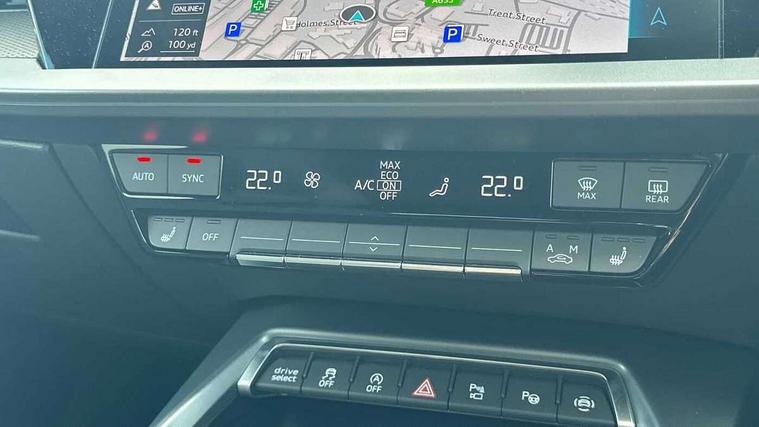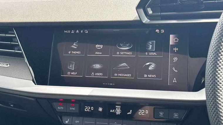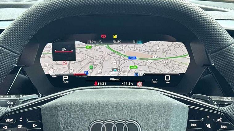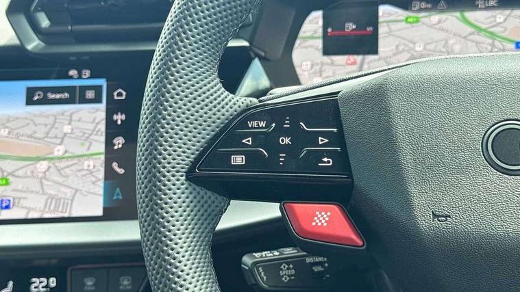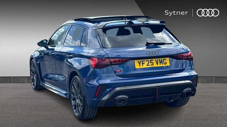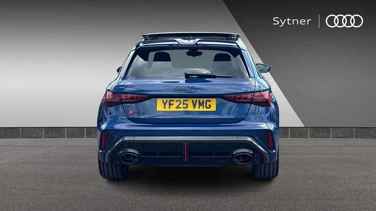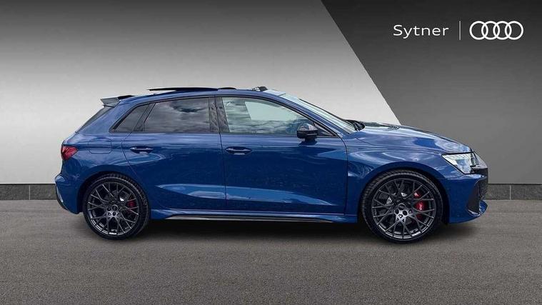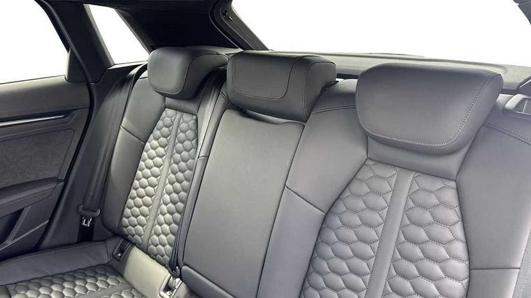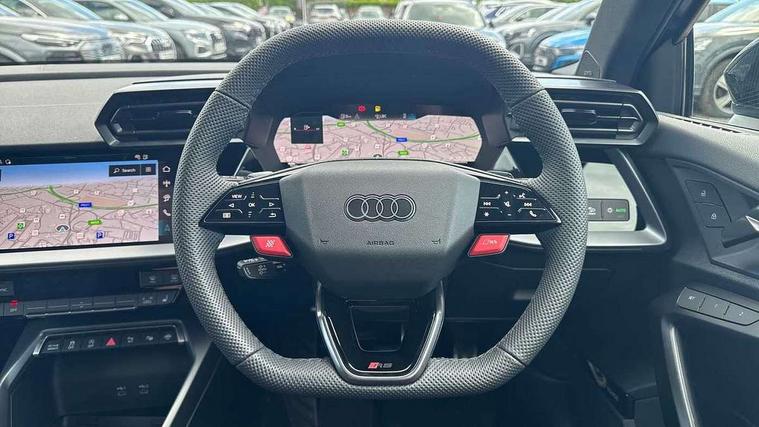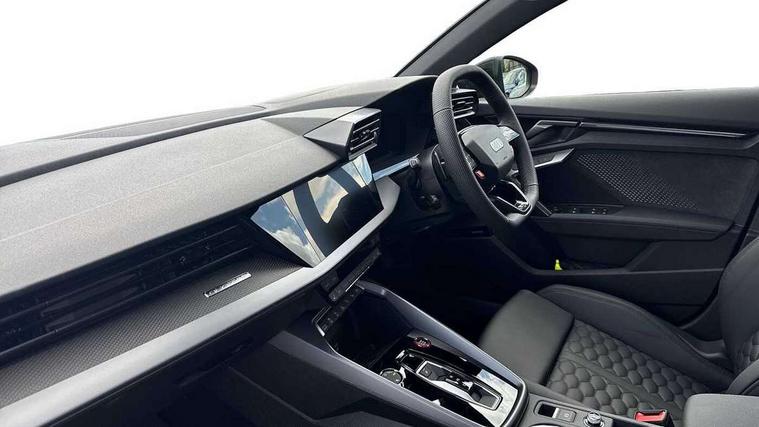 Adjustable speed limiter, Audi drive select comfort, auto, dynamic and efficiency, Audi smartphone interface with app store includes wireless Apple carplay, Android auto and Amazon alexa integration, Audi virtual cockpit plus with RS specific design and 12.3" display with additional graphic display options, Automatic start/stop system with recuperation, Bluetooth interface, Camera based traffic sign recognition, Collision avoidance assistant, Distraction and Fatigue warning, e-Call (emergency call), Lane departure warning system, MMI Navigation Plus with high resolution 10.1" colour touch screen display, Park Assist with parking system Plus, Progressive steering, RS specific driving modes - RS Individual, RS Performance and RS Torque rear, Voice control system with natural language interaction, Quattro permanent four wheel drive, Audi Phonebox light with wireless charging, DAB Digital radio, USB ports with charging function in the rear, All weather light, Audi beam LED projection of RS logo on ground as you exit, Audi darkened matrix LED headlights with dynamic light sequencing and dynamic indicator, Auto dimming frameless rear view mirror, Automatic dynamic range control, Carbon door mirror housings, Carbon fibre engine cover, Dipped beam, main beam, position light and turning light, Dynamic RS specific light sequencing of the coming home and leaving home function, Electrically adjustable/heated/folding/auto dimming door mirrors with integrated LED indications + kerb view function for passenger side, Exterior model badging, Front electric windows, Headlight cleaning system, Heat insulating glass windscreen, Intersection light, LED 3rd brake light, LED brake lights, LED rear lights with dynamic light sequencing and dynamic indicator, LED rear number plate lights, LED reverse light, LED tail lights, Light and rain sensors, Manoeuvring light, Motorway light, Privacy glass - dark tinted rear window, rear door and side windows, Rear electric windows, Rear side wing doors, Rear wiper, Roof edge spoiler in carbon, RS dual branch exhaust system with two chrome plated oval tailpipe trims, Static Cornering lights, Visually upgraded RS specific daytime running light choice of 4 digital signature in chequered flag design within the headlight, 12V socket and storage compartment in front centre console, 3 seat bench in 2nd row, 3 Spoke flat top and bottomed black leather multi function steering and gear shift paddles, 3-zone deluxe automatic air conditioning, 40/20/40 split folding rear seat bench, Black cloth headlining, Black front and rear floor mats, Front and rear headrests, Front centre armrest, Front door sill trims with RS 3 logo, Front sports seats RS embossed logo, Heated front seats, Height and reach adjustable steering wheel, Manual boot compartment lid, Manually adjustable front seats, Rear centre armrest with cupholder, Seat side bolsters, Single front passenger seat, Stainless steel pedals and front footrest in black, Vanadium look - Interior door handles, Door trim, power latching, Air vents, window controls, mirror adjust, rear door lock, Selector lever in centre console, Black Styling plus package - RS3, Extended ambient lighting package Pro with Multi-coloured contour lighting of instrument panel - RS3, RS exterior features pack in carbon and gloss black - RS3, RS sport suspension pack - RS3, Storage package - RS3 Sportback, Technology package without speed limiter - RS3, 3x3 point rear seat belts, Driver and front passenger airbag with passenger airbag deactivation, Electronic Stabilisation Control (ESC) including ABS, ASR and EDL, First aid kit with warning triangle and 2 safety vests, Hill hold assist, Pre-sense front with pedestrian and cyclist detection, RS steel brakes, Seatbelt monitoring, Tyre pressure loss indicator, Anti theft alarm, Anti-theft wheel bolts, Electronically operated child locks, Immobiliser, Remote central locking with safelock, Black dashboard, Inlays in carbon atlas structure, 19" 10 cross spoke silk matt grey alloy wheels, Tyre repair kit,