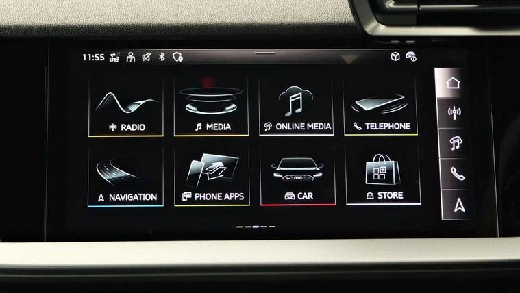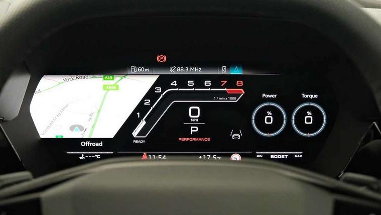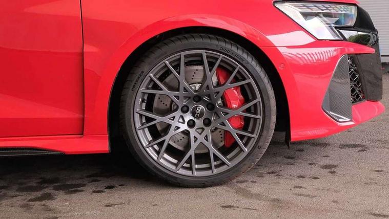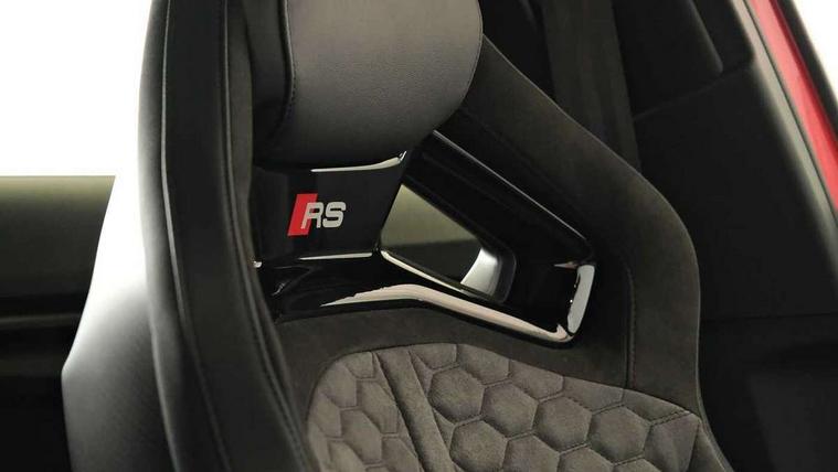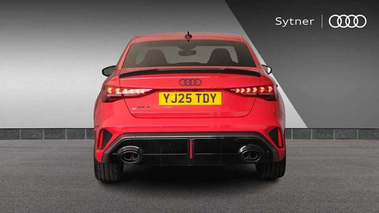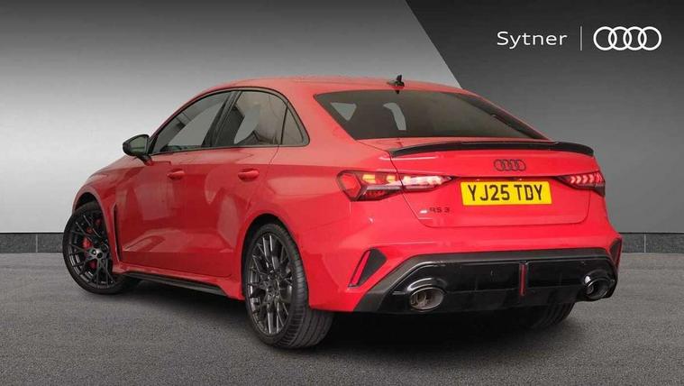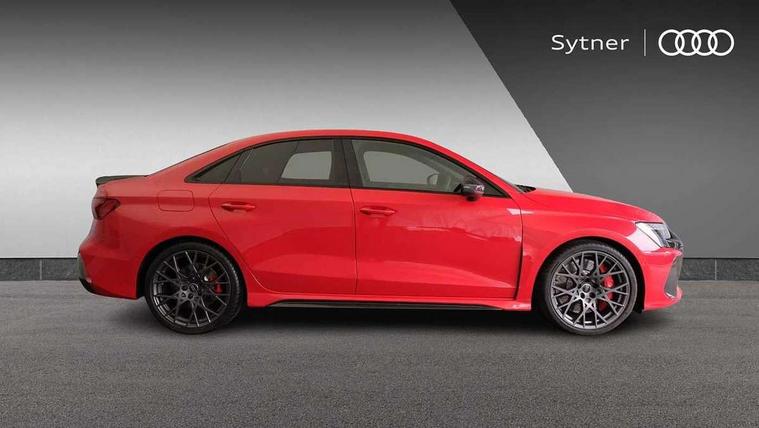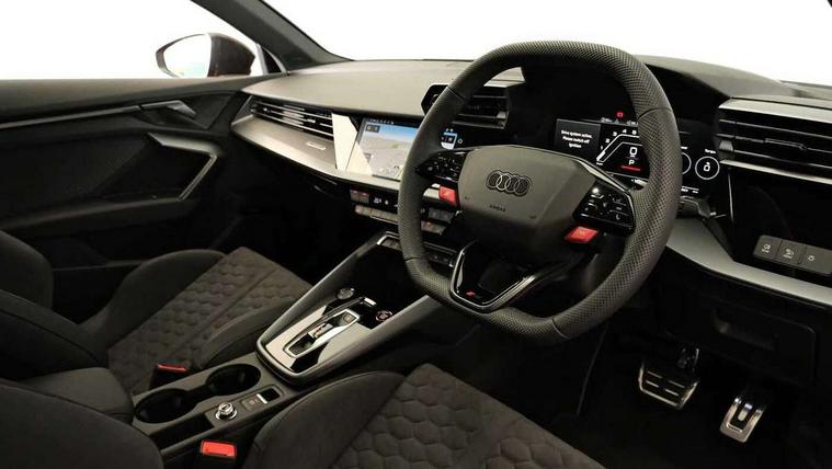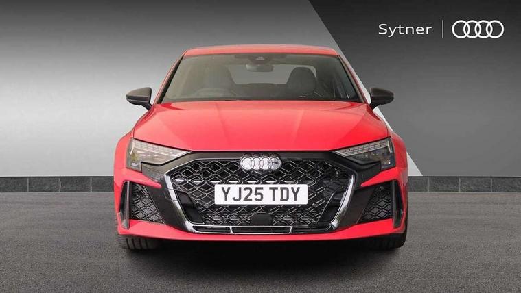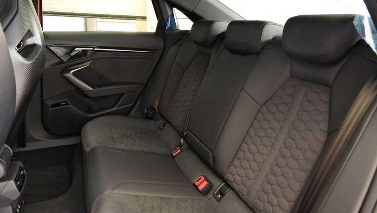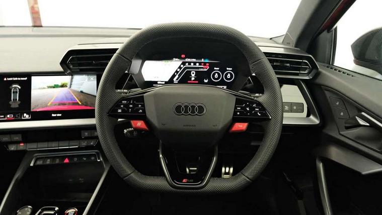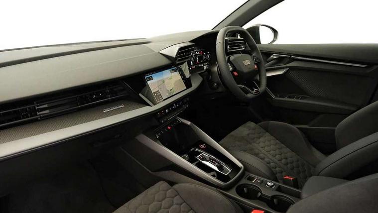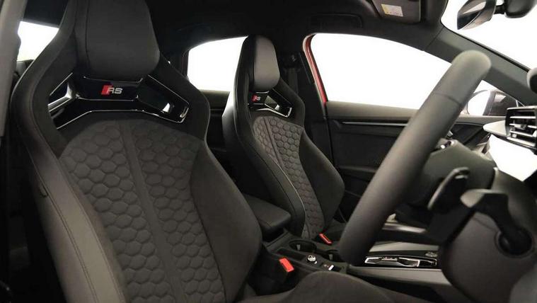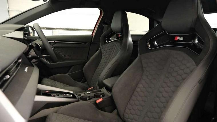 Adjustable speed limiter, Audi drive select comfort, auto, dynamic and efficiency, Audi smartphone interface with app store includes wireless Apple carplay, Android auto and Amazon alexa integration, Audi virtual cockpit plus with RS specific design and 12.3" display with additional graphic display options, Automatic start/stop system with recuperation, Bluetooth interface, Camera based traffic sign recognition, Collision avoidance assistant, Distraction and Fatigue warning, e-Call (emergency call), Lane departure warning system, MMI Navigation Plus with high resolution 10.1" colour touch screen display, Park Assist with parking system Plus, Progressive steering, RS specific driving modes - RS Individual, RS Performance and RS Torque rear, Voice control system with natural language interaction, Quattro permanent four wheel drive, Audi Phonebox light with wireless charging, DAB Digital radio, USB ports with charging function in the rear, All weather light, Audi beam LED projection of RS logo on ground as you exit, Audi darkened matrix LED headlights with dynamic light sequencing and dynamic indicator, Auto dimming frameless rear view mirror, Automatic dynamic range control, Carbon door mirror housings, Carbon fibre engine cover, Dipped beam, main beam, position light and turning light, Dynamic RS specific light sequencing of the coming home and leaving home function, Electrically adjustable/heated/folding/auto dimming door mirrors with integrated LED indications + kerb view function for passenger side, Exterior model badging, Front electric windows, Headlight cleaning system, Heat insulating glass windscreen, Intersection light, LED 3rd brake light, LED brake lights, LED rear lights with dynamic light sequencing and dynamic indicator, LED rear number plate lights, LED reverse light, LED tail lights, Light and rain sensors, Manoeuvring light, Motorway light, Privacy glass - dark tinted rear window, rear door and side windows, Rear boot, Rear electric windows, Rear side wing doors, RS dual branch exhaust system with two chrome plated oval tailpipe trims, Static Cornering lights, Tailgate spoiler in carbon, Visually upgraded RS specific daytime running light choice of 4 digital signature in chequered flag design within the headlight, 12V socket and storage compartment in front centre console, 3 seat bench in 2nd row, 3 Spoke flat top and bottomed black leather multi function steering and gear shift paddles, 3-zone deluxe automatic air conditioning, 40/20/40 split folding rear seat bench, Black cloth headlining, Black front and rear floor mats, Front and rear headrests, Front centre armrest, Front door sill trims with RS 3 logo, Front sports seats RS embossed logo, Heated front seats, Height and reach adjustable steering wheel, Manual boot compartment lid, Manually adjustable front seats, Rear centre armrest with cupholder, Seat side bolsters, Single front passenger seat, Stainless steel pedals and front footrest in black, Vanadium look - Interior door handles, Door trim, power latching, Air vents, window controls, mirror adjust, rear door lock, Selector lever in centre console, Black Styling plus package - RS3, Extended ambient lighting package Pro with Multi-coloured contour lighting of instrument panel - RS3, RS exterior features pack in carbon and gloss black - RS3, RS sport suspension pack - RS3, Storage package - RS3 Saloon, Technology package without speed limiter - RS3, 3x3 point rear seat belts, Driver and front passenger airbag with passenger airbag deactivation, Electronic Stabilisation Control (ESC) including ABS, ASR and EDL, First aid kit with warning triangle and 2 safety vests, Hill hold assist, Pre-sense front with pedestrian and cyclist detection, RS steel brakes, Seatbelt monitoring, Tyre pressure loss indicator, Anti theft alarm, Anti-theft wheel bolts, Electronically operated child locks, Immobiliser, Remote central locking with safelock, Black dashboard, Inlays in carbon atlas structure, 19" 10 cross spoke silk matt grey alloy wheels, Tyre repair kit,