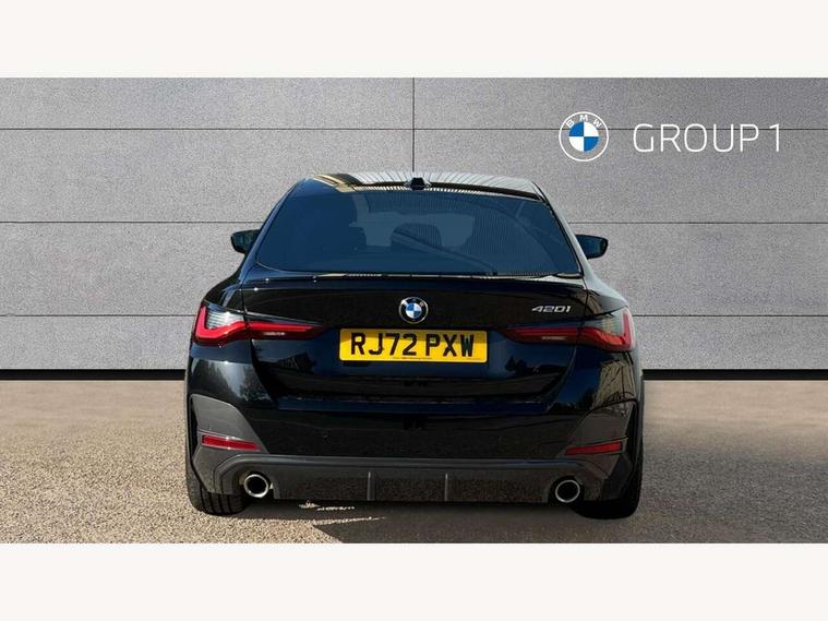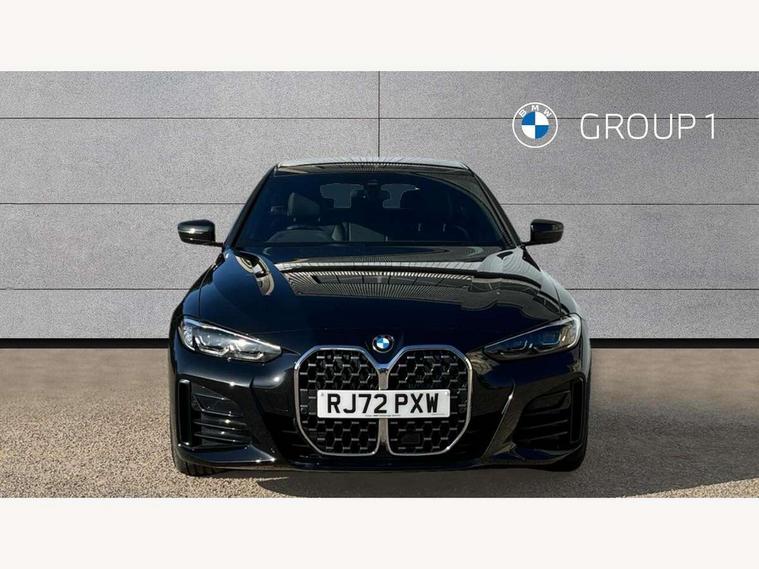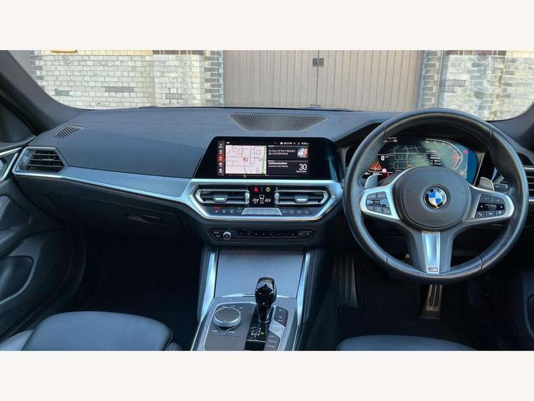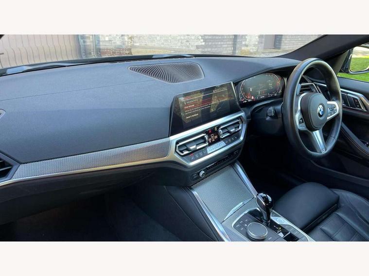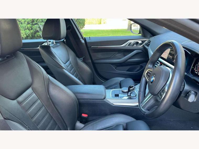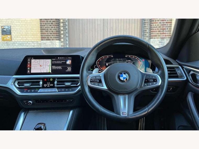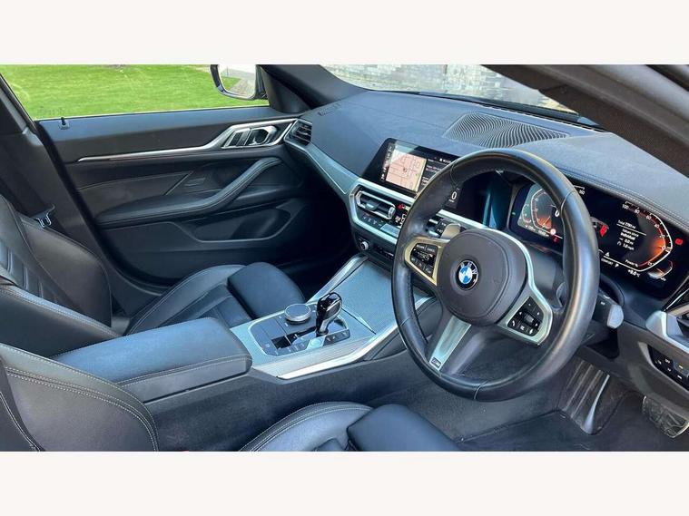 Active guard plus, Attentiveness assist, Auto start-stop, BMW ConnectedDrive online services, BMW iDrive controller on centre console, BMW Live Cockpit Professional Nav with 12.3" instrument display + 10.25" display, Intelligent Voice Assist, BMW OS 7, HDD, 2USB, 4G LTE connect, BMW service history, BMW Teleservices, Brake pad wear indicator in front and rear, Check Control warning system for monitoring of lights and door/luggage compartment open warning, Condition based service, Cruise control with speed limit function, Electric bootlid, Electric power steering with Servotronic steering optimised at all speed ranges, Gearshift time display in manual mode, Instrument cluster with speedometer with mph readout, tachometer, fuel gauge and oil temperature gauge, Integrated owners handbook, Oil sensor for level and grade, warning by check control system, On board computer - average speed, fuel consumption, outside temp display with acoustic warning, clock/date, service interval, odometer/trip meter, Optimum shift indicator, Shifting point display, Tailgate, Variable sport steering, 8 speed automatic steptronic transmission with gearshift paddles, Double joint spring strut front axle, Double VANOS, Drive performance control - ECO PRO, comfort and sport modes, High precision injection, Low centre of gravity, M sport suspension, Petrol Particulate Filter, Stroke dependent dampers, VALVETRONIC engine management, 2x USB Type C ports in front centre console for charging and data transfer, DAB tuner, Electronic service booklet, Acoustic glazing, Automatic headlight beam throw control with load dependent regulating reaction, dynamic compensation of braking dive and acceleration squat, Automatic windscreen wipers and automatic headlight, Automatically dimming electrochromatic rear view mirror, BMW emblem on engine compartment lid and tailgate, BMW kidney grille with mesh grille front side of the nuggets in matt aluminium and frame in chrome high gloss, Body colour fuel filler flap, Body colour roof fin, Brushed aluminium inserts in the front door sill finishers with BMW designation, Door sill strips, Dynamic brake lights, Electric windows - front and rear, with open/close fingertip control, anti trap facility and comfort closing function all round, Exterior mirrors - electrically folding with anti-dazzle, Fading support, Follow me home headlights, Front and rear bumper system, Front apron plastic in body colour, Green tinted heat protection glazing, High gloss shadow line exterior trim, Illuminated bow type door handles in body colour drivers side with door lock, Interior rear view electrochromatic mirror with automatic anti dazzle function, LED daytime running lights, LED front fog lights, LED front indicators, Licence plate panel integrated into front bumper and tailgate, Lightweight engineering, M designation on front side panels, left and right, M sport rear boot spoiler with body colour gurney, Model designation on right side of tailgate, One piece front bumper cover including towing eye cover in body colour, Preparation for high beam assistant, Rear side wing doors, Rear wiper, Reversing light, Side frame decorative moulding black matt, Two part LED tailights in L-shape with components in smoked glass, brake light, LED turn indicator and rear fog light, Visible exhaust tailpipe finisher, Visible VIN plate, Welcome lights in interior and door handle area, Widened track and increased camber values for max transverse dynamics, agility and steering precision, Window recess cover black high gloss, Windscreen wipers with integrated heated washing jets, 12V power socket in front centre console, 2 front cupholder in centre console with clamping elements and matt black inlay, 3 rear headrests, 3 seat bench in 2nd row, 3 spoke M sport leather multifunction steering wheel, 3 zone automatic air conditioning, 4 pieces lashing eyelets in luggage compartment, 40:20:40 split folding rear seat and rear centre armrest with two cupholders, Anthracite headlining, Armrest integrated in front and rear door trim + front centre console armrest, BMW ID, Driver seat backrest width adjustment, Four grab handles integrated in roof lining, Front and rear door pockets, Front and rear reading lights, Front sport seats, Heated driver and front passenger seats, Height adjustable front headrests, Height adjustable mechanically and infinitely variable steering column, Illuminated armrest storage compartment, Illuminated glove compartment with separate small compartment, Make-up mirror lights, Single front passenger seat, Storage compartment in rear centre console, Sunvisors with illuminated vanity mirrors and ticket pocket, Toolkit located in luggage compartment, Velour front floor mats, Vernasca leather upholstery, Ambient lighting pack - 4 Series, Connected professional pack - 4 Series, M sport exterior styling pack - 4 Series, 3 point seatbelts on all seats, Battery safety cut-off, BMW emergency call, Brake energy regeneration, Braking pre-tensioning, Child proof locking system in rear door, Child seat ISOFIX attachment for the two outer rear seats, Coasting in idle in ECO PRO mode, Cornering brake control (CBC), Crash sensor activating of airbags, Unlocking doors, hazard warning lights, interior light, safety battery terminal, Driver and front passenger side airbags, integrated in the door side seat backrest bolsters for all seat variants, Driver/Front Passenger airbags, Dry braking, Dynamic brake control, Dynamic stability control + (DSC+) - Anti-lock Braking System (ABS) with brake assist and cornering brake control + Automatic Stability Control (ASC), Dynamic Traction Control - DTC, Electric parking brake including automatic hold function and automatic release of the parking brake when driving off, Electronic differential lock control (EDLC), Front and rear ventilated brake disc, Front passenger manual airbag deactivation, Head airbags for all 4 outer seats, Hill start assistant, Seat belt security check for driver and fro