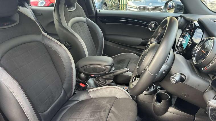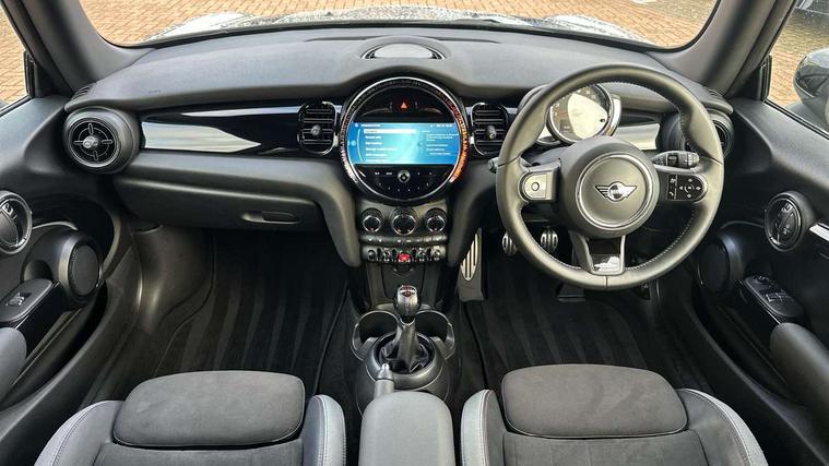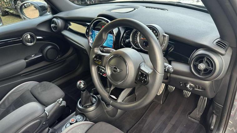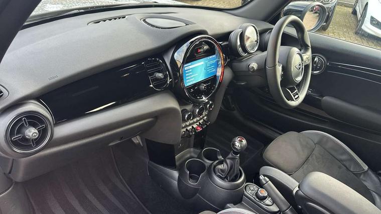 Automatic start/stop function with brake energy recuperation, Compatible mobile phone bluetooth with audio streaming, Cruise control with brake assist, Electro-mechanical speed dependant steering assistance, Flexible car sharing preparation, Instrument cluster, MINI Driving Modes - centre toggle switch to control driving setting (sport, mid and green), Mini E-call, MINI TeleServices, On board computer, Rear park distance control, Service interval indicator, 6 Speed manual transmission including gear change indicator display, Adaptive suspension, Double Vanos system, Fully variable valve control, High precision injection, Performance Control, 4 speakers in front door trims and underneath front seats, 8.8" touchscreen with LED ring, FM tuner and DAB digital radio, Automatic headlight activation switch, Bonnet scoop, Dynamic brake lights, Electric front windows, Heated rear window, Heated windscreen washer jets, JCW Aerodynamic kit - Front and rear bumpers with sporty JCW styling and part-painted side sills with MINI John Cooper Works door sill finishers, John Cooper Works rear spoiler, LED headlight with closed ring and daytime driving lights, Metal door sill strips with Cooper S, Model logo Cooper S on right of tailgate, Radiator grille chrome border with honeycomb structure including S Badge, Rain sensor window wipers, Rear fog lights, Rear LED lights with union jack design, Rear window wiper, Side scuttle panel with integrated indicator, Sun/heat protection glass, Two central exhaust tailpipes with chrome finisher, White indicator lenses, 12V Accessory socket in centre console, 4 lashing eyes in luggage compartment, 60/40 split folding rear seat, Anthracite headliner including grab handles and clothes hooks, Carbon black colour line - Knee roll and door armrest, Chrome interior highlights, Cupholders, Front and rear isofix with front passenger airbag deactivation, Glove compartment, Height and length steering column adjustment, Interior lighting with 12 different colours across the dashboard, underneath door bezel with illuminated laser-engraved design on central display, JCW Sport seats with integrated headrests, adjustable thigh support and John Cooper Works logo, Leatherette gearshift lever and handbrake gaiters, LED reading lights, vanity mirror lights, front foot well light and spotlight on front seats, Manual air conditioning, Mechanical seat adjustment - forward/back & backrest for front seats and driver seat height adjust, Multifunction steering wheel, Passenger seat height adjuster, Storage compartments in doors, Storage pocket on back of front seats, Sunvisors with vanity mirrors, Velour floor mats, Walknappa leather steering wheel with grey seam and John Cooper Works badge on Piano Black lower steering wheel spoke, Piano black exterior pack - Mini Hatchback Cooper S, 3 point seatbelts on all four seats, 6 Airbags - front, side, head and seat belt tensioners, Anti-lock braking system (ABS), DSC - Dynamic Stability Control, Front and rear disc brakes, Two tone horn, Tyre pressure monitoring system, Alarm system with tilt sensor, monitoring doors, bonnet interior and tailgate, Electronic vehicle immobiliser, Start/stop toggle with keyless go, Piano black interior trim, Tool kit,