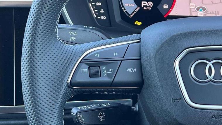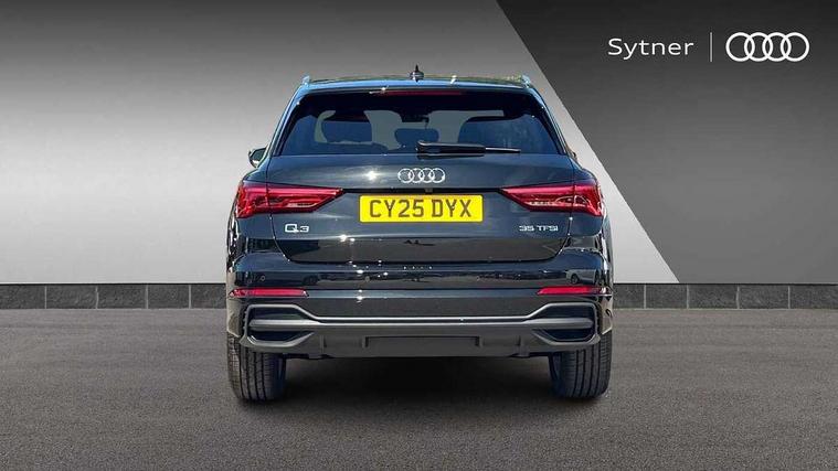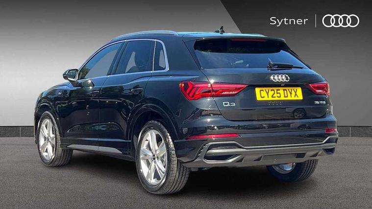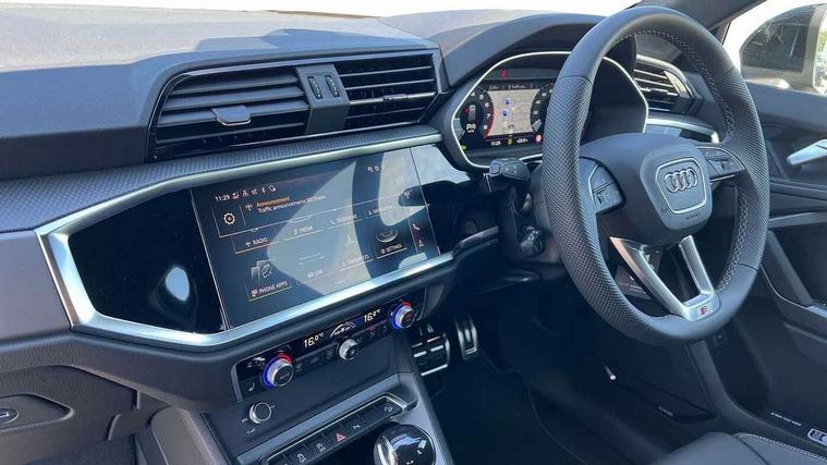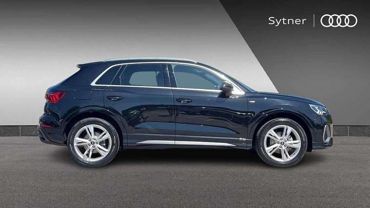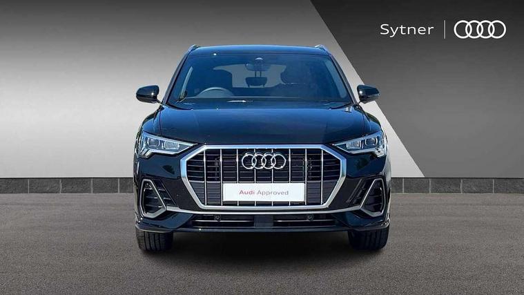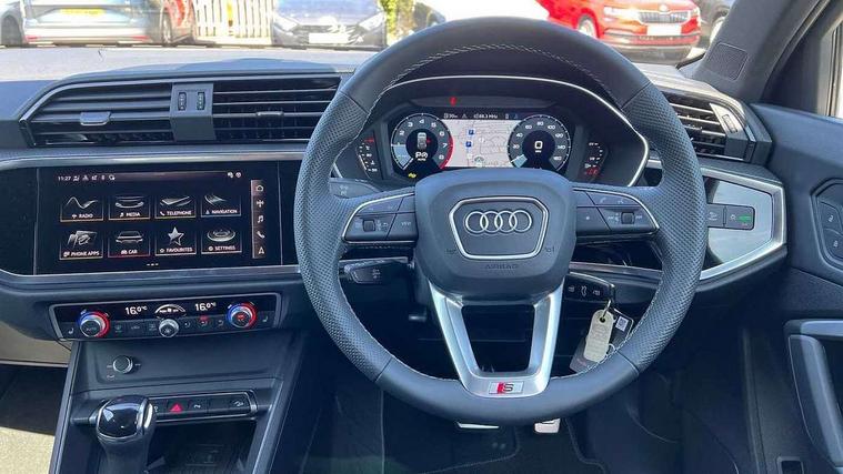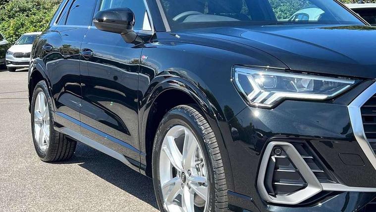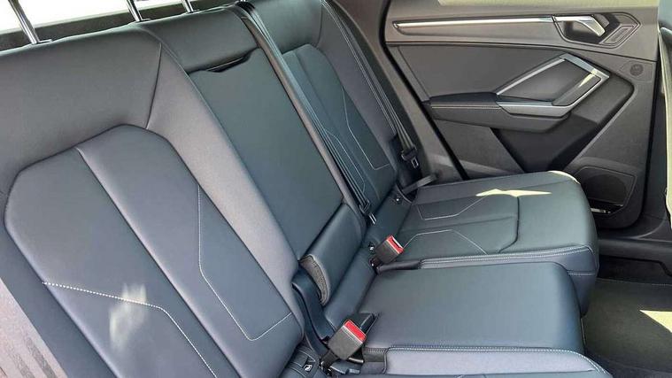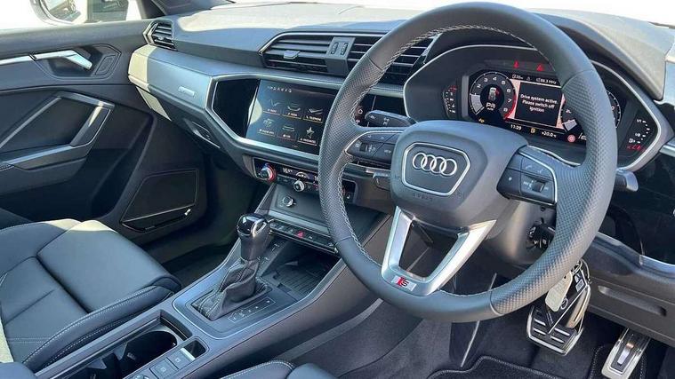 Amazon alexa Integration, Audi connect safety and service, Audi drive select, Audi lane departure warning, Audi smartphone interface includes wireless Apple carplay/Android Auto, Audi Virtual Cockpit - 10.25" display, Bluetooth interface, Camera based traffic sign recognition, Distraction and Fatigue warning, Legal emergency call, MMI Navigation Plus with high resolution 10.1 inch touchscreen colour display, Power operated tailgate, Progressive steering, Service interval indicator, Start stop system with recuperation, Voice control system with natural language interaction, Sports suspension, 2 USB-C ports with charge and data functions, 6 passive loudspeakers, DAB digital radio module, Acoustic windscreen, Aluminium roof rails, Aluminium window trim, Anthracite black radiator grille, Auto dimming door mirrors, Auto dimming frameless rear view mirror, Body colour front spoiler blade, Electrically folding, adjustable and heated door mirrors with integrated LED side indicators and kerb view function for passenger side, Front and rear electric windows, Front fog lights, Front side air inlets in matt platinum grey, Grille vertical bars in aluminium silver/Matt, High gloss black finish B and C pillars, LED Dynamic rear indicators, LED headlights with LED daytime running lights, LED rear lights, LED third brake light, Privacy glass dark tinted rear and rear-side windows (from B-pillar backwards), Rain and light sensors, Rear diffuser grille in grained matt black, Rear diffuser strip in matt anthracite black, Rear side wing doors, Rear wiper, S line badges on front wings, S Line front and rear bumpers and side skirts, Side skirt insert in matt Platinium grey, Variable front intermittent wipers, 12V socket in rear centre console, 3 seat bench in 2nd row, 3 spoke leather multifunction steering wheel features S badging and grips in perforated leather with contrast stitching, 40:20:40 folding with manual adjustment for 60:40 forwards/backwards position and backrest angle, Adjustable rear seat bench/backrest with centre armrest and cupholder, Black carpet mats, Black cloth headlining, Dual zone electronic climate control, Electric lumbar support, Front and rear black floor mats with contrast stitching in rock grey, Front and rear headrests, Front centre armrest, Height and reach adjustable steering wheel, Horizontal trim strip in matt platinum grey, Illuminated door sill trims with S logo, ISOFIX child seat mounting for front passenger with airbag deactivation and outer rear seat including top tether attachment point for outer rear seats, Luggage compartment sill protection in stainless steel, Manual front seats with height adjustment, Perforated leather gearknob, Single front passenger seat, Stainless steel pedals, Twin leather upholstery with front sport seats + S embossing, Non smoking pack - Q3, 3x3 point rear seatbelts, 6 airbags - Driver, front passenger, curtain and side windows, Audi pre-sense front with pedestrain and cyclist recognition, Electrically operated child locks on rear doors, Electromechanical parking brake, Electronic stabilisation control including ABS, ASR and EDL, Front seatbelt reminder, Hill descent control, Hill hold assist, Pre sense basic, Seatbelt monitoring, Tyre pressure warning, Warning triangle and first aid kit, Anti theft wheel bolts, Immobiliser, Remote central locking, Thatcham approved category 1 anti theft alarm, Aluminium look interior elements, Dark matt brushed aluminium inlay, Detail dashboard around MMI touch colour display in glass look, black with surround in aluminium look, Leatherette door armrest,
