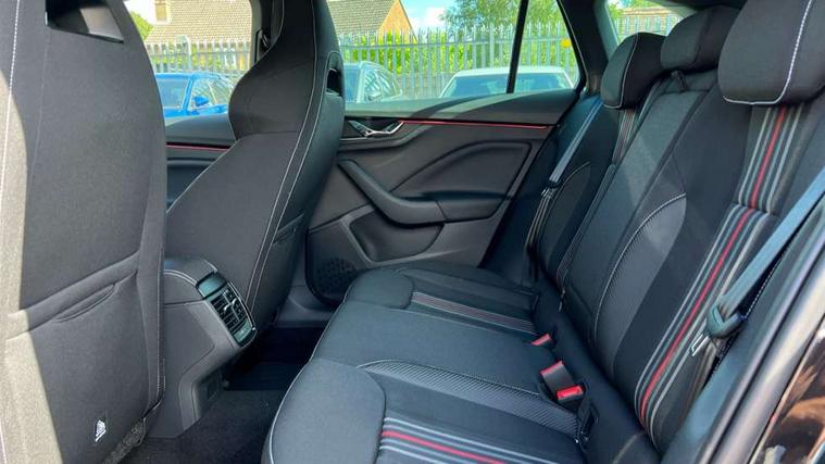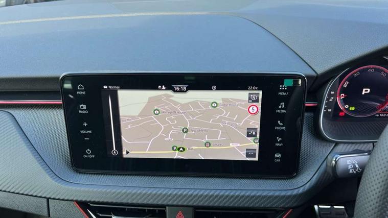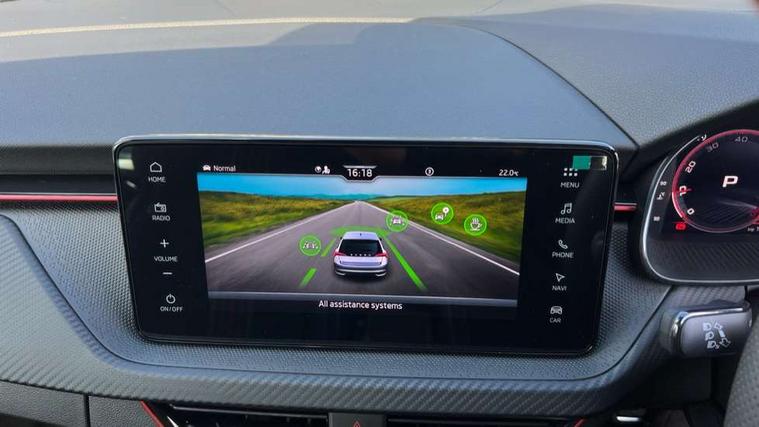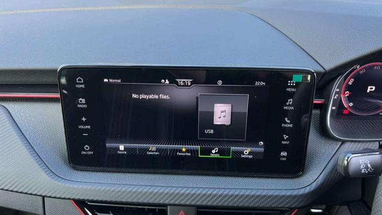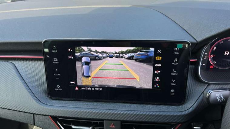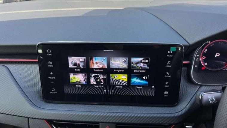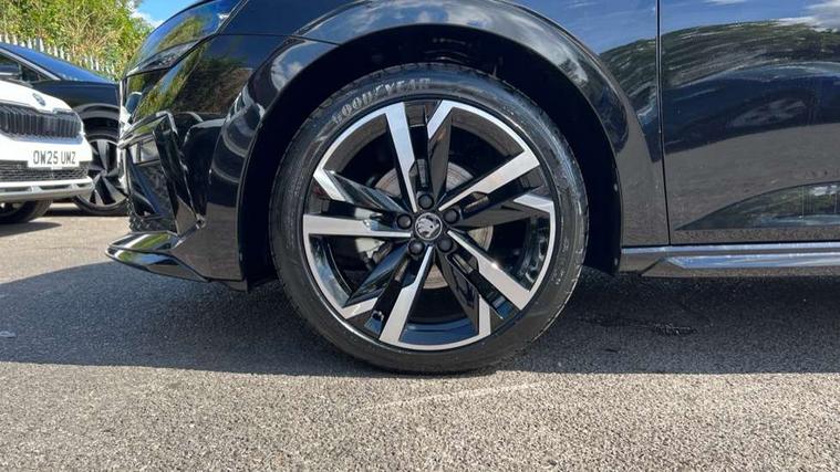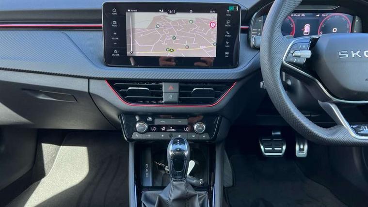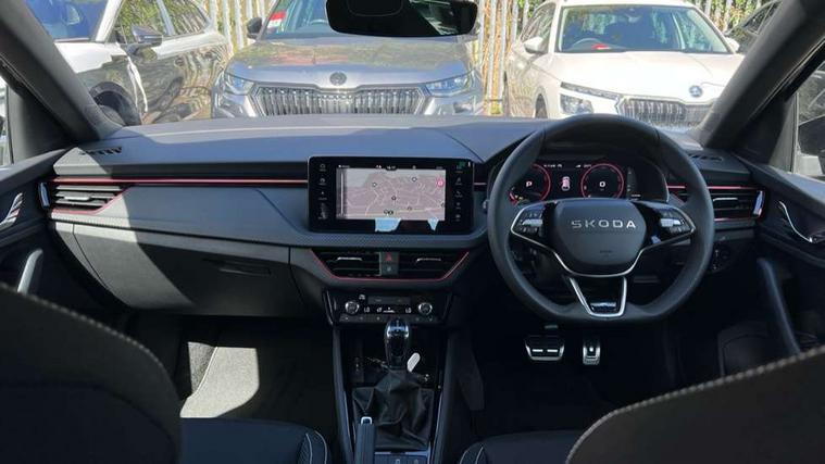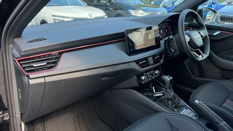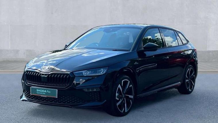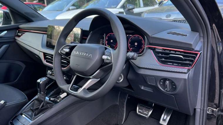 Advanced driver attention and drowsiness monitor, Bluetooth, e-Call (emergency call), Front assist system, PAS, Rear parking sensors, Rear view camera, Speed limiter, Tailgate, Traffic sign recognition, Virtual Cockpit - 10.25" digital display, Voice control system, Wireless smartlink, 4 USB C ports, 8 Speakers, 9.2" Skoda navigation display, DAB radio, Auto dimming rear view mirror, Automatic headlamp activation with Coming home and Leaving home feature, Automatic high/low beam, Automatic intermittent wipers, Black door mirrors, Black lettering on boot lid, Black radiator grille, Black rear diffuser, Black roof spoiler, Body colour bumpers, Body colour door handles, Chrome moulding around grille, Extended tailgate glass, Front and rear electric windows, Heated rear window, LED 3rd brake light, LED brake lights, LED daytime running lights, LED high beam, LED low beam, Light sensors, Monte carlo plaque, Panoramic glass roof, Privacy glass, Rear LED fog light, Rear side wing doors, Rear wiper, Tinted windows, Unique dark chrome design logo on alloy wheels, 12V socket in luggage compartment, 3 seat bench in 2nd row, Aluminium pedals, Ambient lighting in white/red, Black / White armrest stitching, Black ceiling, Black roof headlining, Cargo elements, Chrome inner door handles, Door inserts in art.leather carbon, Driver and passenger sun visors with vanity mirror, Dual zone climate control, Front and rear roof lights, Front centre armrest, Front head restraints, Height adjustable driver seat, Height adjustable passenger seat, Ice scraper, Illuminated glove compartment, Inner circulation control with pollen filter, ISOFIX for front passenger seat, Isofix preparation for back seats, Leather gearknob and handbrake lever, Luggage net under rear parcel shelf, Manual lumbar support for front seats, Monte Carlo cloth upholstery, Net package and top tether hooks in boot space, Pocket on the back of both front seats, incl. mobile phone pockets, Rear centre armrest, Red hotstamping, Single front passenger seat, Skoda lettering on steering wheel, Sport seats, Textile floor mats, Third rear headrest, Ticket holder, Top tether for front passenger seat, Umbrella in driver's door, Light and view plus pack - Scala, 3x3 point rear seatbelts, ABS, Child locks, Curtain airbags and front side airbags, Disc brakes, Driver and front passenger airbags, ESP, Hill hold control, Manual leather parking brake, One tone horn, Passenger airbag switch off function, Seatbelt reminder for driver and front passenger, Tyre pressure monitoring system, Anti theft alarm system with interior monitoring, backup horn and towing protection, Anti-theft wheel bolts, Remote central locking with 2 remote folding keys, SAFE function for remote central locking, Carbon effect decorative inserts, 18" Ursa black diamond cut alloy wheels,