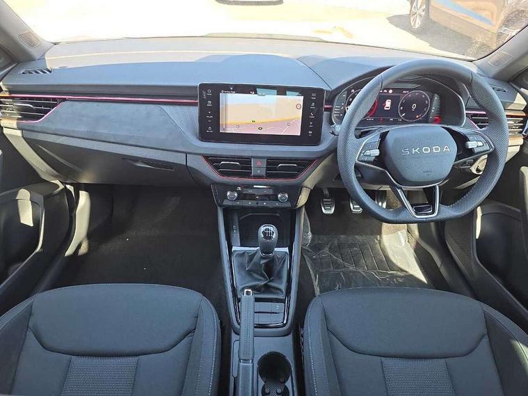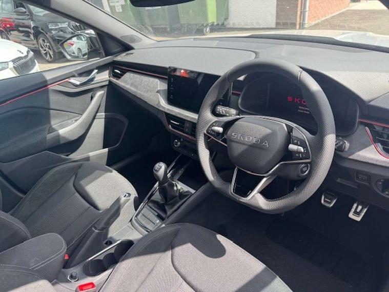 Advanced driver attention and drowsiness monitor, Bluetooth system, E-call, Front assist system, PAS, Rear parking sensors, Rear view camera, Service indicator, Speed limiter, Traffic sign recognition, Virtual cockpit with 10.25" display, Voice control system, Wireless smartlink, 4 USB C ports, 8 Speakers, 9.2" Skoda navigation display, DAB Digital radio, Auto dimming rear view mirror, Automatic headlight control with coming home and leaving home feature, Black door mirrors, Black roof, Black roof rails, Body colour bumpers, Body colour door handles, Chrome grille surround, Front and rear electric windows, Full LED headlights, Heated rear window, LED brake lights, LED daytime running lights, LED front turning lights, LED high beam, LED low beam, LED third brake light, Privacy glass, Rear LED fog light, Rear side wing doors, Rear wiper, Ticket holder inside windscreen, 12V socket in luggage compartment, 3 seat bench in 2nd row, 3 spoke leather sports multi-function steering wheel, Aluminium pedals, Ambient lighting in white/red, Black roof lining, Black suedia decor inserts, Black suedia door inserts, Cargo elements, Chrome inner door handles, Driver and passenger sun visors with vanity mirror, Dual zone climate control, Dynamic cloth upholstery, Front and rear roof lights, Front centre armrest, Front head restraints, Glove compartment with illumination, Height adjustable driver seat, Height adjustable front passenger seat, Ice scraper, Inner circulation control with pollen filter, ISOFIX on front passenger seat, Isofix preparation for back seats, Leather gearknob and handbrake lever, Manual lumbar support for front seats, Net package and top tether hooks in boot space, Net under rear shelf, Overhead glasses storage compartment, Pocket on the back of both front seats include mobile phone pockets, Rake/reach adjustable steering wheel, Reading lights, Rear centre armrests, Red hotstamping, Single front passenger seat, Sports seats, Textile floor mats, Third rear headrest, Top tether for front passenger seat, Umbrella in driver's door, 3x3 point rear seatbelts, Airbags - driver and front passenger, Disc brakes, ESP, Extended and predictive pedestrian/cyclist protection, Front passenger airbag deactivation switch, Front side airbags with curtain airbags, Hill hold control, Manual leather parking brake, Manual rear child locks, One tone horn, Seatbelt reminder for driver an co-driver, Traction control, Tyre pressure monitor, Anti-theft alarm system with interior monitoring, backup horn, towing protection and remote central locking with SAFE system, Anti-theft wheel bolts, Electronic engine immobilizer, Tyre repair kit,