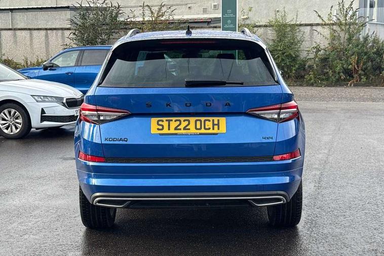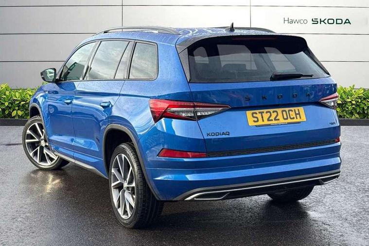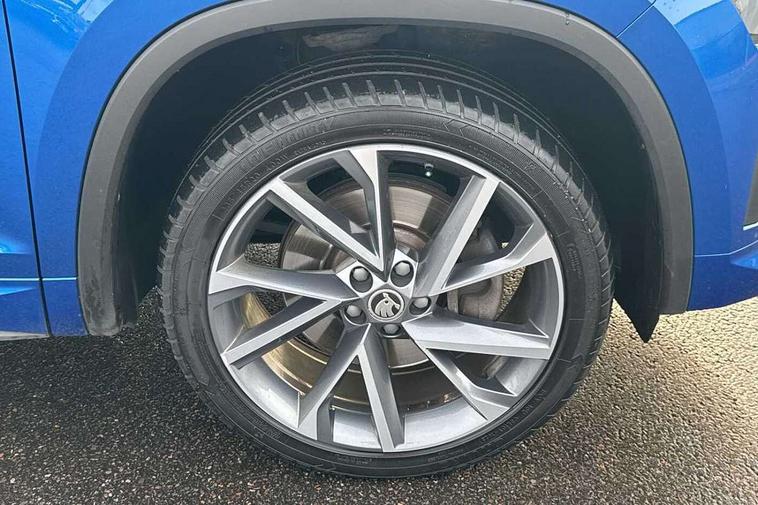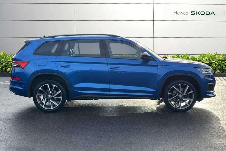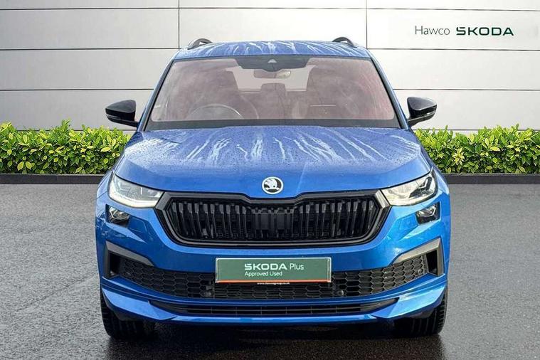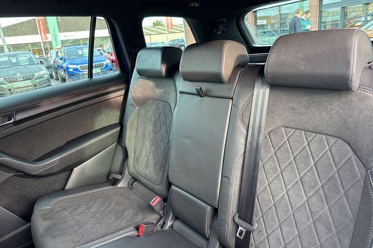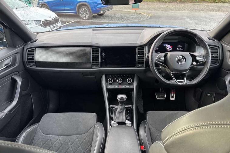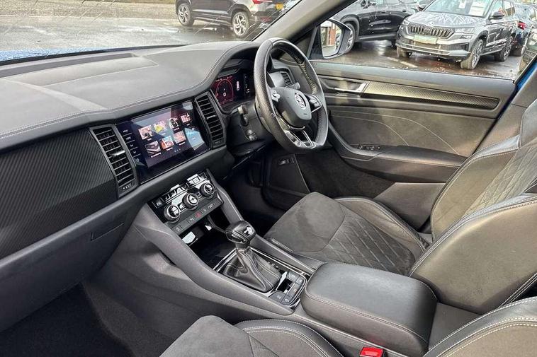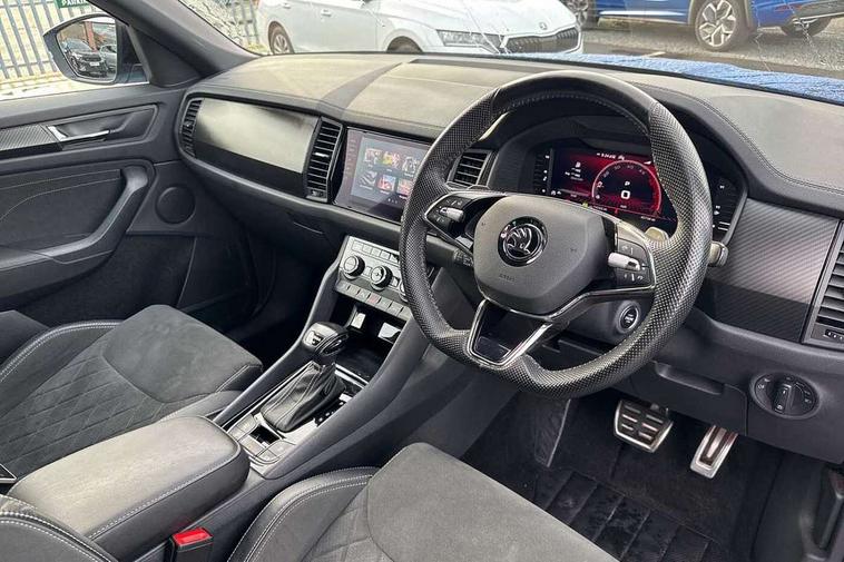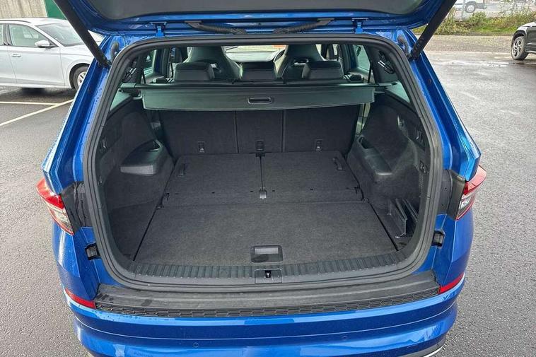 Bluetooth system, Columbus satellite navigation with 9.2" touchscreen, integrated Wi-Fi, web radio, Digital voice enhancement, E-call, ECO Stop/start function, Exterior temperature indicator, Progressive steering, Rear view camera, Smartlink wireless for apple carplay and wired for android auto, Speed limiter, Tailgate unlocking from outside, USB C Port x 2 in front centre console, Wireless charging, 8 Speakers, DAB Digital radio, Aero front windscreen wipers with intermittent function, Aero rear window wiper, Auto dimming rear view mirror, Black roof rails, Black sports styling including front grille and window surrounds, Black wheel arch surrounds, Body colour bumpers, Body colour door handles, Electric adjustable/heated/folding door mirrors, driver side auto dimming with boarding sports and memory function, Electric front and rear windows, Extended rear spoiler with finlets in gloss black, Front fog lights, Full LED matrix headlights with AFS (adaptive front light system), cornering function and AWL (all weather lighting system), Gloss black door mirrors, Headlight washers, Heated rear window, Invisible tailpipe, LED daytime running lights, LED rear fog light, LED third brake light in rear spoiler, Light assistant (coming/leaving home/tunnel light), Off-road style lower front bumper element, Privacy glass, Rain and light sensors, Rear diffuser, Rear LED lights (high functionality) with welcome effect and dynamic indicators, Rear side wing doors, Safety reflectors on front and rear doors, Sportline badge on front fender, Sports front and rear bumpers including lower rear chrome strip, Tailgate lettering in Black, Window control switches with black trim, Without engine designation, 12V socket in boot, 2 rails with 2 hooks, 2 seat bench in 3rd row, 3 seat bench in 2nd row, 4 foldable roof handles with rear coat hooks, 60:40 foldable rear seat with sliding adjustment and backrest angle adjustment, Aluminium pedals, Black roof headlining, Bottle holders in door panel in the 1.5 litre front and 1 litre rear, Cargo storage compartments, Chrome headlight control button, Chrome interior door handles, Coat hooks on B pillar, Covered storage compartment on driver side, Front centre armrest with storage compartment, cup holder and 12V socket, Front courtesy lights, Gear shift lever with chrome frame and black gloss insert, Grey stitching in front and rear armrests and door armrests + door inserts, Height adjustable front headrests, Illuminated and cooled glovebox, Illuminated luggage compartment, Isofix child seat fittings in outer rear seats with top tether, Manually adjustable steering column, Microsuede door panels, Net programme in boot (1x horizontal Net, 2x vertical Nets), Overhead glasses storage compartment, Pollen filter, Rear centre armrest with cupholders, Single front passenger seat, Sliding trunk cover, Small Bags on the inner sides of the front backrests, Sports seats, Sunvisors with illuminated vanity mirrors, Three rear height adjustable headrests, Ticket holder on A Pillar, Umbrella in door panel, Variable boot floor, LED Interior light pack - Kodiaq, Auto door release and activation of warning lights in the event of an accident, Child locks on rear doors, Driver and front passenger airbag with knee airbag and front passenger airbag deactivation, Electronic parking brake with hill start assist, Emergency rear braking signal, ESC (incl. ABS+MSR+ASR+EDS+HBA+DSR+RBS+MKB), Front assist with autonomous emergency braking, Front side airbags with curtain airbags, Fuel cut off safety device, Height adjustable front 3 point seatbelts + pretensioners, Hill hold control, Rear disc brakes, Safety vest holder in door, Seat belt reminder for all seats, Three point rear seat belts, Two tone horn, Tyre pressure monitor, Alarm with interior monitoring and tilt sensor with safe function, Anti-theft wheel bolts, Immobiliser, Keyless entry and start system (KESSY), Remote central locking with 2 keys, Black air vent surround, Carbon finish dashboard and door inserts, Grey stitching in dashboard, 20" Vega Anthracite alloy wheels, Temporary spare wheel (space saver),