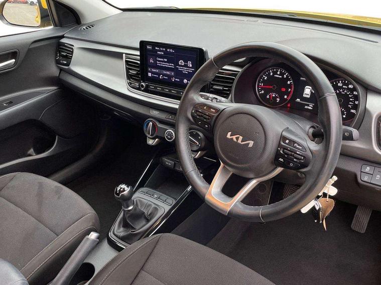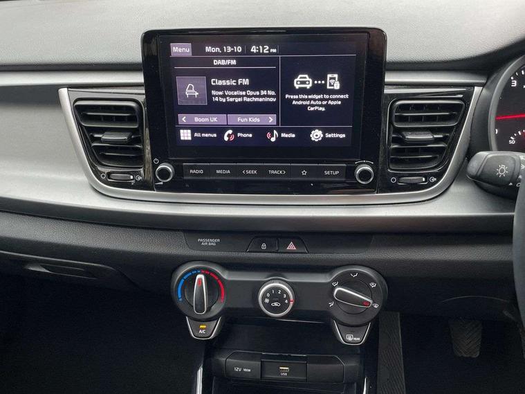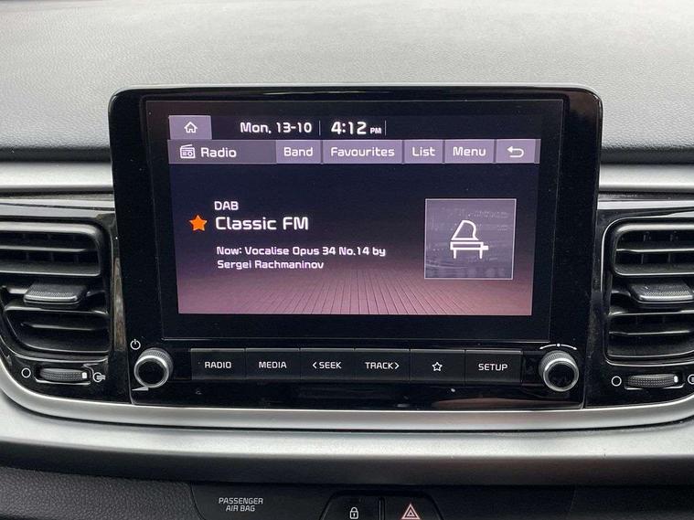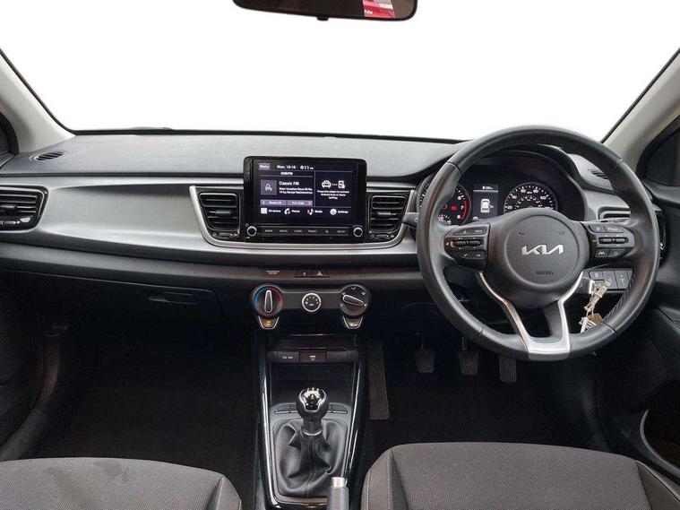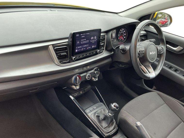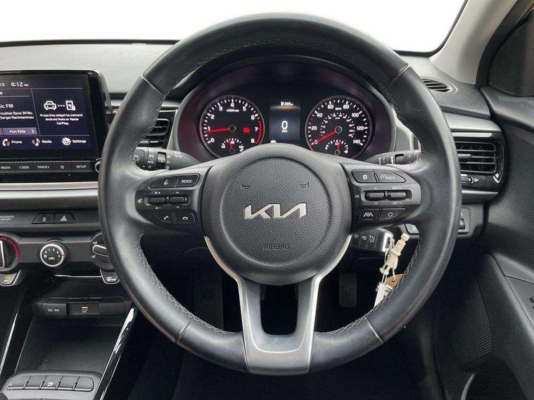 8" touch screen, Apple car play/Android Auto, Cruise control + speed limiter, Digital clock, Electric power steering, Emergency stop signalling system, Gear selection indicator, Manual speed limit assist (MLSA), Outside temperature display, Rear parking sensor, Reversing camera system with dynamic guidelines (Integrated into centre fascia screen), Tachometer, Trip computer, Voice control system, Windscreen washer level indicator, Intelligent Stop and Go, 6 speakers, Bluetooth connectivity including audio streaming, DAB Digital radio, Front USB for media connection, Rear USB port, Steering wheel mounted audio controls, Aeroblade-type front wipers, Automatic lighting control, Bi-function projection headlights, Black grille with chrome surround, Body colour bumpers, Body colour door handles, Body coloured door mirrors, Cornering light, Electric adjustable/heated/folding door mirrors, Front and rear electric windows with drivers's auto up/down function, Headlamp levelling, Heated rear window, LED daytime running lights, LED indicators in door mirrors, Projection front fog lights, Rear electric windows, Rear fog lamp, Rear wash/wipe, Speed variable front wipers, Tinted glass, Welcome home function, 12V power point front, 3 passenger assist grips, 60/40 split/folding 2nd row of seats, Air conditioning, All round height adjustable headrests, Centre Console with Storage Box and Sliding Armrest, Dash illumination dimmer switch, Driver's seat height adjuster, Driver/passenger sunvisors and illuminated vanity mirrors, Front and rear door map pockets with bottle holder, Front passenger seatback pockets, ISOFIX top tethers and lower anchor points, Leather trimmed gearshift, Leather trimmed steering wheel, Load area light, Luggage area parcel shelf, Luggage hooks, Overhead console with sunglasses holder, Premium cloth upholstery, Silver interior door handles, Tilt/telescopic adjustable steering wheel, Advanced driving assistance pack - Rio, 3-point front seatbelts, 3x3 point rear seatbelts, ABS with Electronic Brakeforce Distribution (EBD) and Brake Assist System (BAS), Automatic unlocking of doors in case of impact, Cornering brake control (CBC) and Straight line stability (SLS), Electronic stability control (ESC) and vehicle stability management (VSM), Front seatbelt pretensioners + load limiters, Height adjustable front seatbelt anchors, Hill start assist control (HAC), Passenger airbag deactivate switch, Rear child proof door locks, Seatbelt warning, Traction control, Twin curtain airbags, Twin front airbags, Twin front side airbags, Tyre pressure monitoring system, Anti theft alarm, Deadlocking system, Engine immobiliser, Locking wheel nuts, Remote central door and tailgate locking with fold-away key, Speed sensitive auto door locking, Visible vehicle identification number, Silver fascia trim, 15" alloy wheels, Tyre mobility system,