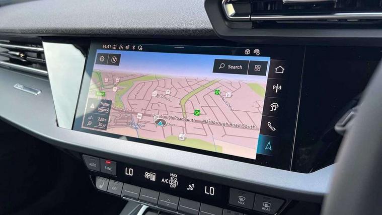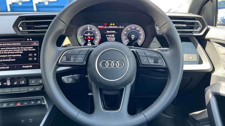 Adjustable speed limiter, Audi drive select, Audi smartphone interface with app store includes wireless Apple carplay, Android auto and Amazon alexa integration, Audi virtual cockpit plus - 12.3" full HD resolution dynamic digital instrument cluster, Automatic start/stop system with recuperation, Bluetooth interface, Camera based traffic sign recognition, Collision avoidance assistant, Cruise control, Distraction and Fatigue warning, e-Call (emergency call), Electromechanical power speed sensitive steering, Emergency assist, Lane departure warning system, MMI Navigation Plus with high resolution 10.1" colour touch screen display, Park Assist with parking system Plus, Service indicator, Trip computer, Voice control system with natural language interaction, 3 pin 10 amp domestic charging cable, CCS socket for DC charging, Charging cable for public charging, mode 3 (type 2), 32 A, Compact charging system, Industrial connector CEE 32 A, 230 V, length 1.6 m, Standard suspension, Type 2 socket for AC charging, Audi Phonebox light with wireless charging, Audi sound system - 10 loudspeakers including centre loudspeaker and subwoofer, DAB Digital radio, USB ports with charging function in the rear, 3rd brake light, Acoustic glass windscreen, Aluminium window trim, Auto dimming frameless rear view mirror, Body colour exterior mirrors, Body colour roof spoiler, Dipped beam, main beam, position light and turning light, Electrically adjustable/heated/folding/auto dimming door mirrors with integrated LED indications + kerb view function for passenger side, Exterior model badging, Front electric windows, Front radiator grill in high gloss dark chrome, Front side air inlets in grained matt black with silver frame, Heat insulating glass windscreen, LED daytime running lights, LED headlights and halogen rear lights, Light and rain sensors, Rear diffuser and grill in grained matt black with silver frame, Rear electric windows, Rear side wing doors, Rear window, rear door windows and rear side windows in clear glass, Rear wiper, 12V socket and storage compartment in front centre console, 3 seat bench in 2nd row, 3 spoke leather multifunction steering wheel with gear shift paddles, 3-zone deluxe automatic air conditioning, 4 way electrically adjustable lumbar support for driver and front passenger, 60/40 split folding rear seat bench, Black front and rear floor mats, Convenience auxiliary air conditioning, Front and rear headrests, Front centre armrest, Front door sill trims with aluminium inlay, Heated front seats, Height and reach adjustable steering wheel, Manual boot compartment lid, Manually adjustable front seats, Routine cloth upholstery with front sports seats, Seat side bolsters, Single front passenger seat, Steel grey cloth headlining, Aluminium interior elements pack - A3, LED interior lighting pack -A3, 3x3 point rear seat belts, Acoustic vehicle alerting system, Driver and front passenger airbag with passenger airbag deactivation, Electronic Stabilisation Control (ESC) including ABS, ASR and EDL, First aid kit with warning triangle and 2 safety vests, Front side airbags with head airbags and interaction airbag, Hill hold assist, Pre-sense front with pedestrian and cyclist detection, Seatbelt monitoring, Tyre pressure loss indicator, Anti theft alarm, Anti-theft wheel bolts, Electronically operated child locks, Immobiliser, Remote central locking with safelock, Black dashboard, Inlays in volcano grey fine paint finish, Tyre repair kit,