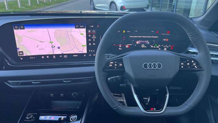 Adaptive cruise control, Advanced driver attention and fatigue montior, Audi application store, Audi assistant, Audi connect emergency call and service, Audi drive select, Audi smartphone interface, Audi virtual cockpit plus with 11.9" OLED colour display, Automatic start/stop system with coasting functionality, Camera based traffic sign recognition, Intersection assist, Lane departure warning, MMI navigation plus with high resolution 14.5" OLED touchscreen colour display, Park assist plus, Parking system plus with 360 display, Progressive steering with servotronic, Rear view camera, Swerve assist and turn assist, Traffic sign based speed limiter, Sports suspension lowered by 20mm, 2 USB-C ports in both the front and rear, Audi sound system impressive sound with 10 loudspeakers including centre speaker and subwoofer, 6-channel amplifier with a total output of 180 watts, DAB digital radio reception, Smartphone compartment with wireless charging, Aluminium roof rails, Aluminium window trims, Auto dimming rear view mirror, Body colour door mirrors, Door mirrors - electrically adjustable, heated, folding and auto dimming on both sides, Front and rear electric windows, Front door sill trims with aluminium inlays, illuminated with 'S' logo, High beam assist, LED headlights Plus incl. digital daytime running lights, turning light, all-weather light, motorway light, manouevring light and intersection light, LED rear lights pro incl. dynamic rear indicators and illuminated light strip with animated coming and leaving home function, LED third brake light, Privacy glass, Rear and side windows with heat insulating glass, Rear side wing doors, Rear wash/wipe, S Line badges on the front wings, S line bumpers, radiator grille and diffuser in phantom black and diffuser insert in matt anthracite, White rhombus logo projection light in exterior mirrors, Windscreen with acoustic glazing, 3 rear headrests, 3 seat rear bench, 3 spoke leather steering wheel with multi-function buttons with touch control, flattened on top and bottom, with S badging and contrast stitching, 3-zone automatic climate control, 40:20:40 split folding rear seat bench with centre armrest and cup holders, Comfort front centre armrest, Front and rear floor mats, Front seats with manual adjustment for position and 4-way electric lumbar support, Front sport seats with integrated headrest and S embossed logo, Headlining in black cloth, Heated front seats, i-Size child seat mounting on the front passenger side and i-Size and top tether on the outer rear seats, Luggage compartment lid, electrically opening and closing, Manual steering column height and depth adjustment, Single front passenger seat, Stainless steel pedals and footrest, Steering wheel grips in perforated leather and shift paddles, Ambient lighting package plus - A5, 3x3 point rear seat belts, Driver airbag, Electric child safety locks, First aid kit with warning triangle and vests, Front emergency brake assist, Front passenger airbag, Front passenger airbag deactivation, Front side airbags with head airbag system and front interaction airbag, Hill hold assist, Seat belt monitoring with rear seat occupant reminder, Tyre pressure loss indicator, Anti theft alarm, Anti-theft wheel bolts, Keyless Go, Accent surfaces and control buttons in gloss black, Black dashboard with contrast stitching, Inlays in matt brushed aluminium with linear embossing, anthracite, Softwrap in leatherette with contrast stitching, Upper and lower interior elements in leatherette, Tyre repair kit,