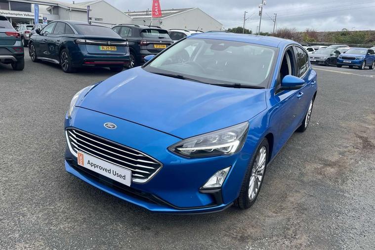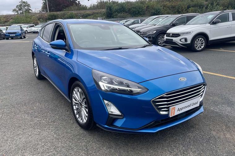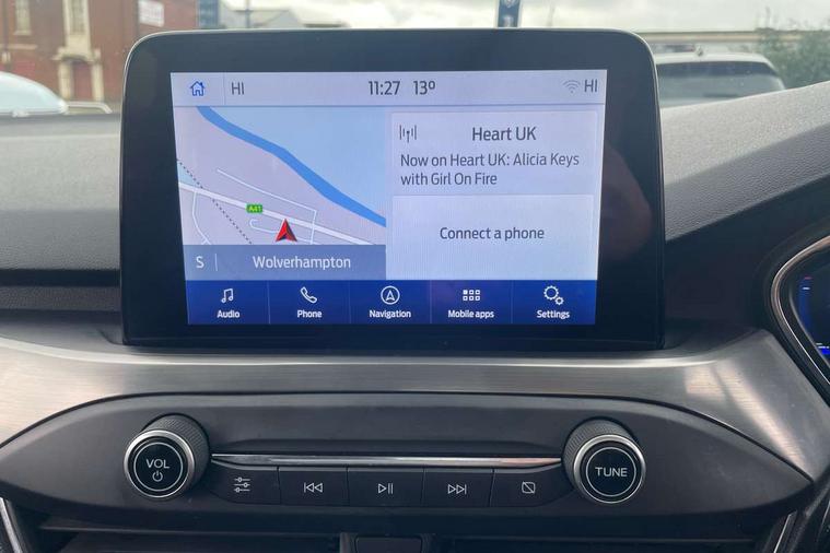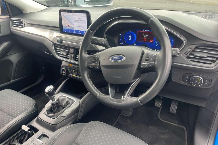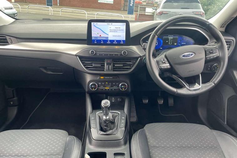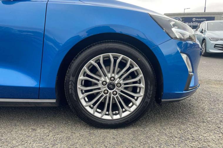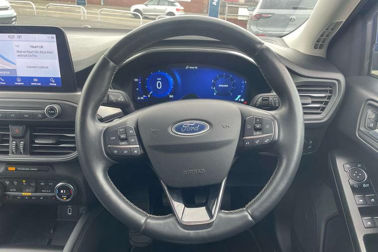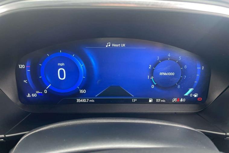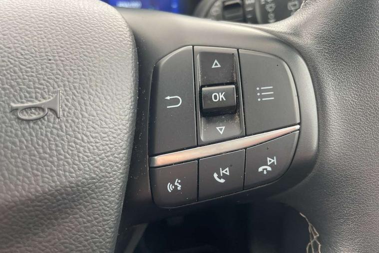 12.3" Digital instrument cluster, Bluetooth system, Digital clock, Easy fuel capless refuelling system, Eco mode, Ford SYNC 3 navigation with 8" TFT touchscreen, DAB radio and app link Android auto/Apple carplay, Intelligent speed assist, Lane keeping system - lane keeping alert and lane keeping aid, PAS, Selectable drive mode, Trip computer, Wireless charging pad, 2 USB ports, Aux input, Auto dimming rear view mirror, Auto headlamps (on/off), Automatic rain sensing wipers, Body coloured bumpers, Body coloured door handles, Body coloured electrically operated and heated door mirrors with side indicators, Electrically operated front and rear windows with one touch opening and closing, Front fog lamps with cornering function, Front variable intermittent wipers with electric wash, Heated rear window, LED daytime running lamp, Power folding door mirrors with puddle lights, Quickclear heated windscreen, Rear privacy glass, Tailgate wash/wipe, Unique door and instrument panel inserts, Upper grille with chrome surround and horizontal bars, 3 spoke leather trimmed steering wheel with integrated audio controls, 6 way power adjustable driver seat, Ambient lighting, Driver's lumbar support, Dual zone electronic air temperature control, Front and rear floor mats with metal grey stitching, Heated driver and front passenger seats, Height adjustable front headrests, Isofix child seat preparation, Leather gear knob, Leather heated steering wheel, Reach + rake adjustable steering column, Rear centre headrest, Sensico partial premium upholstery, Soft console knee pads, 3x3 point rear seatbelts, ABS+Electronic Brake force Distribution, Auto hold function, Driver airbag, Electronic parking brake, Electronic stability control, Front and rear seatbelt reminder, Front inertia reel height adjustable seatbelts with pre-tensioners, Front passenger airbag, Front side airbags, Hill start assist, Passenger airbag deactivate switch, Post collision braking, Power child locks on rear doors, Pre collision assist with autonomous emergency braking and pedestrian/cyclist detection, Side curtain airbags, Three rear inertia reel lap/diagonal seatbelts, Tyre pressure monitoring system, Ford keyfree system with Keyless entry and keyless start/sleep mode key fob, MyKey system, Remote central locking & engine immobiliser, Thatcham category 1 alarm, 17" 10x2 spoke luster nickel alloy wheels, Mini steel spare wheel,