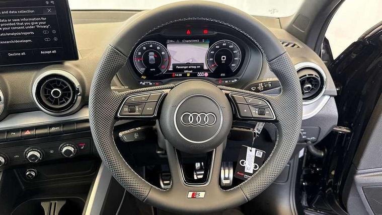 3D map display, Audi connect navigation and infotainment includes innovative services, Audi connect remote and control connects your vehicle to your smartphone, Audi drive select: power steering assistance + engine (modes: comfort, auto, dynamic, efficiency, individual), Audi smartphone interface - Apple carplay/Android Auto, USB connect, 2xSDXC card readers, voice control for navi, telephone, music and 3rd party apps, Audi virtual cockpit, Automatic start/stop system with recuperation, Bluetooth interface includes bluetooth audio streaming, Camera based traffic sign recognition, Cruise control, Distraction and Fatigue warning, E-call, Jukebox hard drive memory for music (10GB), Lane departure warning, MMI navigation plus with 8.8" touchscreen, Natural voice recognition, Power operated tailgate, Progressive steering, Rear parking sensors, Sport suspension, 6 passive loudspeakers, DAB Digital radio, USB type C port, Auto dimming rear view mirror, Black window trims, Body colour door mirrors, Electrically adjustable, folding, auto dimming and heated door mirrors with integrated LED side indicators, Front windscreen with grey tinted sunband, LED daytime running lights, LED headlights with dipped beam, high beam, position lights, indicators, LED rear lights, LED third brake light, Privacy glass - dark tinted rear and rear side windows from B-pillar backwards, Rear side wing doors, Rear wiper, S Line badges on the front wings, S Line body styling - front and rear bumpers, side skirts, radiator grille, rear diffuser insert and front air intakes, Variable front intermittent wipers, Wheel arch trims in manhattan grey, 12v socket in front, 3 seat bench in 2nd row, 3 spoke multi-function leather steering wheel with S badging, 4-way electric lumbar support for front seats including manual seat height adjustment for both front seats, 60/40 split folding rear seat bench, Black carpets, Black cloth headlining, Front and rear head restraints, Front centre armrest, Front sport seats, Front/rear floor mats, Height/reach adjust steering wheel, Illuminated door sill trims with S logo, ISOFIX child seat mounting in front passenger and rear outer seats, Manual air conditioning, Single front passenger seat, Stainless steel pedals, 3x3 point rear seatbelts, 6 airbags - Front, curtain and front side airbags, Electromechanical parking brake, Electronic stabilisation control including ABS, ASR and EDL, Front passenger airbag deactivation, Hill hold assist, Pre-sense front with pedestrian recognition, Seatbelt monitoring, Tyre pressure warning light with visual and acoustic warning, Warning triangle and first aid kit, Anti theft wheel bolts, Electronically operated child locks, Remote central door locking, Thatcham category 1 alarm, Aluminium interior element, Black dashboard, Gloss black centre console, Matt brushed aluminium trim inlays, Tool kit,
