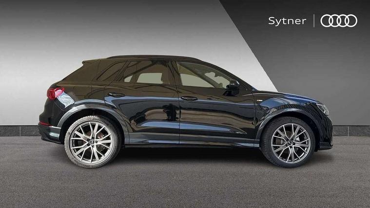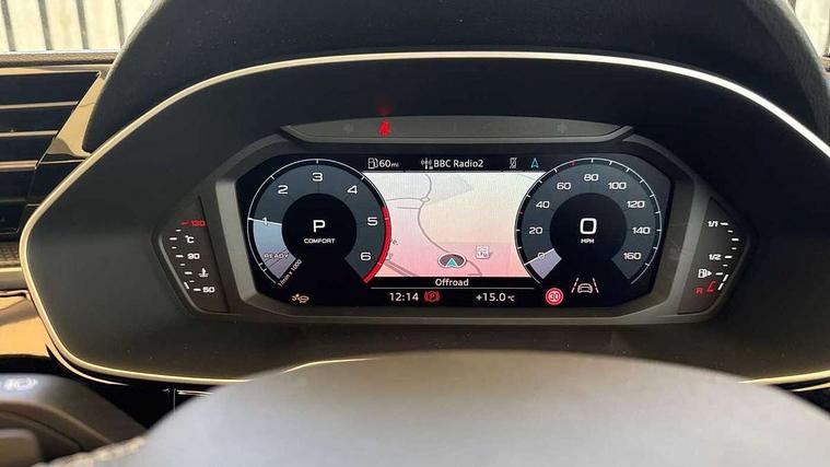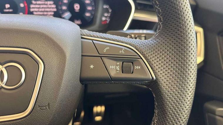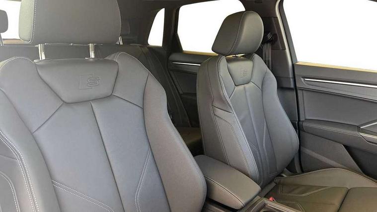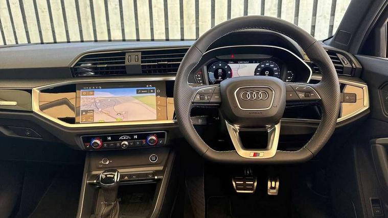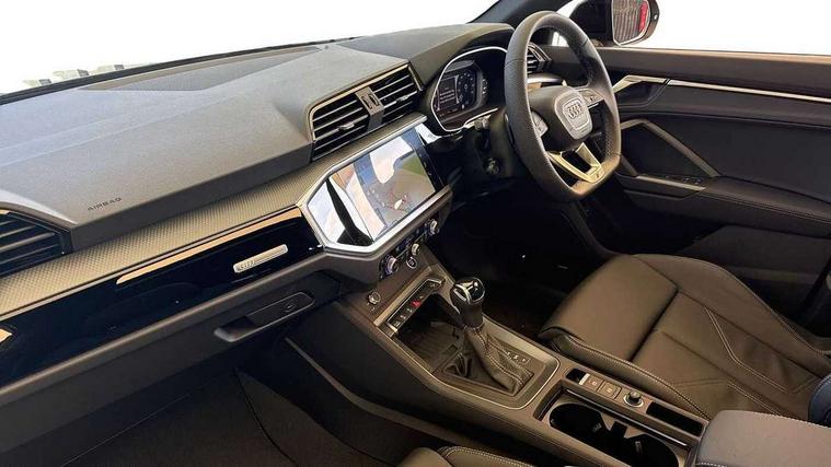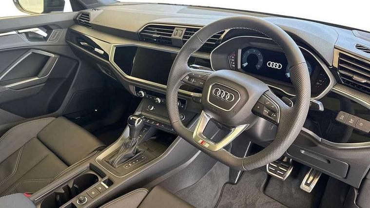 Amazon alexa Integration, Audi connect safety and service, Audi drive select, Audi lane departure warning, Audi Virtual Cockpit - 10.25" display, Bluetooth interface, Camera based traffic sign recognition, Distraction and Fatigue warning, Legal emergency call, MMI Navigation Plus with high resolution 10.1 inch touchscreen colour display, Power operated tailgate, Progressive steering, Service interval indicator, Smartphone interface includes wireless Apple carplay/Android Auto, Start stop system with recuperation, Voice control system with natural language interaction, Diesel particulate filter, Sports suspension, 2 USB-C ports with charge and data functions, 6 passive loudspeakers, DAB digital radio module, Acoustic windscreen, Audi Beam uses LEDs to project the Audi logo onto the ground as you exit your Q3, Auto dimming door mirrors, Auto dimming frameless rear view mirror, Black roof rails, Electrically folding, adjustable and heated door mirrors with integrated LED side indicators and kerb view function for passenger side, Front and rear electric windows, Front fog lights, Grille vertical bars in aluminium silver/Matt, High gloss black finish B and C pillars, LED Dynamic rear indicators, LED headlights with LED daytime running lights, LED rear lights, LED third brake light, Privacy glass dark tinted rear and rear-side windows (from B-pillar backwards), Rain and light sensors, Rear diffuser grille in grained matt black, Rear diffuser strip in matt anthracite black, Rear side wing doors, Rear wiper, S line bumpers in contrasting Manhattan grey, Variable front intermittent wipers, 12V socket in rear centre console, 3 seat bench in 2nd row, 40:20:40 folding with manual adjustment for 60:40 forwards/backwards position and backrest angle, Adjustable rear seat bench/backrest with centre armrest and cupholder, Black cloth headlining, Dual zone electronic climate control, Electric lumbar support, Front and rear black floor mats with contrast stitching in rock grey, Front and rear headrests, Front centre armrest, Height and reach adjustable steering wheel, Illuminated door sill trims with S logo, ISOFIX child seat mounting for front passenger with airbag deactivation and outer rear seat including top tether attachment point for outer rear seats, Manual front seats with height adjustment, Perforated leather gearknob, Single front passenger seat, Stainless steel luggage compartment sill finisher, Stainless steel pedals, Twin leather upholstery with front sport seats + S embossing, Black styling pack - Q3, Non smoking pack - Q3, 3x3 point rear seatbelts, 6 airbags - Driver, front passenger, curtain and side windows, Audi pre-sense front with pedestrain and cyclist recognition, Electrically operated child locks on rear doors, Electromechanical parking brake, Electronic stabilisation control including ABS, ASR and EDL, Front seatbelt reminder, Hill descent control, Hill hold assist, Pre sense basic, Seatbelt monitoring, Tyre pressure warning, Warning triangle and first aid kit, Anti theft wheel bolts, Immobiliser, Remote central locking, Thatcham approved category 1 anti theft alarm, Aluminium look interior elements, Detail dashboard around MMI touch colour display in glass look, black with surround in aluminium look, Leatherette door armrest, Piano black inlay,