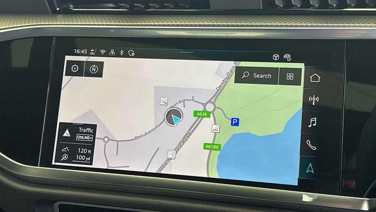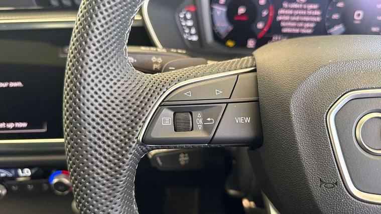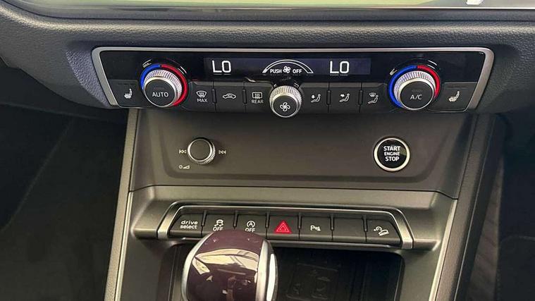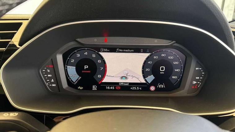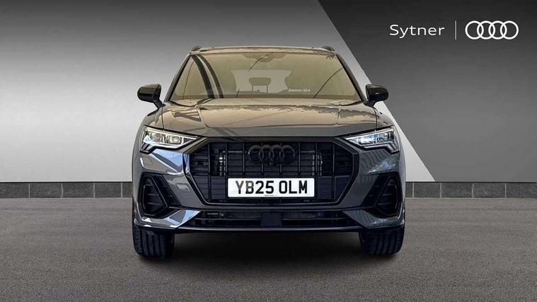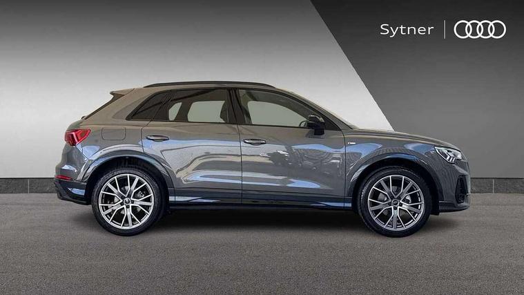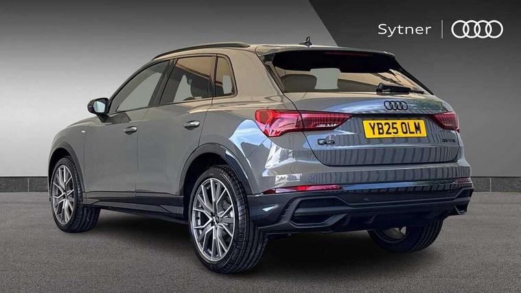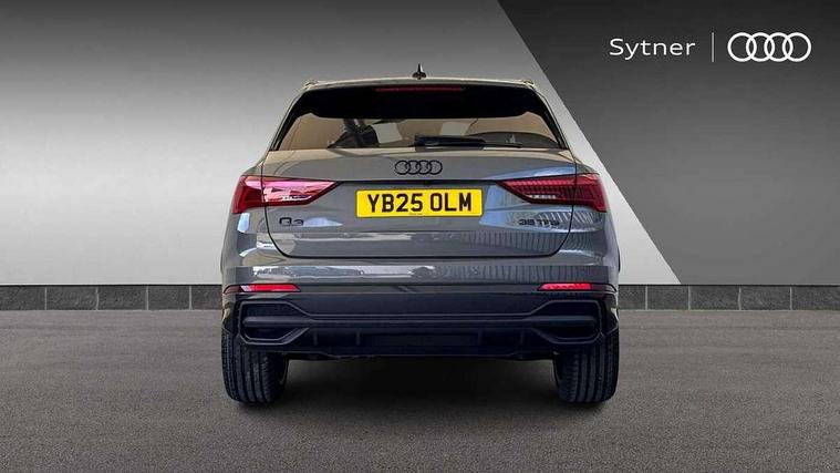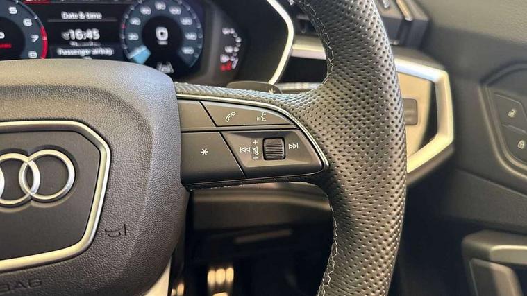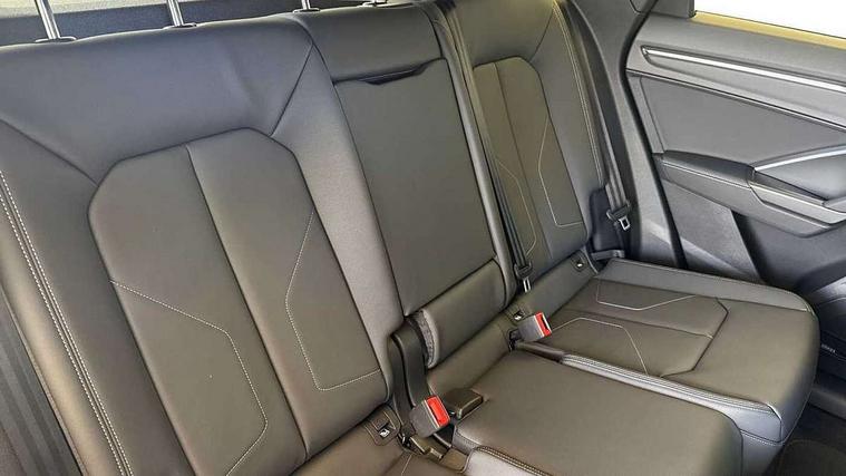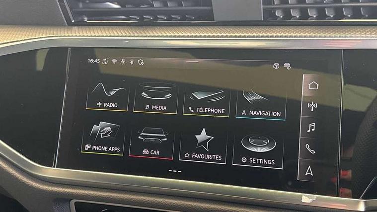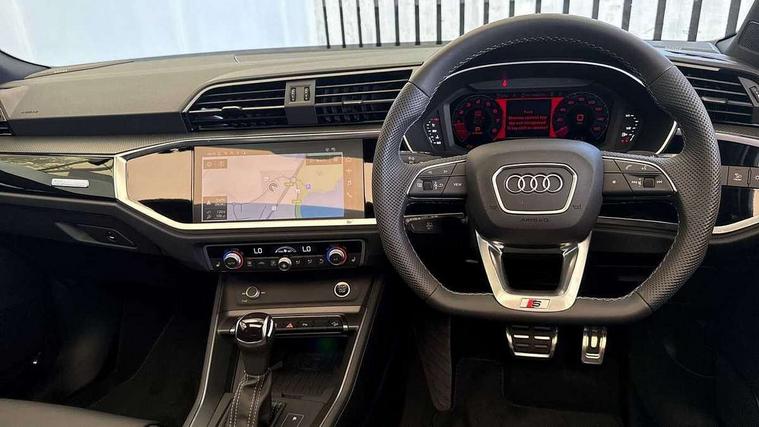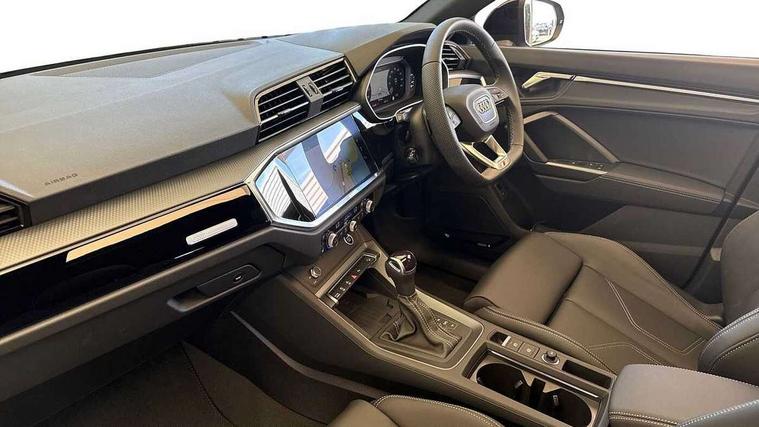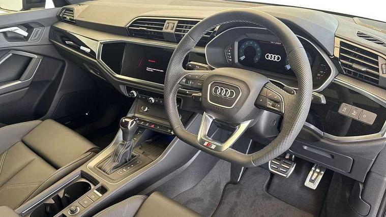 Amazon alexa Integration, Audi connect safety and service, Audi drive select, Audi lane departure warning, Audi smartphone interface includes wireless Apple carplay/Android Auto, Audi Virtual Cockpit - 10.25" display, Bluetooth interface, Camera based traffic sign recognition, Distraction and Fatigue warning, Legal emergency call, MMI Navigation Plus with high resolution 10.1 inch touchscreen colour display, Power operated tailgate, Progressive steering, Service interval indicator, Start stop system with recuperation, Voice control system with natural language interaction, Sports suspension, 2 USB-C ports with charge and data functions, 6 passive loudspeakers, DAB digital radio module, Acoustic windscreen, Anthracite black radiator grille, Audi Beam uses LEDs to project the Audi logo onto the ground as you exit your Q3, Auto dimming door mirrors, Auto dimming frameless rear view mirror, Black roof rails, Electrically folding, adjustable and heated door mirrors with integrated LED side indicators and kerb view function for passenger side, Front and rear electric windows, Front fog lights, Grille vertical bars in aluminium silver/Matt, High gloss black finish B and C pillars, LED Dynamic rear indicators, LED headlights with LED daytime running lights, LED rear lights, LED third brake light, Privacy glass dark tinted rear and rear-side windows (from B-pillar backwards), Rain and light sensors, Rear diffuser grille in grained matt black, Rear diffuser strip in matt anthracite black, Rear side wing doors, Rear wiper, S line bumpers in contrasting Manhattan grey, Variable front intermittent wipers, 12V socket in rear centre console, 3 seat bench in 2nd row, 40:20:40 folding with manual adjustment for 60:40 forwards/backwards position and backrest angle, Adjustable rear seat bench/backrest with centre armrest and cupholder, Black carpet mats, Black cloth headlining, Dual zone electronic climate control, Electric lumbar support, Front and rear black floor mats with contrast stitching in rock grey, Front and rear headrests, Front centre armrest, Height and reach adjustable steering wheel, Illuminated door sill trims with S logo, ISOFIX child seat mounting for front passenger with airbag deactivation and outer rear seat including top tether attachment point for outer rear seats, Luggage compartment sill protection in stainless steel, Manual front seats with height adjustment, Perforated leather gearknob, Single front passenger seat, Stainless steel pedals, Twin leather upholstery with front sport seats + S embossing, Black styling pack - Q3, Non smoking pack - Q3, 3x3 point rear seatbelts, 6 airbags - Driver, front passenger, curtain and side windows, Audi pre-sense front with pedestrain and cyclist recognition, Electrically operated child locks on rear doors, Electromechanical parking brake, Electronic stabilisation control including ABS, ASR and EDL, Front seatbelt reminder, Hill descent control, Hill hold assist, Pre sense basic, Seatbelt monitoring, Tyre pressure warning, Warning triangle and first aid kit, Anti theft wheel bolts, Immobiliser, Remote central locking, Thatcham approved category 1 anti theft alarm, Aluminium look interior elements, Detail dashboard around MMI touch colour display in glass look, black with surround in aluminium look, Leatherette door armrest, Piano black inlay,