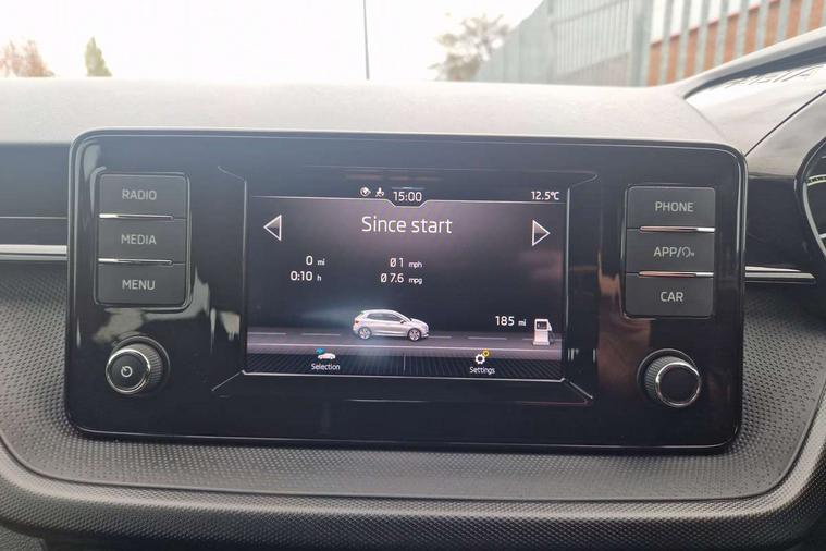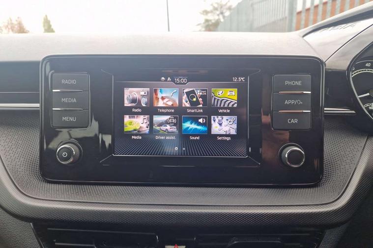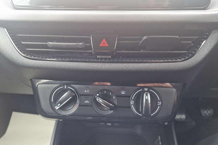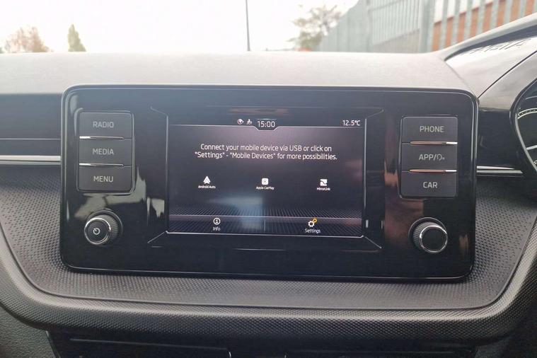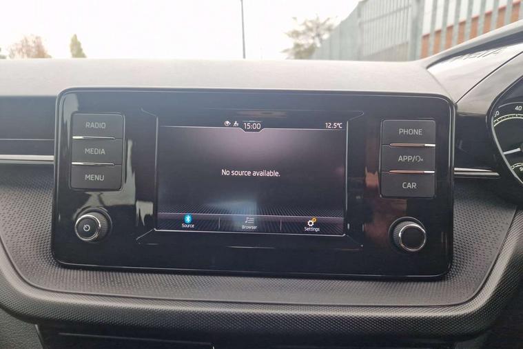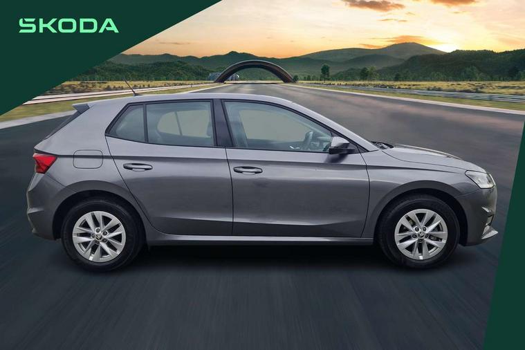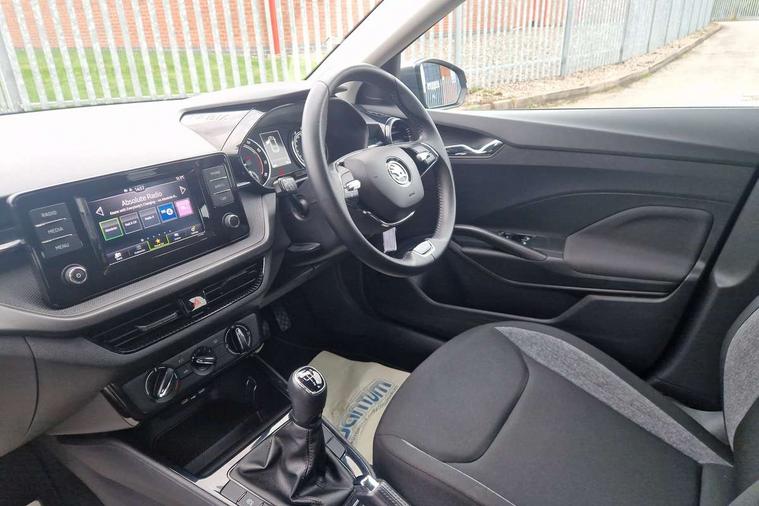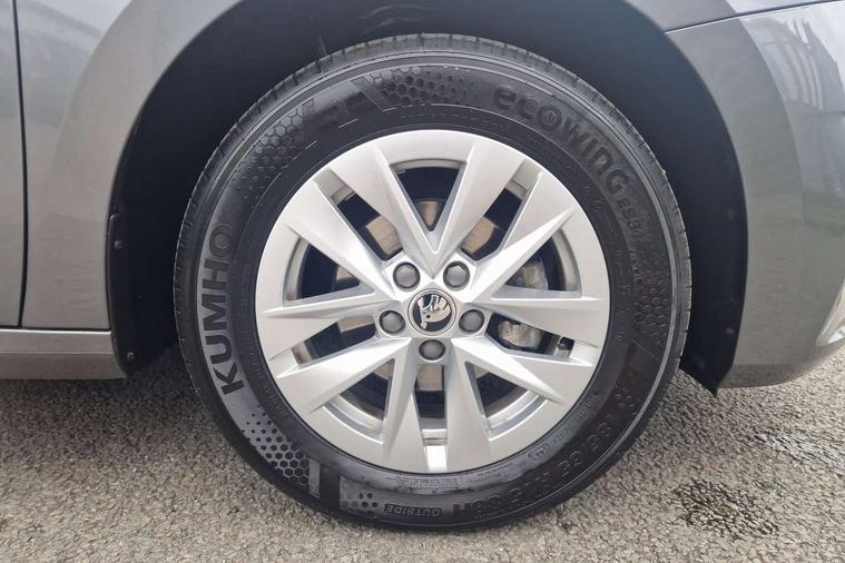 Bluetooth connection, Driver alert system - DAS, Electromechanical power steering, Exterior temperature gauge, Lane assist including road edge detection, Multifunction trip computer in black and white, Service interval indicator, Speed limiter, 2x USB-C in the front (for data transmission and charging), 4 speakers in front, Auxiliary socket for external MP3 player, DAB digital radio reception, Radio Swing with 6.5" colour display, Basic LED Headlights, Basic rear lights, Body colour door mirrors, Body coloured bumpers, Dimming rear view mirror with black frame, Door mirror integrated indicators, Electrically adjustable and heated door mirrors, Electrically adjustable front windows with function auto up/down, Front fog lights, Front window wiper intermittent control, Headlight range control - Automatic, Ice scraper in fuel cap, LED daytime running lights with coming and leaving home feature, Mechanical adjustable rear windows, Rain sensor, Rear LED fog light, Rear side wing doors, Rear window wiper with washing nozzles, Roof mounted spoiler, SKODA tailgate lettering in chrome, Third brake light, 2 reading lights in front and 2 reading lights in rear, 2 spoke leather multifunction steering wheel, 3 rear headrests, Backrest split and folding, Central console with fixed cup holder and storage box, Chrome handbrake release button, Fabric upholstery, Gearshift knob/handle in leather, Grain satin black interior door handles, Hand brake lever handle in leather, Height adjustable front headrests, Height adjustable front seats, Height adjustable steering wheel, ISOFIX and TopTether anchorage points to the outer rear seats, ISOFIX and TopTether on the front passenger seat, Luggage compartment lighting, Manual air conditioning, Manually adjustable lumbar support in front seats, Pollen filter, Rear seat bench unsplit, Single front passenger seat, Storm grey headlining, Sun visors with mirror and airbag label on passenger side, Ticket holder, 3-point height adjustable front seats belts with pretensioner and force limiter, Automatic warning lights in case of crash, Driver and passengers airbag with switch off function, e-Call+, ESC including ABS, MSR, ASR, EDS, HBA and XDS, Front and rear seat belt warning, FRONT ASSIST (AEB City and AEB Inter Urban), Front side airbags, Head airbags, One tone horn, Pedestrian protection, Three rear 3-points safety seat belts with pretensioner and force limiter including stop function for outer rear seat belts, Tyre pressure monitoring system, Anti-theft alarm system including immobiliser, interior monitoring, backup horn, and towing protection, Central locking with radio remote control, interior controls, SAFE function and 2 foldable keys, Black painted air vents, Glossy black decorative trim, Grain satin black central console cover, Grain satin black lower decorative trim, Satin black door and side trim panel in front, Anti-theft wheel bolts protection, Super-low rolling resistance tyres,