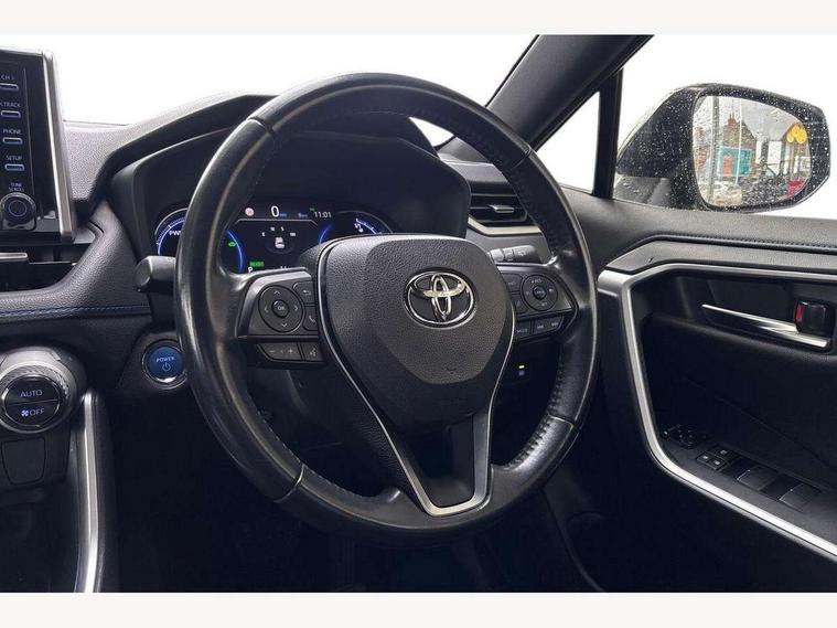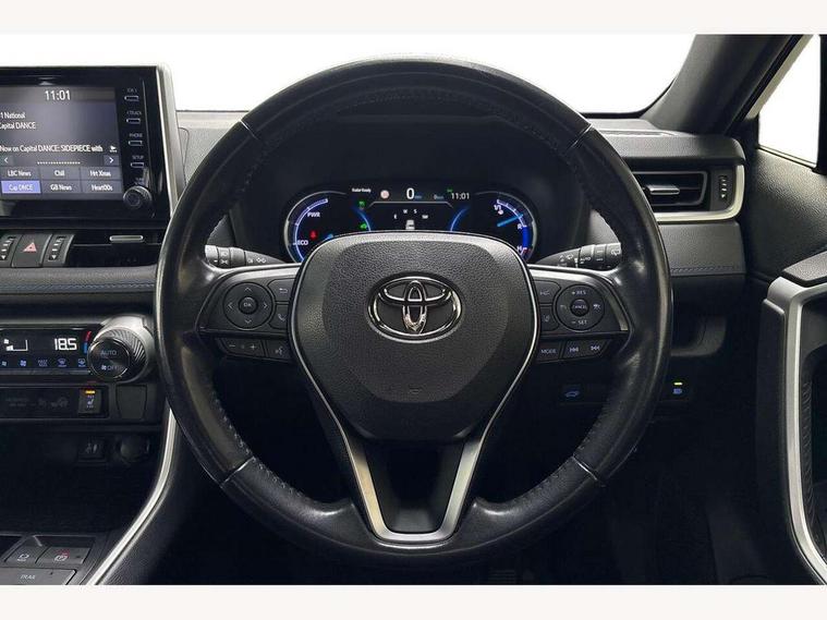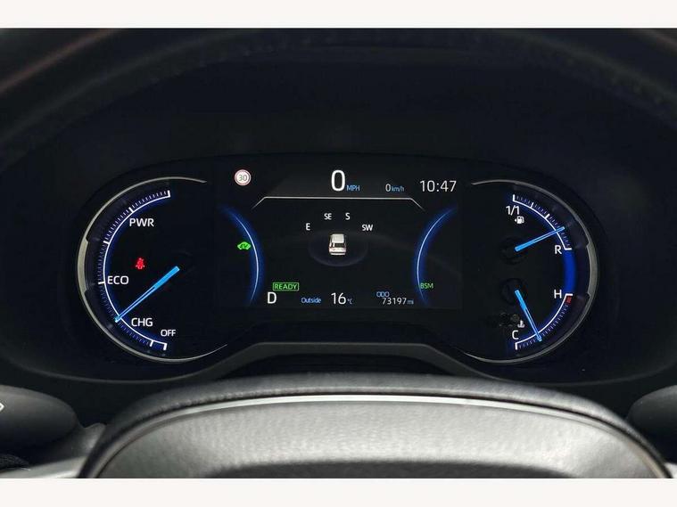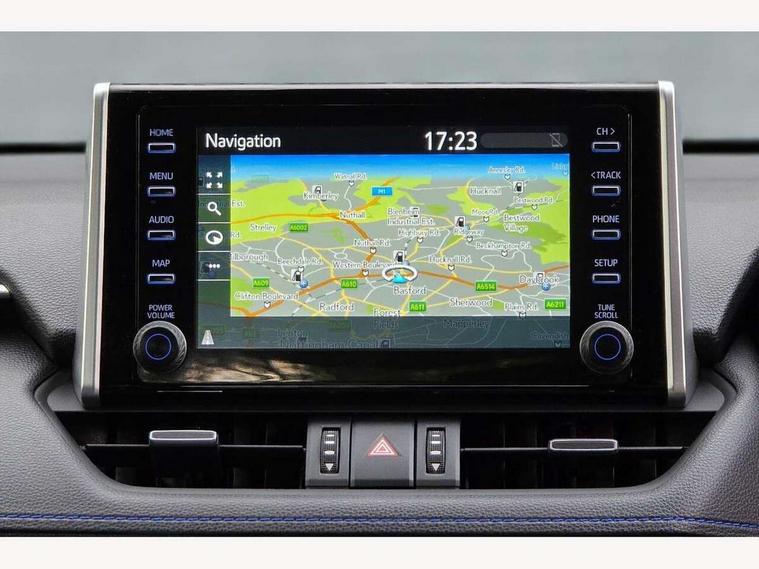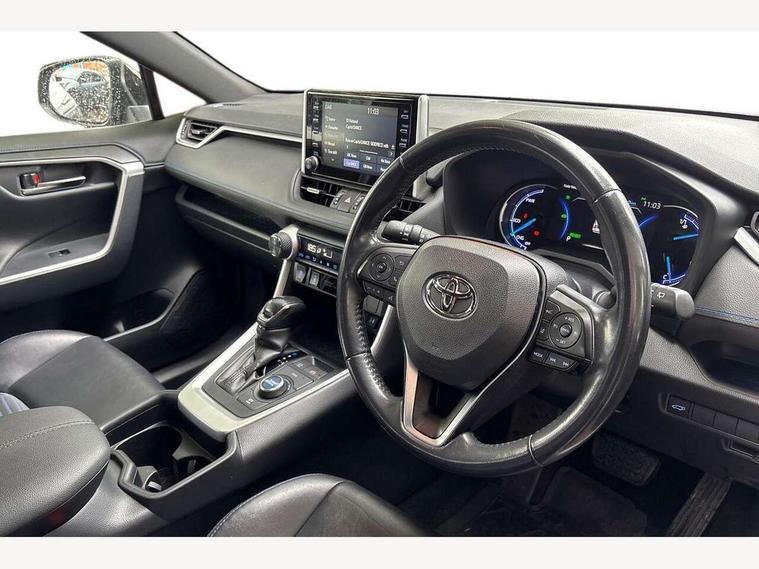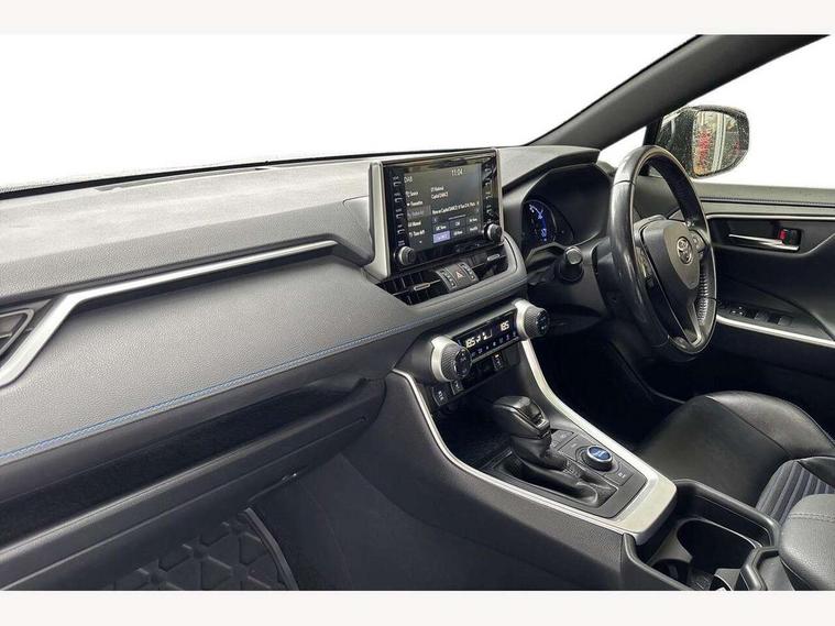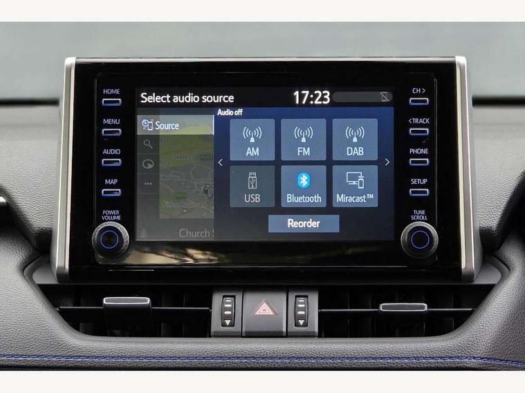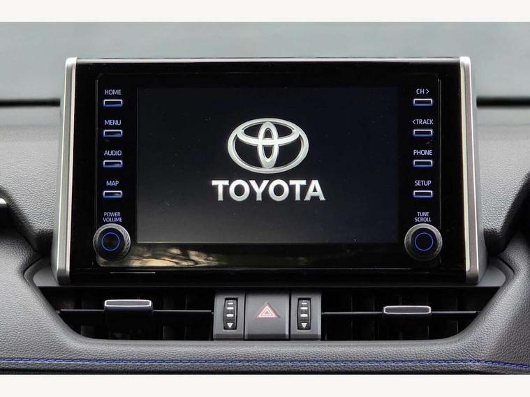 7" colour TFT display, Adaptive cruise control with lane trace assist, Adjustable speed limiter, Blind spot monitoring with rear cross traffic alert, Bluetooth system, Cyclist Detection, Drive mode selector, eCall emergency call system, ECO-driving indicator, Electric power steering, Hybrid system indicator, Lane departure warning system, Lights on warning, Night Time Pedestrian Detection, Pedestrial detection, Power boot opening and closing, Rear parking camera, Rear parking sensors, Remote boot door release in cabin, Tachometer, Touch 2 Go navigation system including 3D maps and voice control, Traffic sign recognition, Trip computer, Voice control system, Vehicle Stability Control (VSC), 6 speakers, 8" Multimedia display touch screen, Auxiliary socket for external MP3 player, DAB audio, Steering wheel mounted audio controls, Toyota touch media system, USB connection, Auto dimming interior mirror, Auto high beam, Automatic headlamp levelling, Automatic headlights, Automatically retractable door mirrors, Bi-tone black roof, Black door mirrors, Black rear spoiler, Black roof rails, Black Shark-fin antenna, Body colour door handles, Body coloured bumpers, Door mirror puddle lights, Electric adjustable door mirrors, Emergency brake-light signal (EBS), Follow me home headlights, Front fog lights, Gloss black front bumper insert, Gloss black rear bumper insert, Headlight cleaners, Heated door mirrors, LED daytime running lights, LED High mounted stop lamp, LED rear lights, Meshed upper front grille, Power front windows, Power rear windows, Privacy glass, Projector LED headlights, Rear screen wiper - intermittent, Rear windscreen defogger, Silver front under-run, Silver rear under-run, Trailer Sway Control, Turning signal integrated indicators in door mirrors, 3 rear headrests, 60/40 split fold rear seat back, Black roof lining, Boot light, Clean air filter, Driver and front passenger personal light, Driver and front passenger Whiplash Injury Lessening seats, Driver and passenger sunvisors with illuminated vanity mirrors, Dual sided deck board in boot, Dual zone automatic air conditioning, Floor mats, Folding rear centre armrest, Front and rear bottle holders, Front centre armrest, Front footwell lights, Front headrests, Front seat and rear pockets, Front sport seats, Front/rear roof mounted assist grips, Heated driver and front passenger seats, Isofix child seat preparation, Leather gear shift with chrome surround, Light blue ambient lighting on front cupholders and open tray, Manual telescopic and tilt 3-spoke leather steering wheel with Chrome insert, Manually reclining and sliding front passenger seat, Pollen filter, Power height-adjustable sliding reclining and lumbar support for driver seat, Rear coat hooks, Rear door armrests, Rear passenger air vents, Reclining rear seats, Satin chrome interior door handles, Sunglasses holder, Synthetic leather upholstery, Parking pack - Rav4, 3x3 point rear seatbelts, ABS/EBD, Adjustable front driver and passenger seat belt extender, Brake assist function, Child proof door locks, Collision mitigation braking system, Driver/Front Passenger airbags, Driver/front passenger side airbags, Drivers knee airbag, Electronic parking brake, Electronic Stability Programme (ESP), Emergency brake light system (EBS), Front and rear curtain airbags, Front and rear seatbelt reminder, Hill start assist, Passenger airbag cut-off device, Seatbelt pretensioners with load limiters, Traction control, Tyre pressure warning, Alarm/immobiliser, Glass-breaking alarm sensors, Light - on and Key in reminder, Remote central locking, Smart entry + Smart start, Speed sensitive auto door locking, Tilt detection sensors, Piano black centre console with silver insert, Soft-touch black lower dashboard, Soft-touch black upper dashboard with silver insert, Full size spare wheel,