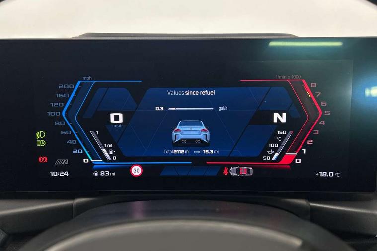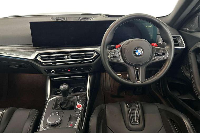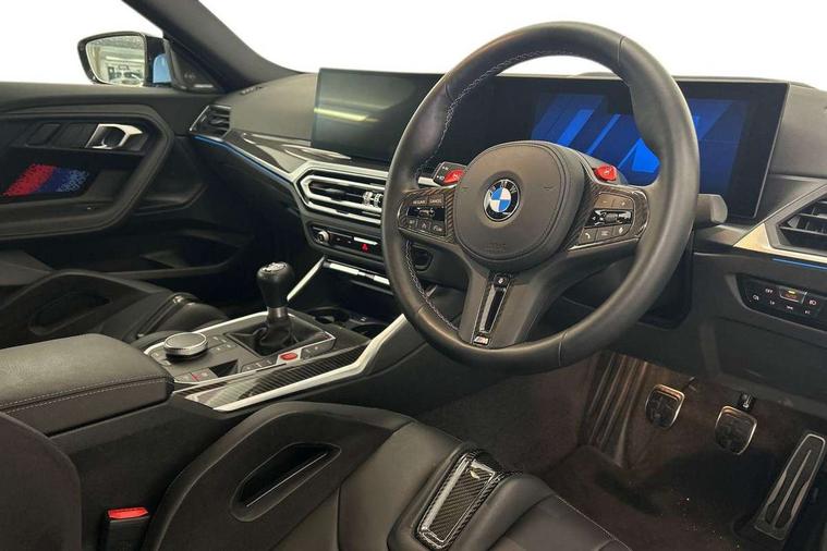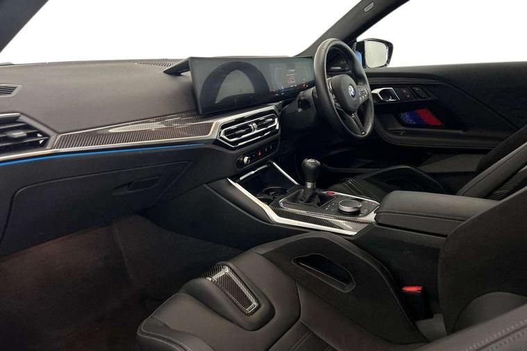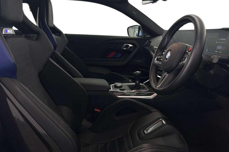 BMW ConnectedDrive online services, BMW legal emergency call, BMW Teleservices, Check control system, Configurable dashboard display, Cruise control with braking function, Digital owner's manual, Drive off assistant, Driver attention warning, Engine start button, Exterior temperature display, Live Cockpit Pro with head up display including 12.3" instrument cluster and 14.9" central display, M drive: DSC mode, engine characteristics, M Servotronic, M Drivelogic, adaptive M suspension, brake characteristics, M Sound Control, Oil sensor for level and grade, On board diagnostics, Parking assistant with reversing assistant, active PDC, lateral parking aid and rear view camera, PAS, Service interval indicator, Speed limiter, Start/stop system, Travel data recorder, Trip computer, Voice control for audio, climate, telephone, navigation, Widescreen display, M Adaptive suspension, M Drive Professional including track mode, laptimer, traction control & Drift analyser, M Sport differential, DAB tuner, Harman/Kardon surround sound system, USB port, Adaptive LED Headlights, Automatic headlamp activation, Automatic headlamp levelling, BMW Individual shadowline lights, Door mirror integrated indicators, Dynamic brake lights, Electric adjustable heated door mirrors, Extended High-gloss shadowline exterior trim: high-gloss black mirror caps and rear spoiler, tailpipe finishers in black chrome, Fading support, Follow me home headlights, Front and rear bumper system, Front electric windows, Headlight beam throw control, Heat protection, sun protection glazing, High beam assistant, Illuminated M highlighters, Interior rear view electrochromatic mirror with automatic anti dazzle function, LED 3rd brake light, LED daytime running lights, LED indicator lights, LED number plate light, LED rear lights, M carbon fibre roof, M high gloss shadowline exterior trim in mirror triangle cover, mirror cover panel, mirror bezel and window border, Mirror glass aspheric on driver's side, convex on passenger side, Rain sensor, Rear boot, Sun protection glass: darkened glass for rear screen and rear side windows, Variable front intermittent wipers, Welcome lighting, 12V power socket in front centre console with blanking plug, 2 cupholders, 2 rear head restraints, 2 rear seats, 3 spoke leather M multi-function steering wheel, Ambient lighting, Black velour front and rear floor mats, Carbon fibre interior trim including carbon applications on the steering wheel, Compartment in front of cupholder, Driver/passenger electric lumbar adjustment, Electrically adjustable front seats - driver seat with memory, Folding rear seat head rests, Front and rear door exit lights, Front and rear footwell lights, Front centre armrest, Front door pockets with bottle holders, Front door sill strips with aluminium inlays and M2 labelling, Front interior light, Front M Sport seats, Front reading lights, Glove compartment, Glovebox light, Heated front seats, Height adjustable front headrests, Illuminated armrest storage compartment, Illuminated M accents in front door, Isofix child seat for two outer rear seats, Luggage compartment lighting, M Anthracite headlining, Manually adjustable steering column, Rear armrest, Single front passenger seat, Steering column rake adjustment, Storage compartment in rear doors, Storage tray and compartment with cover in centre console, Through loading system with 40/20/40 split folding rear seat, Two zone automatic air conditioning, Vanity mirror lights, Connected package professional - M2, Extended storage pack - M2, Interior and exterior mirror pack - M2, 4 x 3 point seatbelts, ABS/EBD, Automatic Stability Control (ASC), Cornering brake control (CBC), Crash sensor, Curtain airbags, Driver/Front Passenger airbags, Dry braking, DSC - Dynamic Stability Control, Dynamic brake control, Electromechanical parking brake, Emergency door unlock, Front passenger airbag deactivation, Height adjustable front seatbelts, M seat belts, Seatbelt load limiter, Seatbelt pretensioners with load limiters, Seatbelt reminder, Tyre pressure sensor, Alarm system, Central locking, Drive away door locking, Immobiliser, Remote central locking, Tyre repair kit,