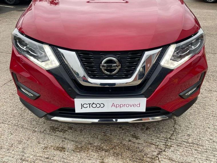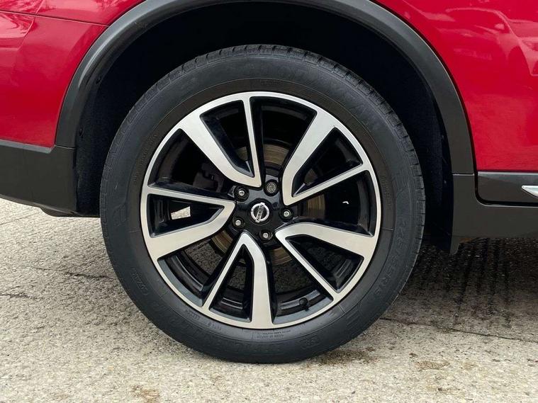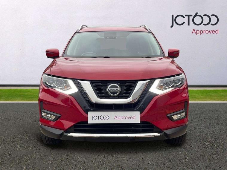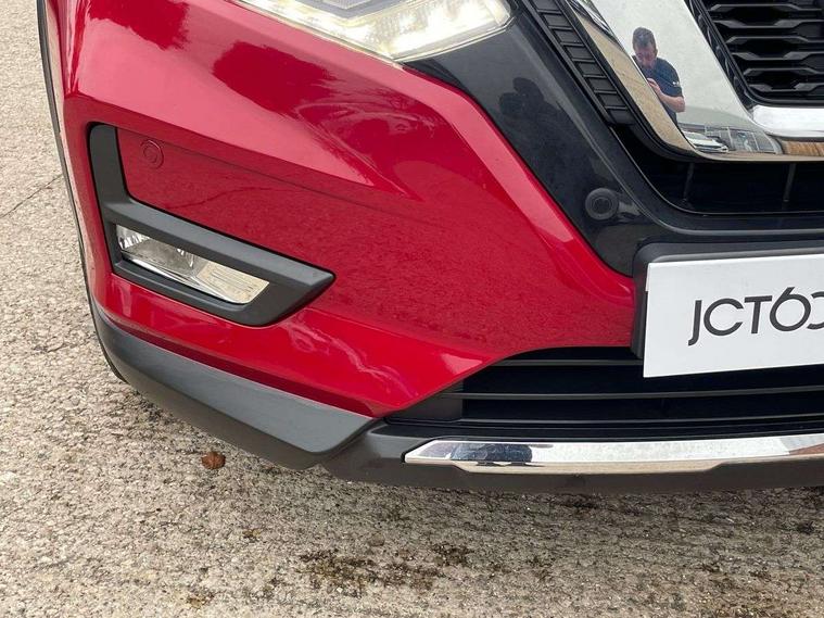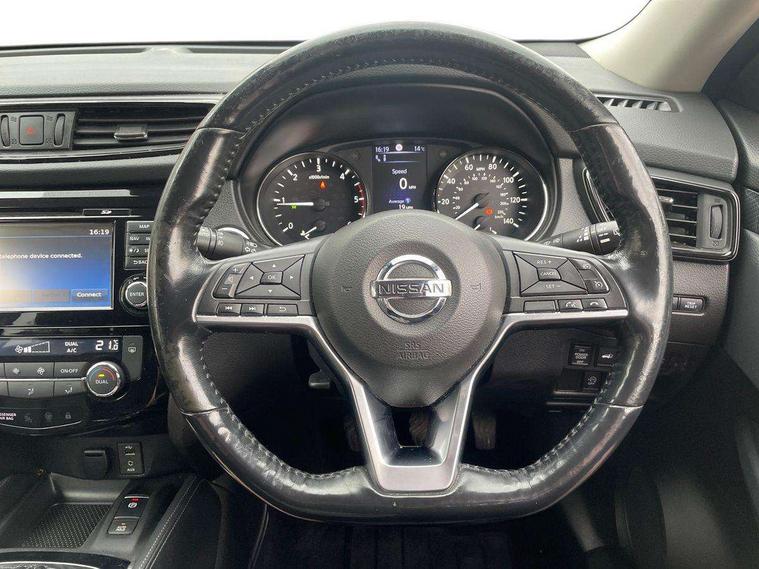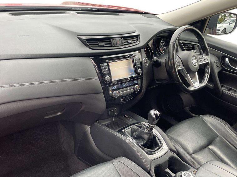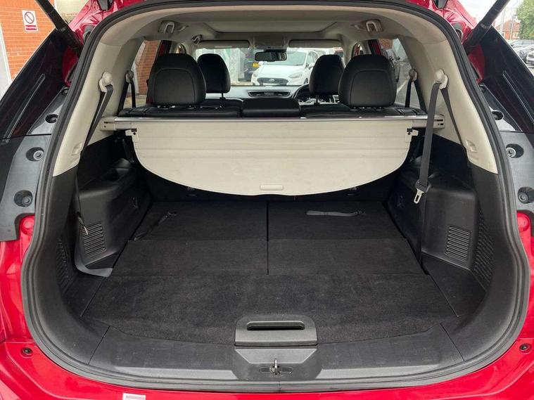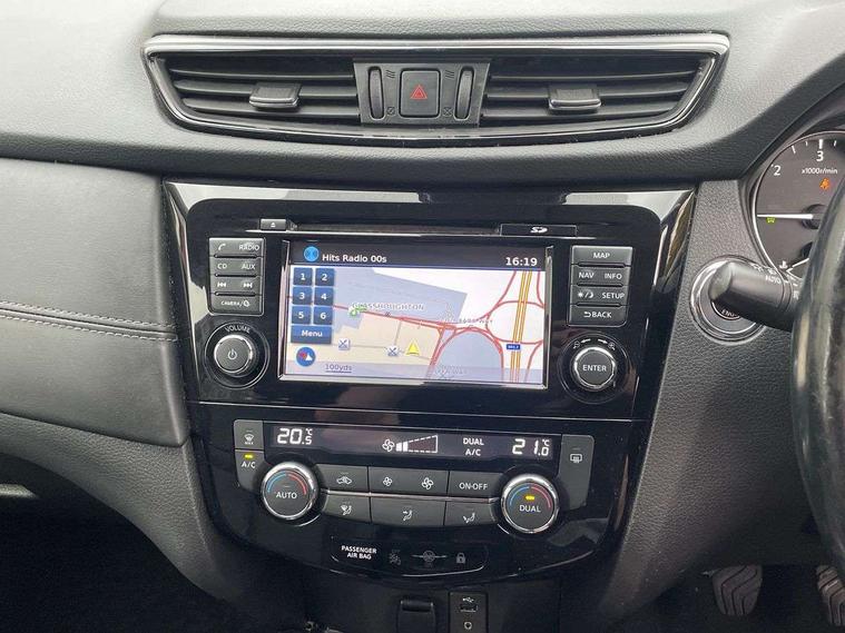 5" TFT driver information centre, Automatic tailgate opening, Blind spot monitoring, Bluetooth phone integration system, Driver attention alert system, Front and rear parking sensors, Intelligent around view monitor, Intelligent parking assist, Lane departure warning system, Moving object detection, Nissan connect evo 7" touchscreen navigation and entertainment system, PAS, Push button start, Stand still assist auto hold function, Traffic sign recognition, Trip computer, Nissan chassis control (intelligent ride control, intelligent trace control, intelligent engine brake), 6 speakers, DAB Digital radio, Radio/CD, Smartphone apps, Steering wheel mounted audio controls, USB/aux input socket, Adaptive front lighting system, Anti dazzle rear view mirror, Automatic headlights, Automatic rain sensing wipers, Black honeycomb front grille, Body colour door mirrors, Chrome door handles, Chrome side mouldings, Chrome window surround, Electric folding door mirrors, Electric heated door mirrors, Front and rear electric windows, Front fog lights, LED daytime running lights, LED Headlights, Panoramic sunroof with one touch shade, Rear privacy glass, Satin silver roof rails, Shark fin roof aerial, 3 rear headrests, 60/40 split rear bench seat, Centre console storage box/armrest, Configurable luggage board system, Driver's electric lumbar adjustment, Dual zone climate control, Electric adjustable front seats including height adjust, Front and rear door pockets with bottle holders, Front cupholders, Front/rear armrests, Heated front seats, Heated rear seats, Height adjustable front headrests, Individual rear reading lights, Isofix child seat attachment, Leather D shaped steering wheel, Leather steering wheel and gear knob, Pollen filter, Tilt/telescopic adjustable steering wheel, 3 point seatbelts on all seats, 6 airbags - Driver, front passenger, curtain and side airbags, ABS, Child locks on rear doors, EBD + Brake Assist, Electric parking brake, ESP + traction control, Intelligent emergency braking with pedestrian recognition, Seatbelt warning, Tyre pressure monitoring system, Immobiliser, Intelligent Key, Remote central locking, Thatcham Cat.1 alarm, Full size spare wheel,