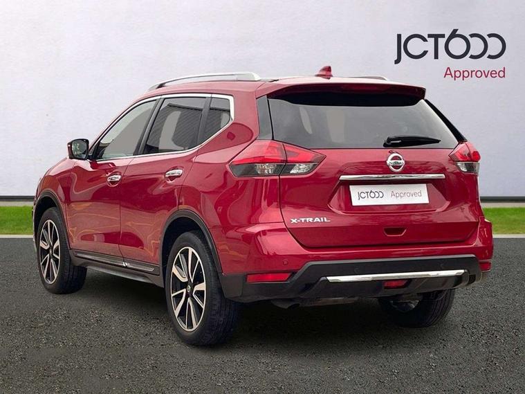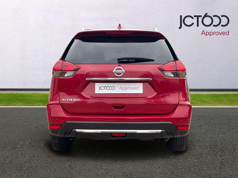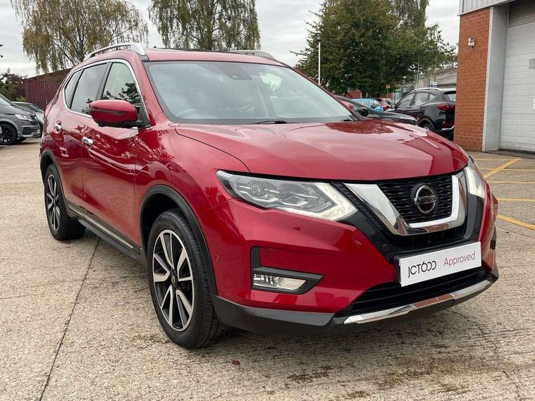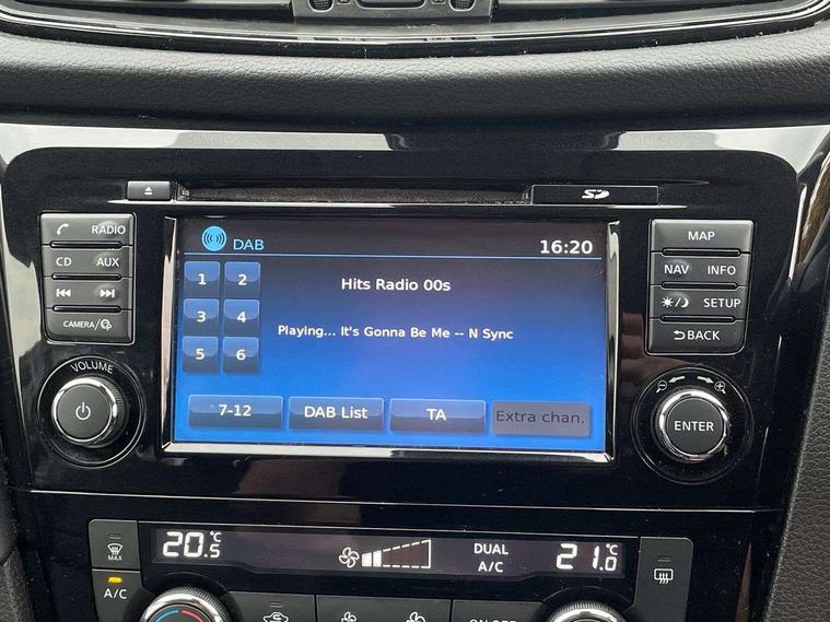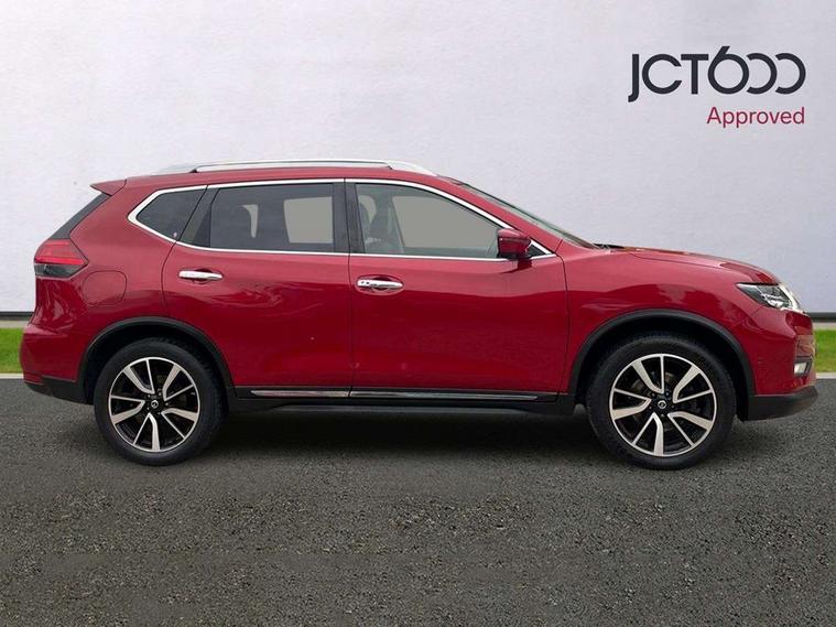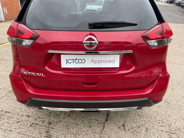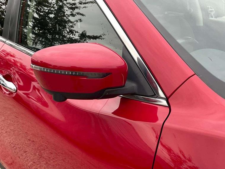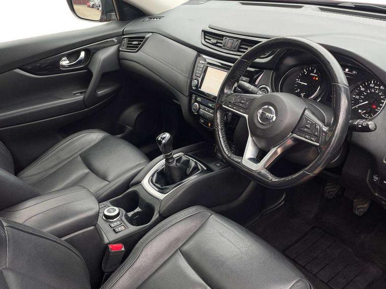 5" TFT driver information centre, Automatic tailgate opening, Blind spot monitoring, Bluetooth phone integration system, Driver attention alert system, Front and rear parking sensors, Intelligent around view monitor, Intelligent parking assist, Lane departure warning system, Moving object detection, Nissan connect evo 7" touchscreen navigation and entertainment system, PAS, Push button start, Stand still assist auto hold function, Traffic sign recognition, Trip computer, Nissan chassis control (intelligent ride control, intelligent trace control, intelligent engine brake), 6 speakers, DAB Digital radio, Radio/CD, Smartphone apps, Steering wheel mounted audio controls, USB/aux input socket, Adaptive front lighting system, Anti dazzle rear view mirror, Automatic headlights, Automatic rain sensing wipers, Black honeycomb front grille, Body colour door mirrors, Chrome door handles, Chrome side mouldings, Chrome window surround, Electric folding door mirrors, Electric heated door mirrors, Front and rear electric windows, Front fog lights, LED daytime running lights, LED Headlights, Panoramic sunroof with one touch shade, Rear privacy glass, Satin silver roof rails, Shark fin roof aerial, 3 rear headrests, 60/40 split rear bench seat, Centre console storage box/armrest, Configurable luggage board system, Driver's electric lumbar adjustment, Dual zone climate control, Electric adjustable front seats including height adjust, Front and rear door pockets with bottle holders, Front cupholders, Front/rear armrests, Heated front seats, Heated rear seats, Height adjustable front headrests, Individual rear reading lights, Isofix child seat attachment, Leather D shaped steering wheel, Leather steering wheel and gear knob, Pollen filter, Tilt/telescopic adjustable steering wheel, 3 point seatbelts on all seats, 6 airbags - Driver, front passenger, curtain and side airbags, ABS, Child locks on rear doors, EBD + Brake Assist, Electric parking brake, ESP + traction control, Intelligent emergency braking with pedestrian recognition, Seatbelt warning, Tyre pressure monitoring system, Immobiliser, Intelligent Key, Remote central locking, Thatcham Cat.1 alarm, Full size spare wheel,