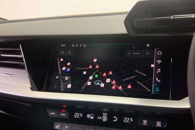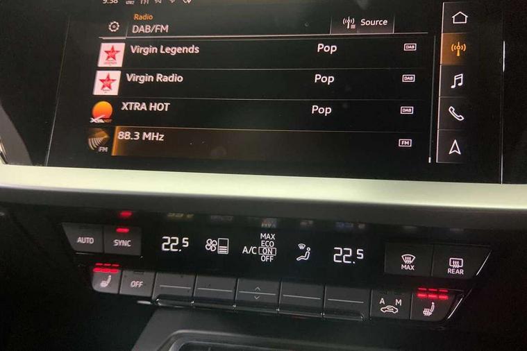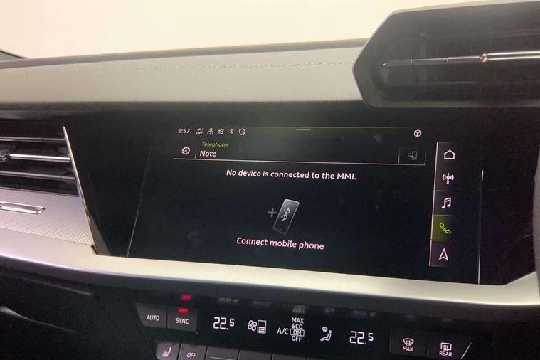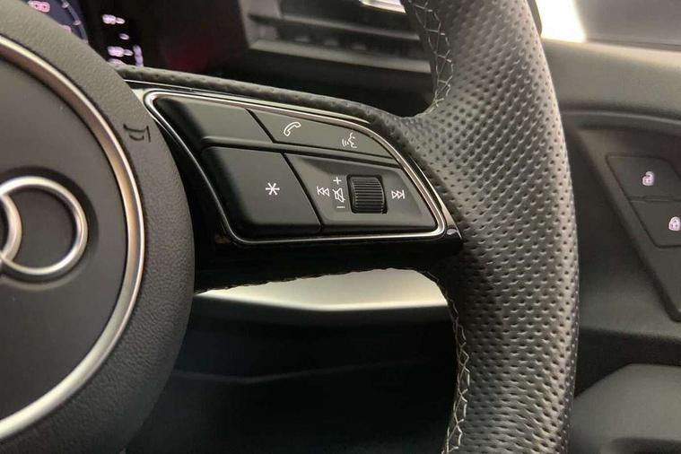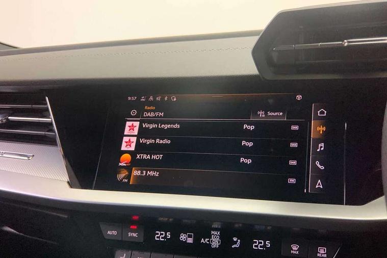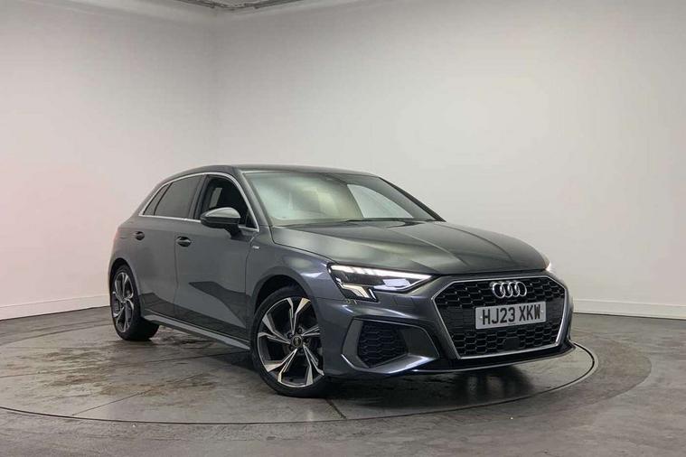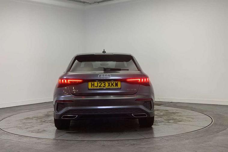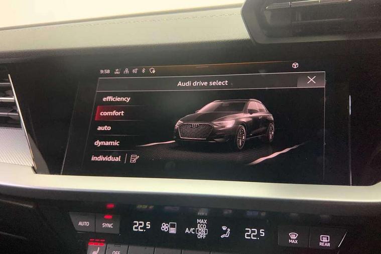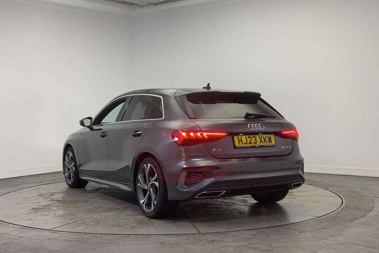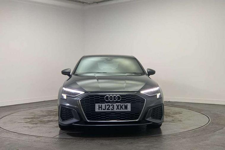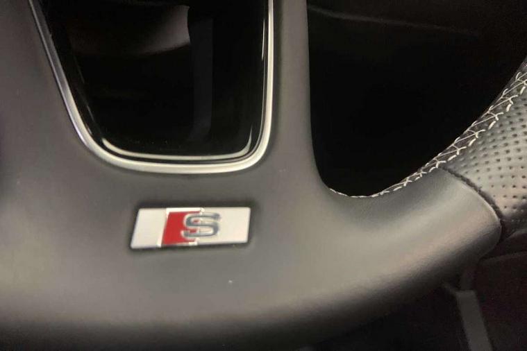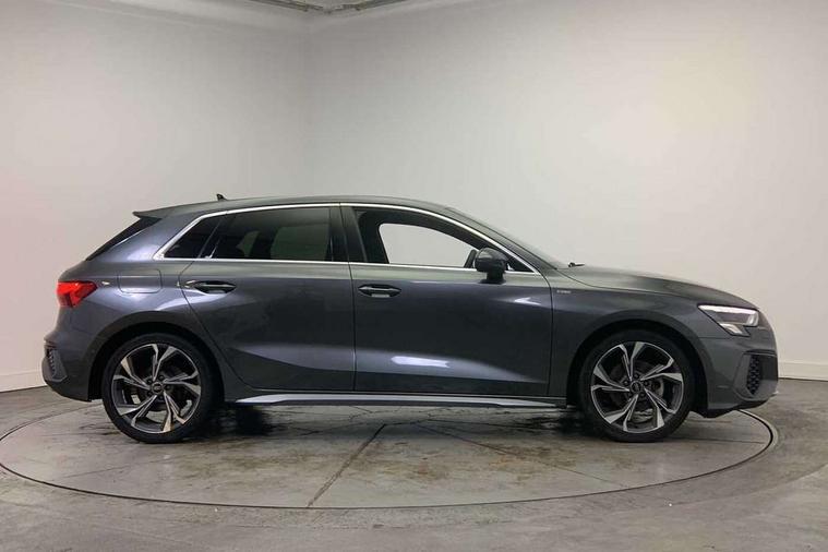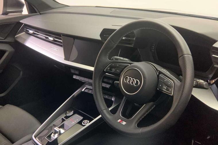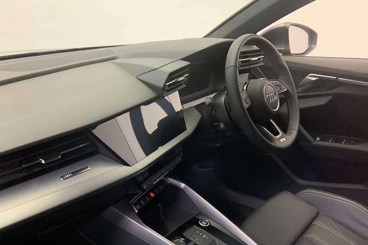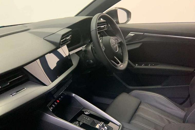 Audi drive select (Auto, Comfort, Dynamic, Efficiency and Individual), Audi smartphone interface, Audi Virtual Cockpit - 10.25" digital and colour instrument cluster, Automatic start/stop system with recuperation, Bluetooth interface, Collision avoidance assistant, e-Call (emergency call), Electromechanical power speed sensitive steering, Lane departure warning system, MMI Navigation Plus with high resolution 10.1" colour touch screen display, Service indicator, Trip computer, Voice control system with natural language interaction, Sports suspension, 2xUSB-C connection with data and charging functions, 6 passive loudspeakers, DAB Digital radio, 3rd brake light, Acoustic glass windscreen, Aluminium window trim, Auto dimming frameless rear view mirror, Body colour exterior mirrors, Electrically adjustable/heated/folding/auto dimming door mirrors with integrated LED indications + kerb view function for passenger side, Front electric windows, Illuminated aluminium inserts front door sills with S logo, LED daytime running lights, LED headlights with LED rear lights and dynamic rear indicators, Light and rain sensors, Privacy glass - dark tinted rear window, rear door and side windows, Rear electric windows, Rear side air outlets in grained matt black, Rear side wing doors, Rear wiper, S line bumpers, S roof spoiler, 12V socket and storage compartment in front centre console, 3 seat bench in 2nd row, 3 spoke leather multifunction steering wheel with paddle shift, 4 way electrically adjustable lumbar support for driver and front passenger, 60/40 split folding rear seat bench, Black cloth headlining, Dual zone electronic climate control, Front and rear centre armrest in leather, Front and rear headrests, Front/rear floor mats, Height and reach adjustable steering wheel, Interior lighting - glove compartment light and right hand side, Luggage compartment floor covering, Manual boot compartment lid, Manually adjustable front seats, Seat side bolsters, Single front passenger seat, Stainless steel pedals and front footrest in black, Twin leather upholstery with front sports seats S embossed logo, Aluminium interior elements pack - A3 Sportback, LED interior lighting pack - A3 Sportback, S line styling pack - A3 Sportback, 3x3 point rear seat belts, Driver and front passenger airbag with passenger airbag deactivation, Electronic Stabilisation Control (ESC) including ABS, ASR and EDL, First aid kit with warning triangle and 2 safety vests, Front side airbags with head airbags and interaction airbag, Pre-sense front with pedestrian and cyclist detection, Seatbelt monitoring, Tyre pressure loss indicator, Anti theft alarm, Anti-theft wheel bolts, Electronically operated child lock, Immobiliser, Remote control central locking, Dark spectrum aluminium inlays, accent surfaces in the dashboard and centre console in platinum grey silk effect paint finish,