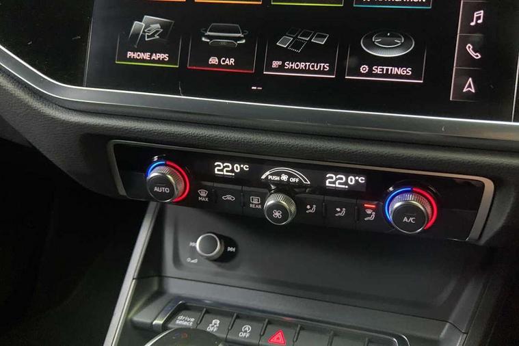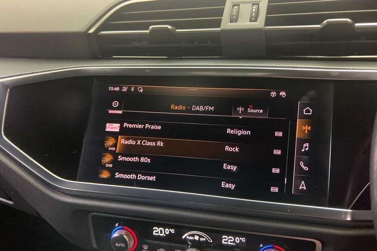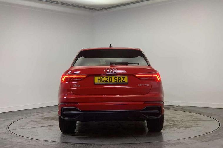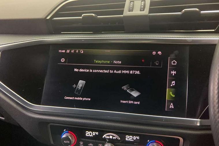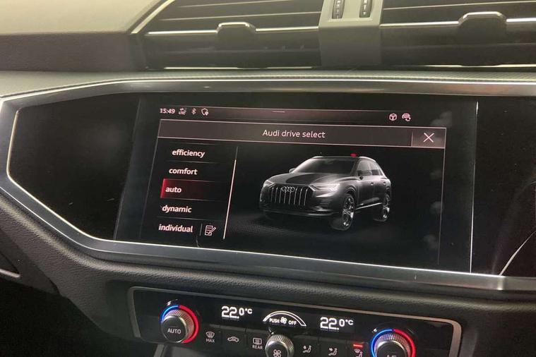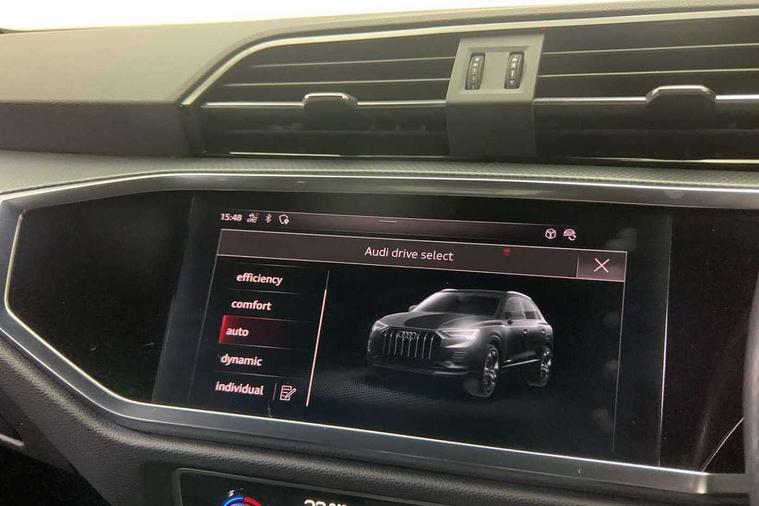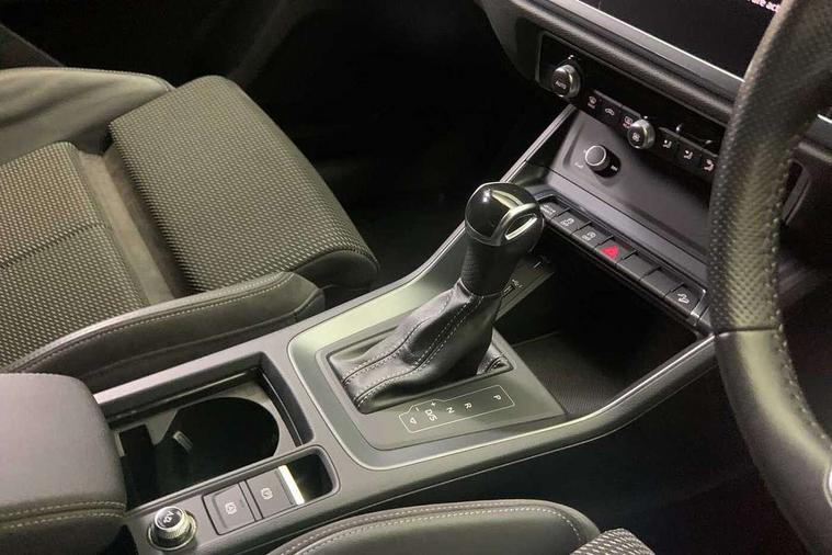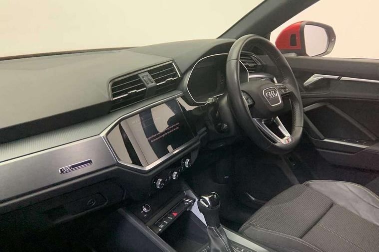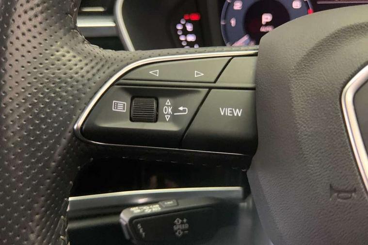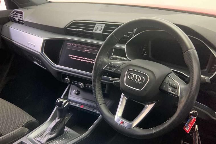 Audi connect safety and service (e-call), Audi drive select, Audi lane departure warning, Audi side assist, Audi smartphone interface includes wireless Apple carplay/Android Auto, Audi Virtual Cockpit - 10.25" display, Bluetooth interface, Camera based traffic sign recognition, MMI Navigation Plus with high resolution 10.1 inch touchscreen colour display, Power operated tailgate, Progressive steering, Service interval indicator, Start stop system with recuperation, Voice control system with natural language interaction, 48V Mild hybrid technology, Sports suspension, 1 x USB type C and 1 USB type A charging points, 6 passive loudspeakers, DAB digital radio module, Acoustic windscreen, Aluminium roof rails, Aluminium window trim, Auto dimming frameless rear view mirror, Body coloured bumpers, Electrically folding, adjustable and heated door mirrors with integrated LED side indicators and kerb view function for passenger side, Front and rear electric windows, Front fog lights, Front side air inlets in matt platinum grey, Front spoiler blade in matt platinum grey, Grille vertical bars in aluminium silver/Matt, High gloss black finish B and C pillars, LED headlights with LED daytime running lights and dynamic rear indicator, LED rear lights, Privacy glass dark tinted rear and rear-side windows (from B-pillar backwards), Rain and light sensors, Rear diffuser strip in matt titanium black, S line badges on front wings, S Line front and rear bumpers, Side skirt insert in matt Platinium grey, Silver chrome grille surround, Titanium black radiator grille, 12V socket in rear centre console, 40:20:40 folding with manual adjustment for 60:40 forwards/backwards position and backrest angle, Adjustable rear seat bench/backrest with centre armrest and cupholder, Black cloth headlining, Dual zone electronic climate control, Front and rear black floor mats with contrast stitching in rock grey, Front and rear headrests, Front and rear roof module including reading lights, Front centre armrest, Glove compartment lighting, Height and reach adjustable steering wheel, Illuminated door sill trims with S logo, ISOFIX child seat mounting for front passenger with airbag deactivation and outer rear seat including top tether attachment point for outer rear seats, Luggage compartment light, Manual front seats with height adjustment, Perforated leather gearknob, Stainless steel luggage compartment sill finisher, Stainless steel pedals, Non smoking pack - Q3, 3x3 point rear seatbelts, 6 airbags - Driver, front passenger, curtain and side windows, Audi pre-sense front with pedestrain and cyclist recognition, Electrically operated child locks on rear doors, Electromechanical parking brake, Electronic stabilisation control including ABS, ASR and EDL, Hill descent control, Hill hold assist, Pre sense basic, Seatbelt monitoring, Tyre pressure warning, Warning triangle and first aid kit, Anti theft alarm, Anti theft wheel bolts, Remote central locking, Dark matt brushed aluminium inlay, Detail dashboard around MMI touch colour display in glass look, black with surround in aluminium look, Leatherette door armrest, Tool kit, Tyre repair kit,