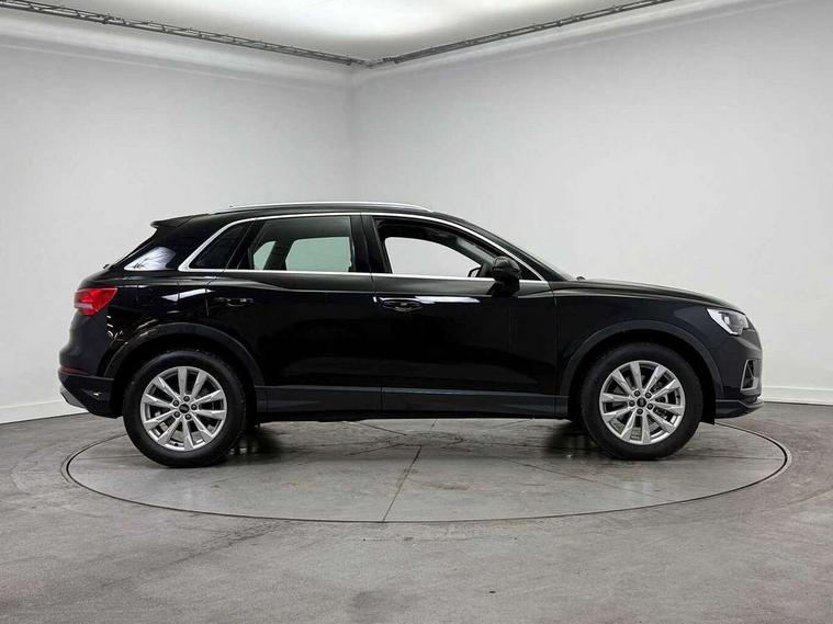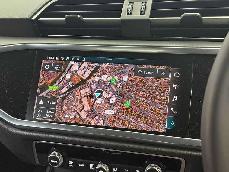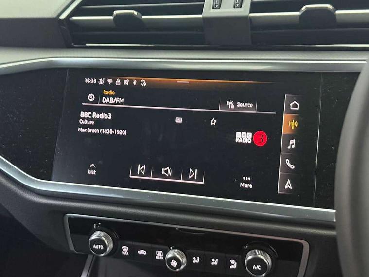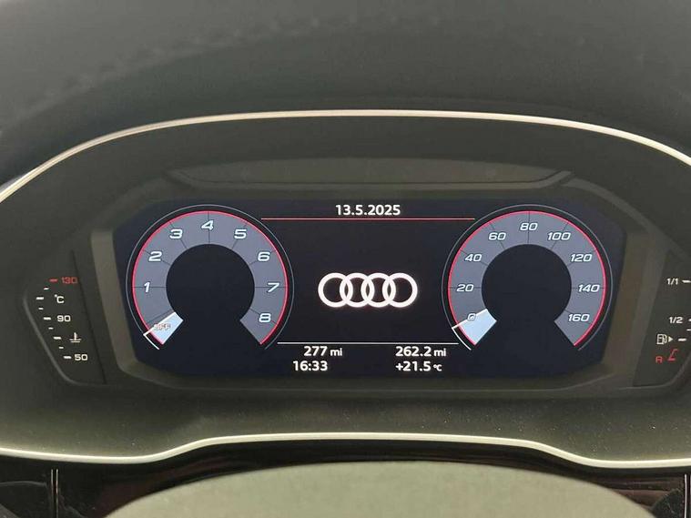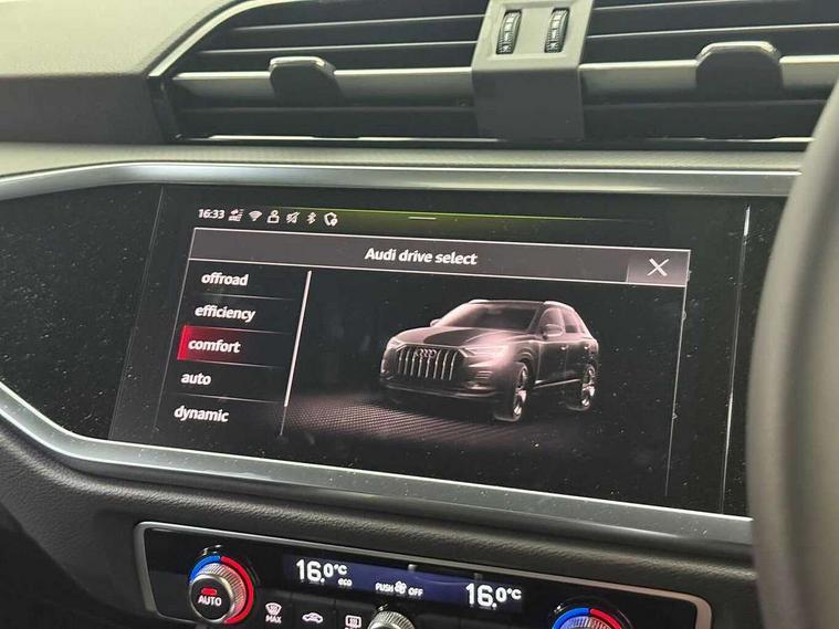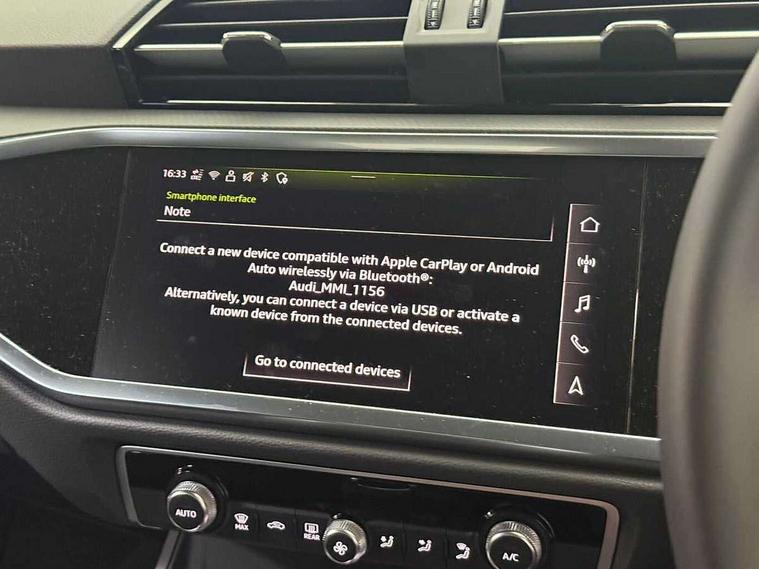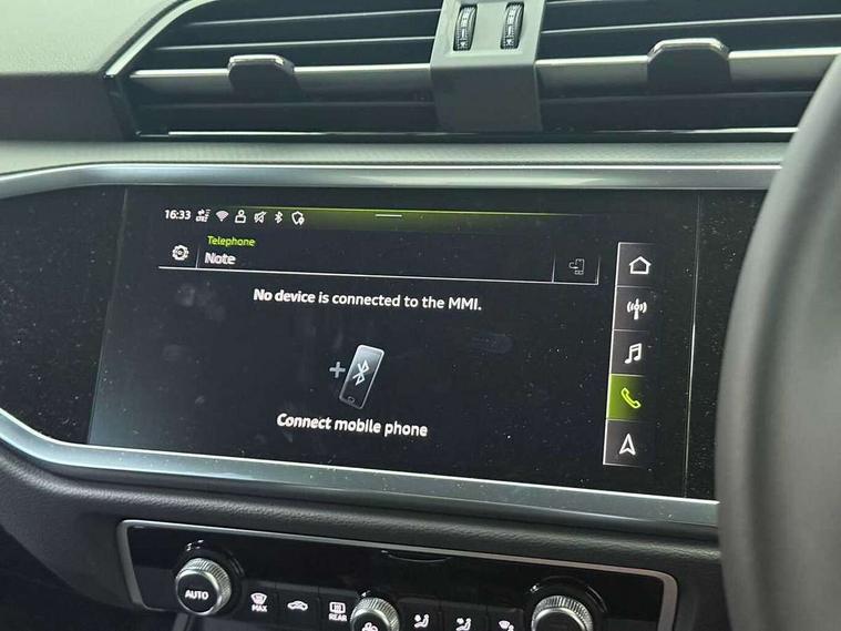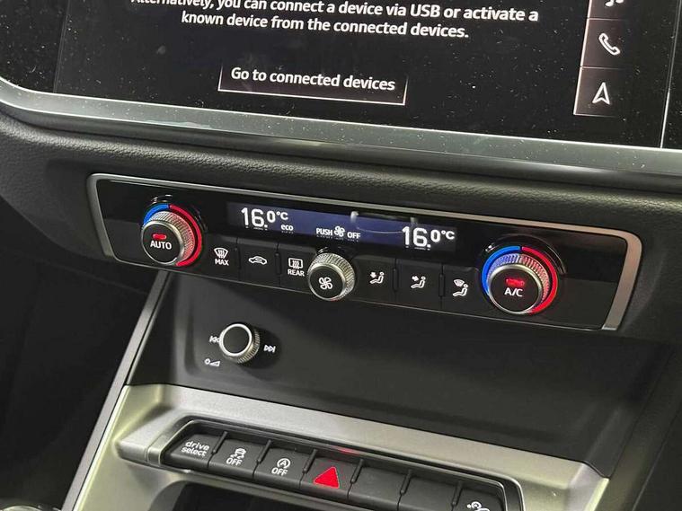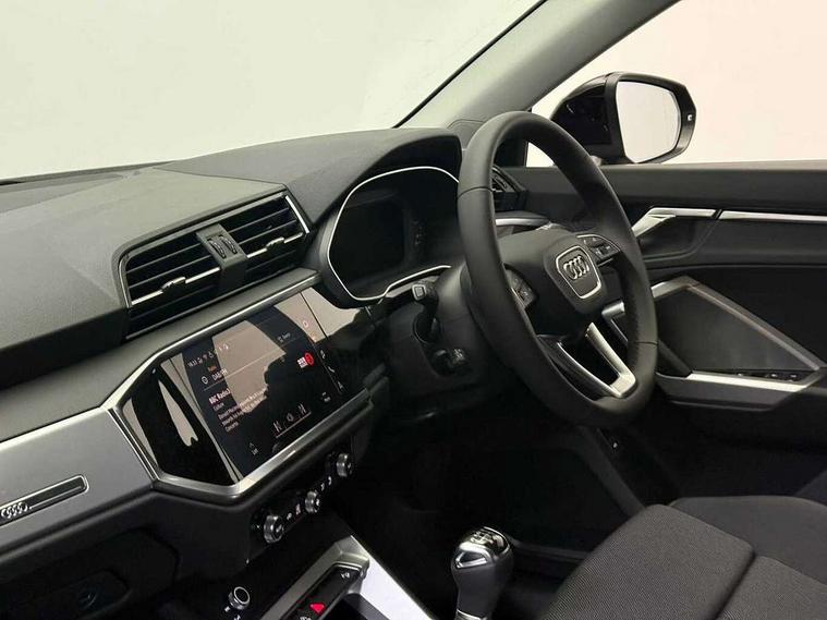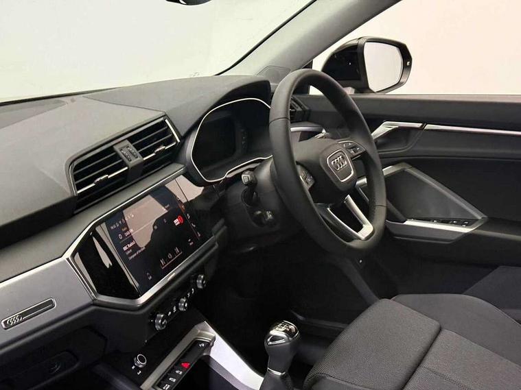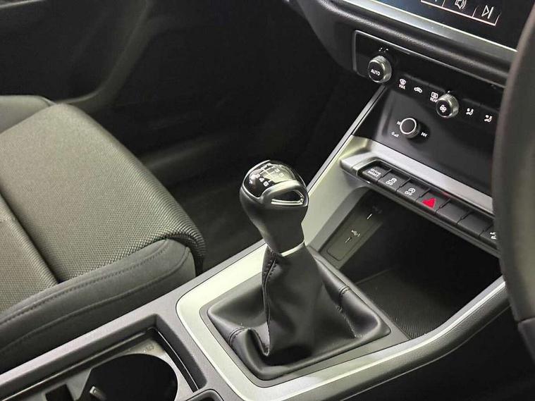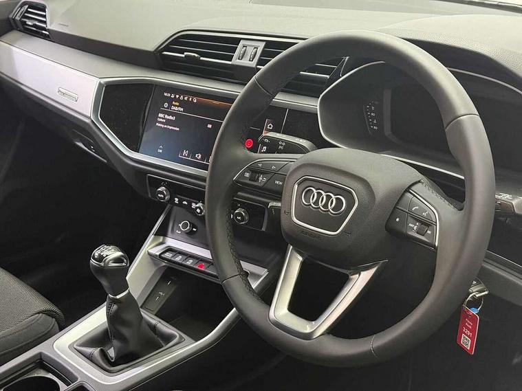 Amazon alexa Integration, Audi connect safety and service, Audi drive select, Audi lane departure warning, Audi Virtual Cockpit - 10.25" display, Bluetooth interface, Camera based traffic sign recognition, Cruise control + speed limiter, Distraction and Fatigue warning, Legal emergency call, MMI Navigation Plus with high resolution 10.1 inch touchscreen colour display, Power operated tailgate, Progressive steering, Rear parking sensors, Service interval indicator, Smartphone interface includes wireless Apple carplay/Android Auto, Start stop system with recuperation, Voice control system with natural language interaction, Standard suspension, 2 USB-C ports with charge and data functions, 6 passive loudspeakers, DAB digital radio module, Acoustic windscreen, Aluminium roof rails, Aluminium window trim, Anthracite black radiator grille, Auto dimming door mirrors, Auto dimming frameless rear view mirror, Electrically folding, adjustable and heated door mirrors with integrated LED side indicators and kerb view function for passenger side, Front and rear bumpers, wheel arch trims and side sill trims in contrasting Manhattan grey paint finish, Front and rear electric windows, Front fog lights, Front side air inlets in matt selenite silver, Front spoiler in matt selenite silver, Grille vertical bars in aluminium silver/Matt, High gloss black finish B and C pillars, LED headlights with LED daytime running lights, LED third brake light, Rain and light sensors, Rear diffuser strip in matt selenite silver, Rear side wing doors, Rear wiper, Variable front intermittent wipers, 12V socket in rear centre console, 3 seat bench in 2nd row, 3 spoke multi-function leather steering wheel, 40:20:40 folding with manual adjustment for 60:40 forwards/backwards position and backrest angle, Door sill trims with aluminium inlay, Dual zone electronic climate control, Electric lumbar support, Front and rear floor mats, Front and rear headrests, Front centre armrest, Height and reach adjustable steering wheel, ISOFIX child seat mounting for front passenger with airbag deactivation and outer rear seat including top tether attachment point for outer rear seats, Lunar silver cloth headlining, Manual front seats with height adjustment, Single front passenger seat, Stainless steel luggage compartment sill finisher, Non smoking pack - Q3, 3x3 point rear seatbelts, 6 airbags - Driver, front passenger, curtain and side windows, Audi pre-sense front with pedestrain and cyclist recognition, Electrically operated child locks on rear doors, Electromechanical parking brake, Electronic stabilisation control including ABS, ASR and EDL, Front seatbelt reminder, Hill descent control, Hill hold assist, Pre sense basic, Seatbelt monitoring, Tyre pressure warning, Warning triangle and first aid kit, Anti theft wheel bolts, Immobiliser, Remote central locking, Thatcham approved category 1 anti theft alarm, Aluminium look interior elements, Detail dashboard around MMI touch colour display in glass look, black with surround in aluminium look, Micrometallic silver inlay,
