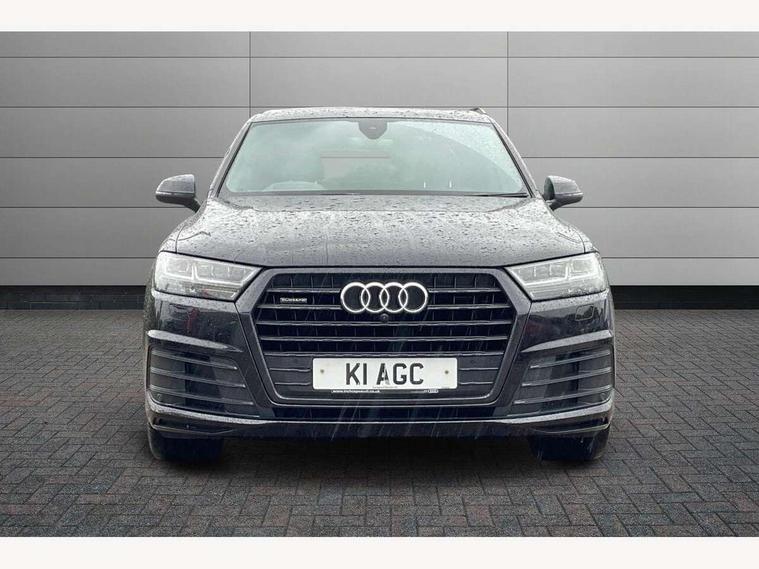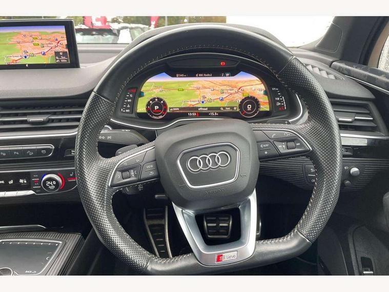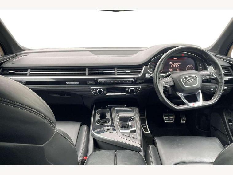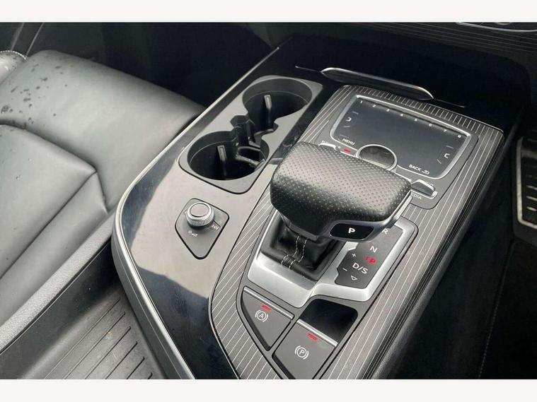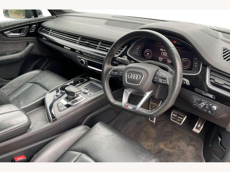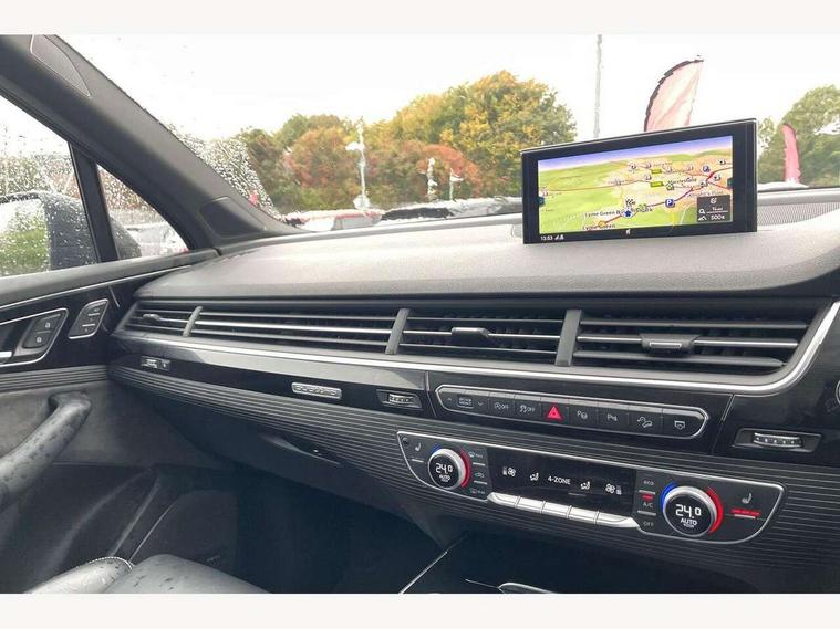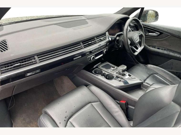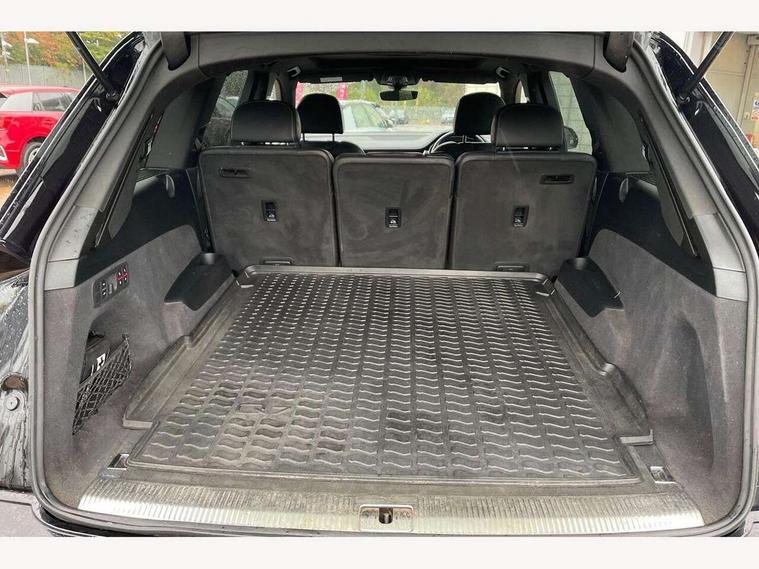 Audi drive select, Audi smartphone interface, MMI - Multi Media Interface control system, MMI navigation plus with touch and 8" colour display, DVD, SD card reader, 10GB music storage, Mobile phone preparation with bluetooth interface, Remote electric boot opening/closing, Service interval indicator, Servotronic speed related PAS, Speed limiter, Voice control system, Adaptive air suspension, 2 USB ports, Audi music interface, Aux-in socket, DAB digital radio module, MMI radio plus, Acoustic windscreen, Auto dimming rear view mirror, Body coloured bumpers, Dynamic rear indicators, Electric front+rear windows, Electric panoramic glass sunroof, Headlight washers, High beam assist, LED daytime running lights, LED tail lights, Loading sill protector in stainless steel, Platinum grey front lip spoiler, Rain and light sensors, Rear wiper, Roof spoiler, 2 cupholders in front centre console, 35/30/35 split fold 2nd row seats, 4 way electrically adjustable lumbar support for drivers seat, 4 way electrically adjustable lumbar support for front passenger seat, Electric 3rd row 50/50 split/fold, Electric adjustable front seats, Four zone electronic climate control, Front ashtray and cigar lighter, Front centre comfort armrest with storage + cupholders, Front head restraints, Front sports seats, Front/rear floor mats, Gearshift paddles, Heated front seats, ISOFIX on front passenger and rear outer seats, Leather gear knob, Luggage compartment cover, Rear centre armrest with 2 cupholders, Rear headrests, Stainless steel pedals, Sunvisors with illuminated vanity mirrors, Top tether anchor plate for isofix child seat, Valcona leather upholstery, Extended LED interior multi coloured lighting pack - Q7, Interior light pack - Q7, Titanium black styling pack - Q7, 3 point seatbelts on all seats, ABS+Electronic Brake force Distribution, Curtain airbags, Driver and passenger airbags, EDL + ASR, Electrically operated child locks on rear doors, Electromechanical parking brake, ESP, Front passenger airbag deactivation, Front side airbags, Hill descent control, Hill hold assist, Seatbelt warning, Traction control, Tyre pressure monitoring system, Warning triangle and first aid kit, Alarm with interior monitoring, Immobiliser, Keyless Go access/ignition system, Locking wheel bolts, Remote central locking, Chrome door inserts, Tool kit, Tyre repair kit,