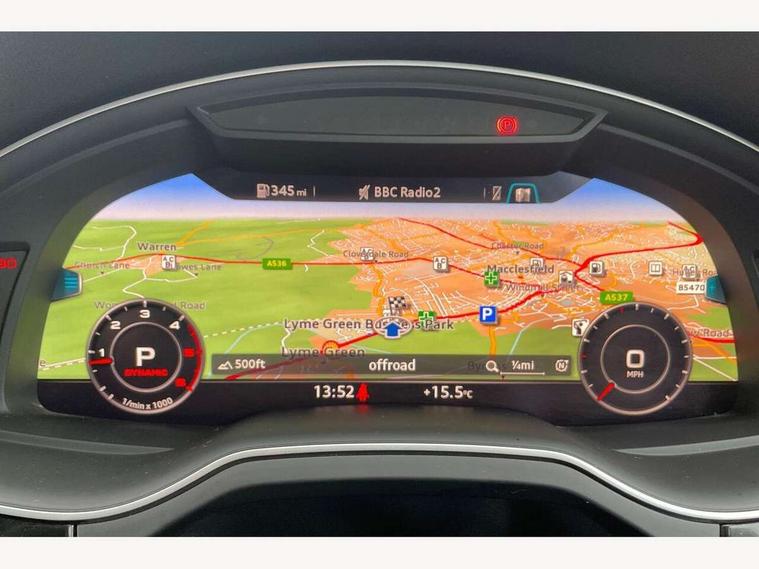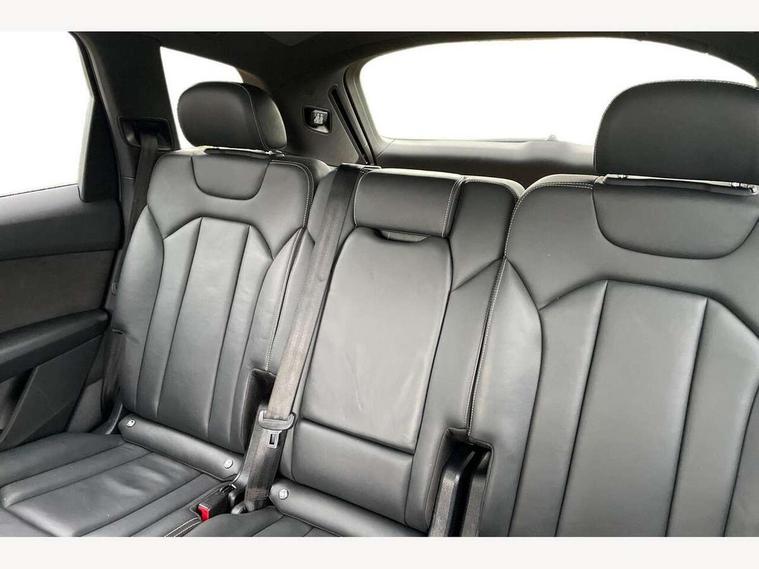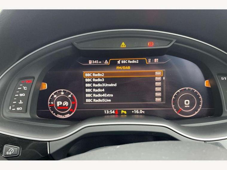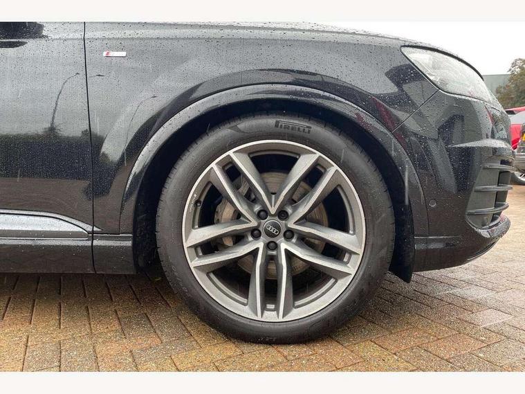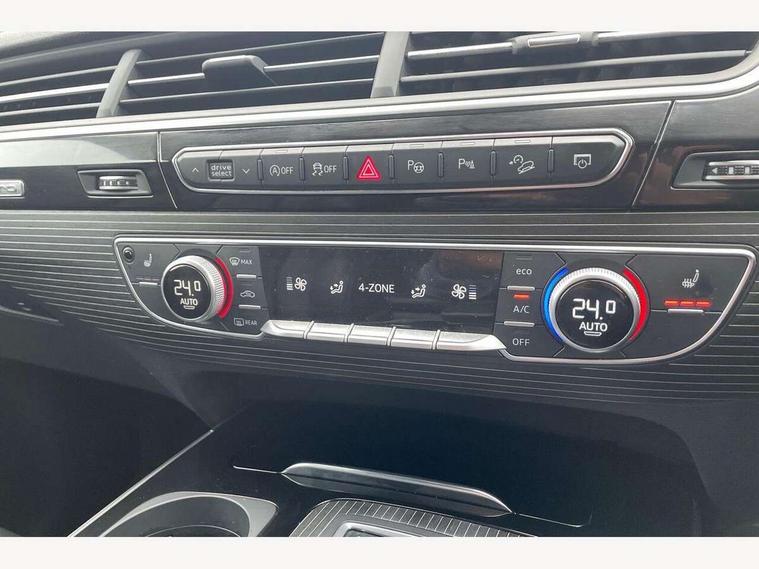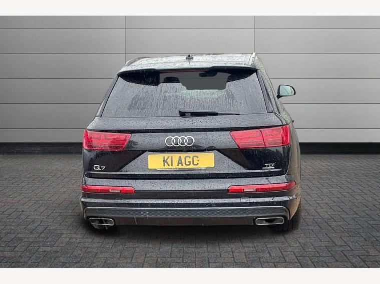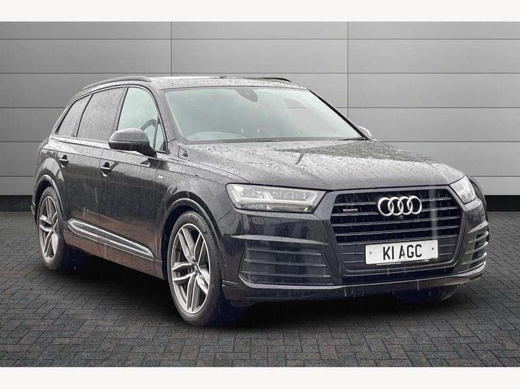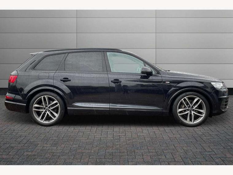 Audi drive select, Audi smartphone interface, MMI - Multi Media Interface control system, MMI navigation plus with touch and 8" colour display, DVD, SD card reader, 10GB music storage, Mobile phone preparation with bluetooth interface, Remote electric boot opening/closing, Service interval indicator, Servotronic speed related PAS, Speed limiter, Voice control system, Adaptive air suspension, 2 USB ports, Audi music interface, Aux-in socket, DAB digital radio module, MMI radio plus, Acoustic windscreen, Auto dimming rear view mirror, Body coloured bumpers, Dynamic rear indicators, Electric front+rear windows, Electric panoramic glass sunroof, Headlight washers, High beam assist, LED daytime running lights, LED tail lights, Loading sill protector in stainless steel, Platinum grey front lip spoiler, Rain and light sensors, Rear wiper, Roof spoiler, 2 cupholders in front centre console, 35/30/35 split fold 2nd row seats, 4 way electrically adjustable lumbar support for drivers seat, 4 way electrically adjustable lumbar support for front passenger seat, Electric 3rd row 50/50 split/fold, Electric adjustable front seats, Four zone electronic climate control, Front ashtray and cigar lighter, Front centre comfort armrest with storage + cupholders, Front head restraints, Front sports seats, Front/rear floor mats, Gearshift paddles, Heated front seats, ISOFIX on front passenger and rear outer seats, Leather gear knob, Luggage compartment cover, Rear centre armrest with 2 cupholders, Rear headrests, Stainless steel pedals, Sunvisors with illuminated vanity mirrors, Top tether anchor plate for isofix child seat, Valcona leather upholstery, Extended LED interior multi coloured lighting pack - Q7, Interior light pack - Q7, Titanium black styling pack - Q7, 3 point seatbelts on all seats, ABS+Electronic Brake force Distribution, Curtain airbags, Driver and passenger airbags, EDL + ASR, Electrically operated child locks on rear doors, Electromechanical parking brake, ESP, Front passenger airbag deactivation, Front side airbags, Hill descent control, Hill hold assist, Seatbelt warning, Traction control, Tyre pressure monitoring system, Warning triangle and first aid kit, Alarm with interior monitoring, Immobiliser, Keyless Go access/ignition system, Locking wheel bolts, Remote central locking, Chrome door inserts, Tool kit, Tyre repair kit,