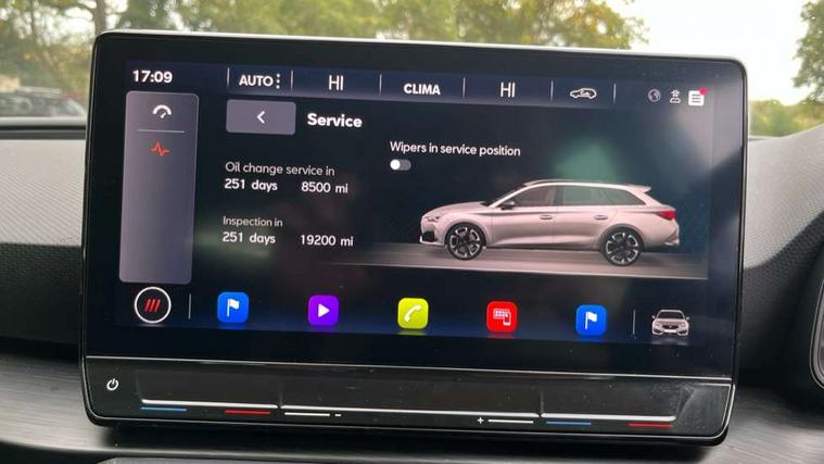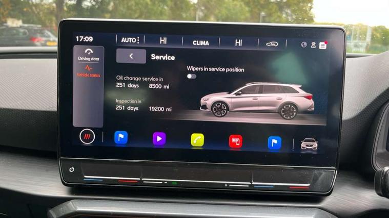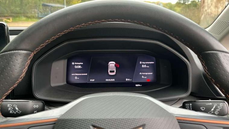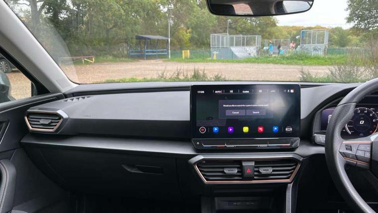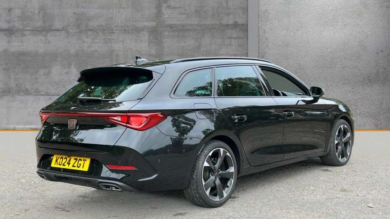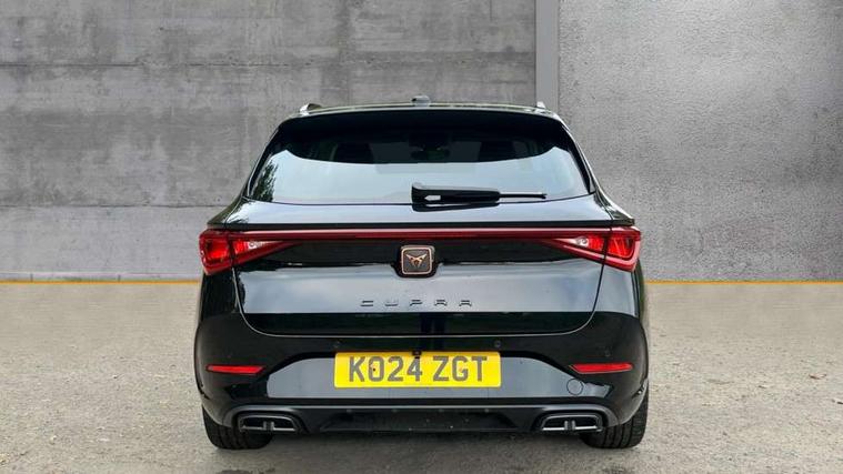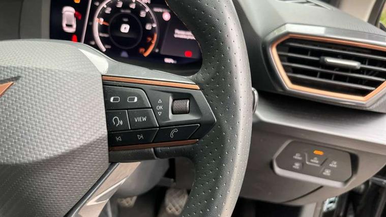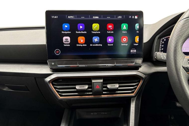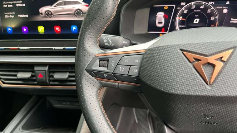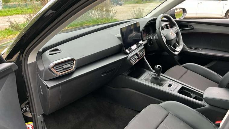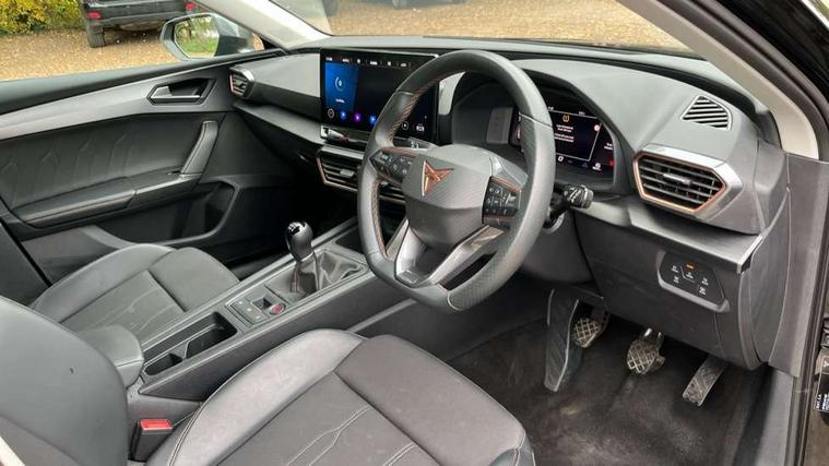 CUPRA drive profile selection with (Comfort/Sport/Individual), throttle response and gearshift mode, Digital cockpit, E-call, Electro mechanical speed sensitive power steering, Four x USB Type C ports (2 in front and 2 in rear), Front assist with forward collision warning braking reaction to vehicles, pedestrians and cyclists, Full link smartphone integration with Mirror Link, wireless Apple CarPlay and wired Google Android Auto, Lane assist, Lockable tailgate, Park assist (inc front/rear parking sensors), Rear view camera, RPM, trip computer, outside temp gauge, instrument light brightness, low fuel warning light, lights on reminder, gearshift indicator, Service interval indicator, Start/stop system with regenerative braking, Wireless phone charger, Sports suspension, Auxiliary input socket, Auto dimming rear view mirror, Body colour door handles, Body coloured bumpers, Cupra sports bumpers, Dark tinted rear windows, Electric front/rear windows, Electrically adjustable, heated and folding door mirrors, Gloss black roof rails, LED front fog lamps with cornering function, LED headlights with dynamic turn signals, tail lights, rear fog lights with rear coast to coast lighting, Rain sensing wipers, Rear diffuser with twin exhaust pipe on each side, Rear side wing doors, Rear wash/wipe, Separate daytime running light with automatic headlight control and coming home feature, Third brake light, 12v power supply in centre console, 12v socket in loadspace, 3 seat bench in 2nd row, 5 headrests, 60/40 split rear bench seat with armrest, Ambient lighting with glovebox, footwell and single monocolour, Cupra Leather flat bottomed, perforated steering wheel, Driver/passenger manual seat height adjustment, Front and rear reading lights X 4, Front centre armrest, Front seats manual lumbar adjustment, Grey headlining, Height/reach adjust steering wheel, Illuminated interior front door sills, ISOFIX points in outer rear seats with top tether anchorage points, Jack and tool kit, PVC/Cloth upholstery with copper stitching, Single front passenger seat, Sliding boot cover, Sports seats, Sunvisors with illuminated mirror, Three zone climate control, Media system plus with navigation pack - Leon Cupra, Safety and driving pack (M) - Cupra leon, 3 point seatbelts on all rear seats, ABS, Brake control system - ESC and brake booster, Child proof door locks, Cupra black brake calipers, Driver and front passenger airbags with front passenger airbag de-activation, front side and curtain airbags, Electronic parking brake, Extended safety system - seat belt tensioner, window closure and hazard lights, Hill hold control, Rear disc brakes, Seat belt reminder for front and rear seats, Tiredness recognition system, Tyre pressure monitoring system, Anti theft alarm system with interior monitoring in cab, backup horn and towing protection, KESSY Advanced - Keyless start, keyless entry, Locking wheel bolts, Chrome and copper interior detailing, 18" Machined sport black and silver alloy wheels with 92Y tyres,