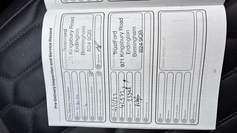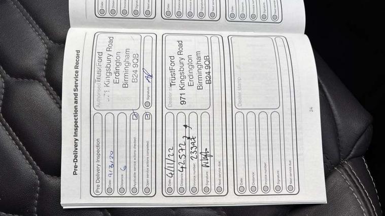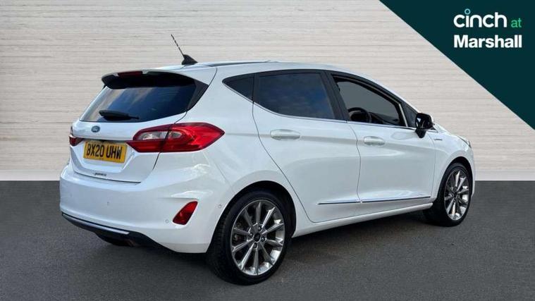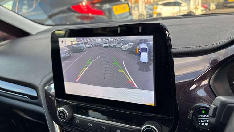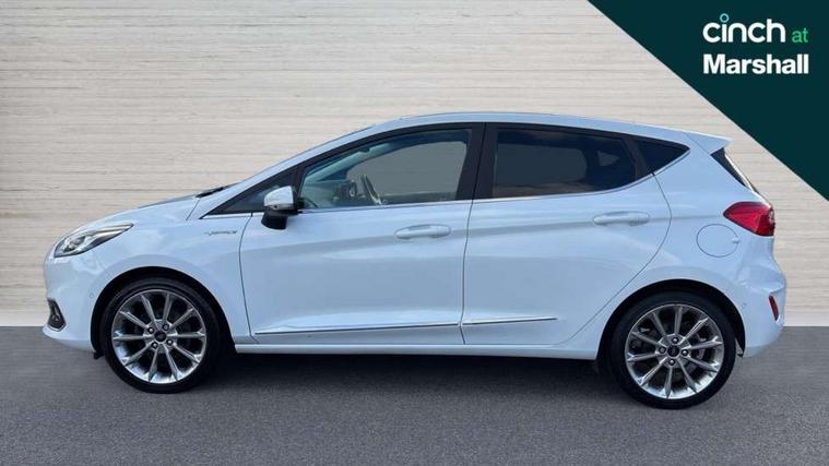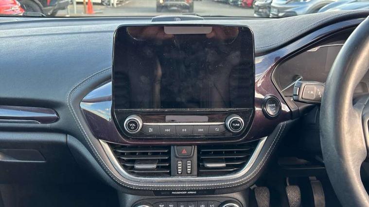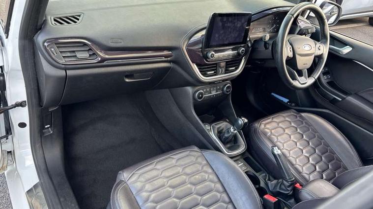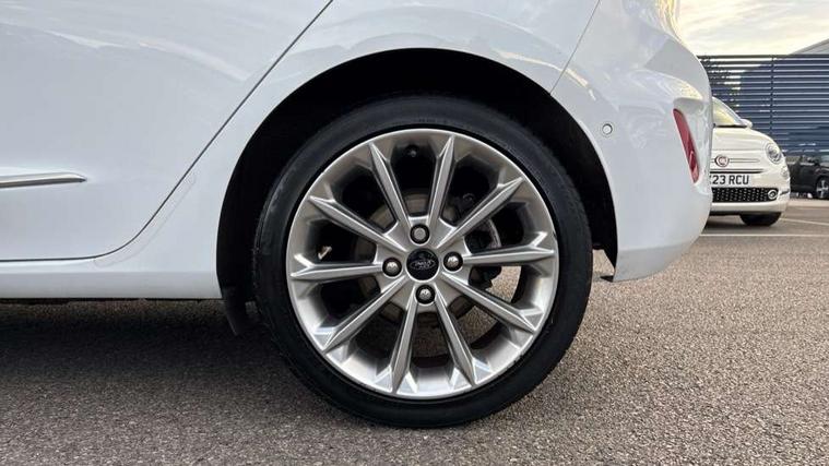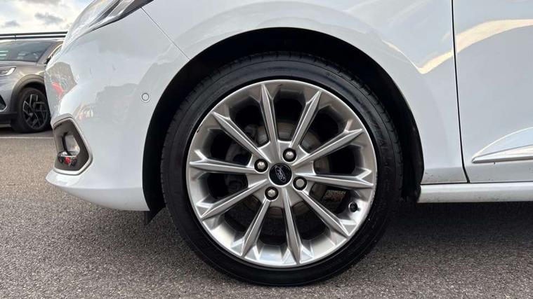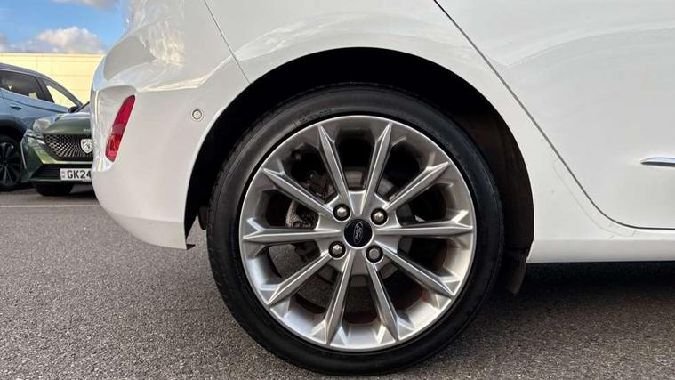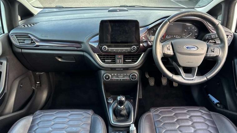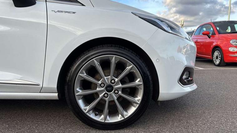 Bluetooth system, Electric power steering, Ford easy fuel, Trip computer, 2 USB ports, Auxiliary input socket, B&O Premium audio system with 8" touchscreen, 10 speakers, 360 degree sound system, Ford SYNC 3 navigation system and Ford pass connect, DAB Digital radio, Steering wheel mounted controls, Auto dimming rear view mirror, Body colour bumpers, Body colour door handles, Body colour electric adjustable heated door mirrors with integral indicators, Body colour rear spoiler, Chrome beltline trim, Chrome door handles, Chrome lower window surround, Cornering front fog lights, Electric front windows/one touch facility, Electric rear windows, LED Night signature to rear lights, LED rear lights, Openable panorama roof, Power foldable door mirrors with puddle lights, Privacy glass, Quickclear heated windscreen, Rain sensing wipers and auto dimming rear view mirror, Rear privacy glass, Rear wiper, Tinted glass, Unique Vignale front grille & bodystyling, Vignale front door threshold plates, Vignale rear & wing badges, 12V Accessory socket in centre console, 3 spoke leather trimmed steering wheel with audio control, 60/40 split folding rear seat, Adjustable head restraints, Air conditioning + Electric Auto Temperature Control (EATC), Ambient lighting, Boot carpet, Centre console with armrest and illuminated cupholders, Chrome inner door handles, Drivers and Passenger lumbar support, Footwell illumination, Front map reading lights, Front seat and rear pockets, Front/rear floor mats, Illuminated glovebox, Leather gear knob, Leather trimmed handbrake handle, Leather upholstery, Load area light, Luxury woven headliner, Overhead console with sunglasses holder, Pollen filter, Rake/reach adjustable steering wheel, Rear centre head restraint, Comfort Pack - Fiesta, NCAP Pack - Fiesta, Rear view camera pack - Fiesta, 3 point seatbelts on all rear seats, ABS+EBA, Curtain airbags, Driver and passenger airbags, Drivers knee airbag, Electronic stability control with hill start assist, Front passenger airbag deactivation, Front side airbags, Seatbelt warning, Tyre pressure monitoring system, Ford keyfree system with Keyless entry and keyless start with two remote keys, MyKey system, Remote central locking & engine immobiliser, Thatcham Cat.1 alarm, Tyre repair kit,