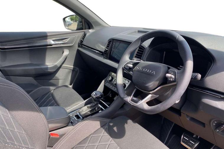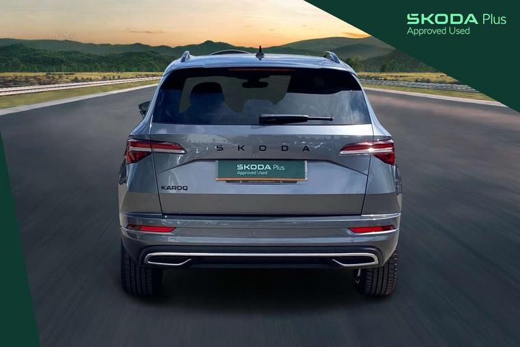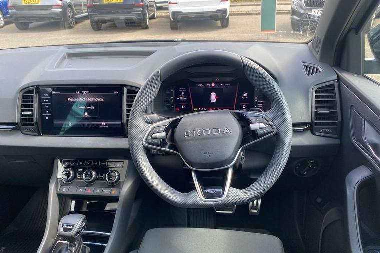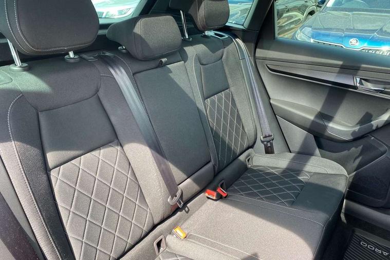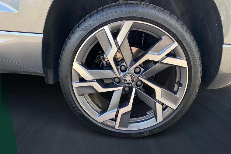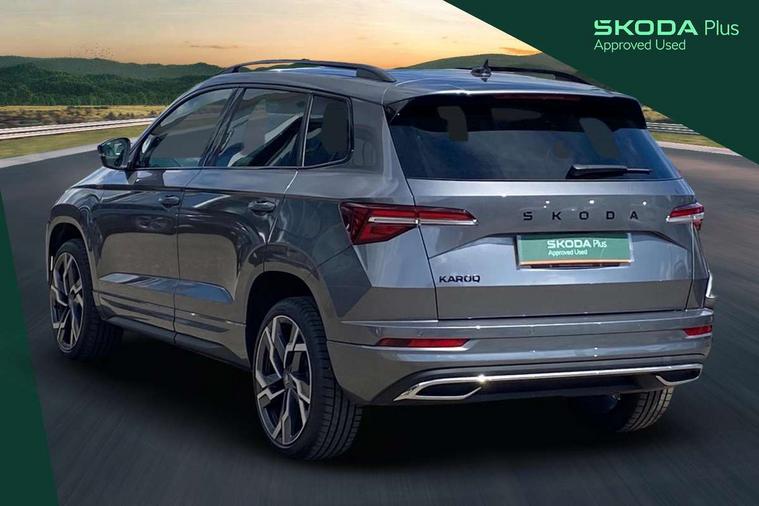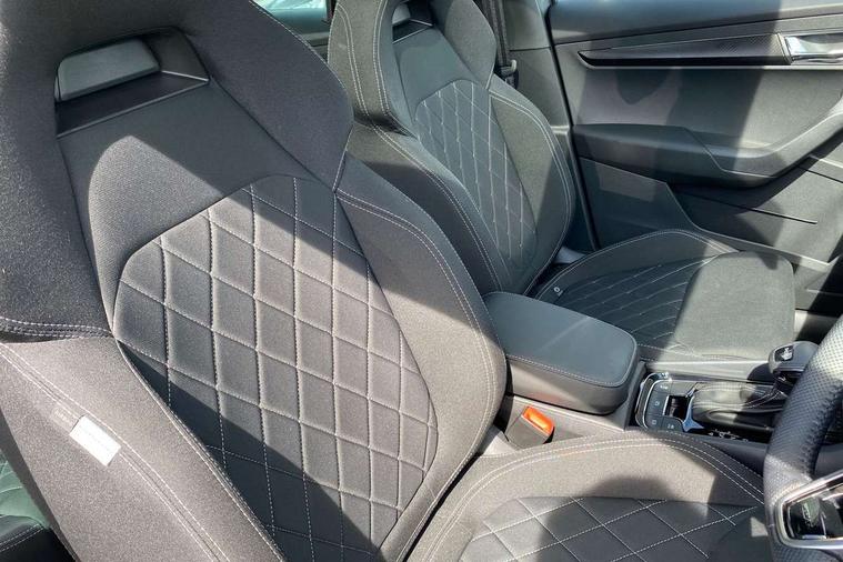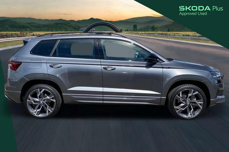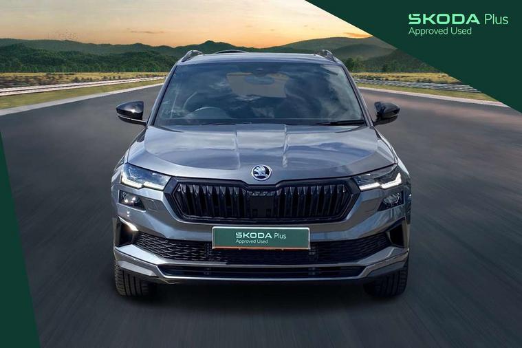 Advanced driver attention and drowsiness monitor, Emergency services call system, Outside temperature gauge, Sensor for driver assistance systems, Service interval indicator, SmartLink wireless for Apple and wired for Android, Start/stop system with regenerative braking, Traffic sign recognition, USB C Port x 2 in front centre console, Virtual Cockpit - 10.25" digital display, Virtual pedal with electrically operated boot door, Wireless smartphone charging, DAB radio with Bluetooth, USB connection, Acoustic glass, Aero front windscreen wipers with intermittent function, Auto dimming rear view mirror with light and rain sensors, Black door mirrors, Black electric window control buttons, Black radiator grille, Black roof rails, Body colour door handles, Electric front and rear windows with child proof lock, Extended rear roof spoiler, Front door steps with SportLine logo, Heated rear windscreen, LED daytime running lights, LED rear lights with high functionality welcome effect and dynamic indicators, Light assistant (coming/leaving home/tunnel light), Panoramic sliding sunroof, Plastic scuff plates in door apertures, Privacy glass, Protective door side sills in body colour, Rear diffuser, Rear side wing doors, Rear window wiper with washer system and intermittent control, Safety reflectors on front doors, Skoda lettering on tailgate in black, Sportline badge on front fender, Sports front and rear bumpers, Third brake light, Unique dark chrome design logo on alloy wheels, 1.5 litre bottle holders in driver and front passenger door panels, 12V socket in boot, 12v socket in front centre armrest with storage compartment and rear air vents, 2 x Tablet holder, 3 rear height adjustable headrests, 3 seat bench in 2nd row, 3 spoke sports leather heated multifunction steering wheel with DSG paddles, 4 foldable roof handles with rear coat hooks, Black floor carpet, Cargo elements in boot, Chrome inner door handles, Foldable hooks in the boot, Front head restraints, Height adjustable front three point seats belts with tensioners, Height/reach adjust steering wheel, Ice scraper, Illuminated glovebox, Illuminated luggage compartment, Isofix child seat preparation for front passenger seat, Isofix child seat preparation outer rear, Manual lumbar support for front seats, Pen holder, Pollen filter, Rear backrest release from boot, Rear boot cover, Rear package tray, Rear reading lights, Rear seats fixed folding and divided 60:40, Rubbish bin door, Safety vest holder, Single front passenger seat, Skoda lettering on steering wheel, Sportline decorative inserts, Storage box in upper central dashboard closed, Sunvisors with illuminated vanity mirrors, Textile floor mats, Ticket holder, Titan black interior ceiling, Umbrella under passenger seat, Under passenger seat storage compartment, Columbus pack - Karoq, LED Interior lighting pack with Skoda welcome logo - Karoq, Light Pack - Karoq, Non Smokers pack, Performance pack - Karoq, Winter plus pack with heated front and rear seats - Karoq, Automatic door unlocking in case of crash, Automatic fuel cut off in case of crash, Driver airbag, Electronic parking brake with auto hold function, Emergency rear braking signal, ESC (incl. ABS+MSR+ASR+EDS+HBA+DSR+RBS+MKB), Front side airbags, Head airbags, Hill hold control, Knee airbags, Passenger airbag with switch-off function, Pedestrian monitor, Seatbelt reminder signalisation and pretensioner for all seats, Three point seatbelts rear, Two tone horn, Tyre pressure monitor, Alarm with interior monitoring, back up horn and tilt sensor with safe function, Electronic engine immobiliser, Keyless entry and start/stop, Remote central locking with 2 remote folding keys, Black air vent surround, Black centre console, carbon door decor, Satin black dashboard, Satin black door trim, 19" Sagittarius anthracite alloy wheels, Anti-theft wheel bolts protection, Breakdown and tool kit,