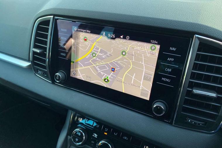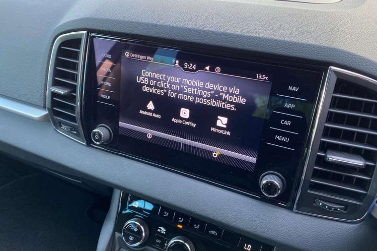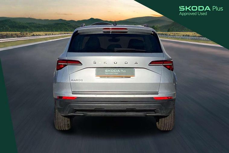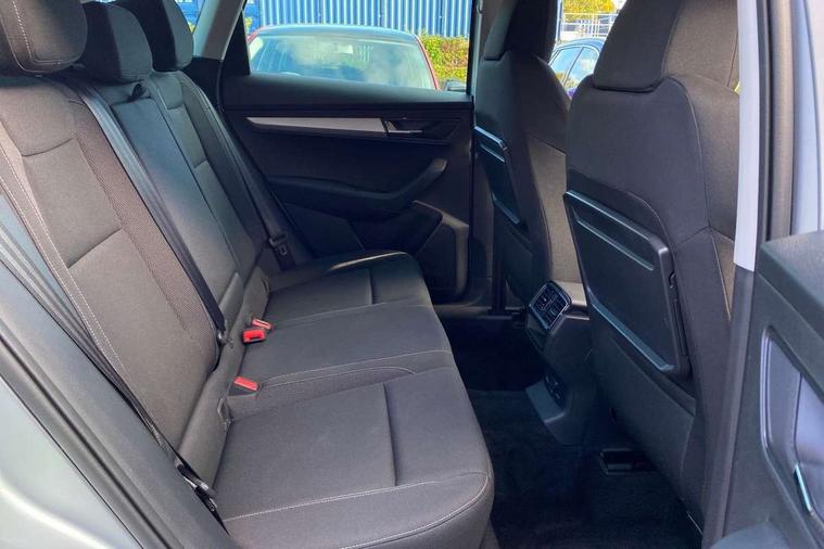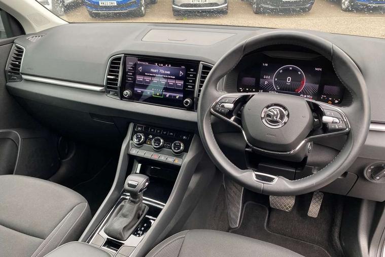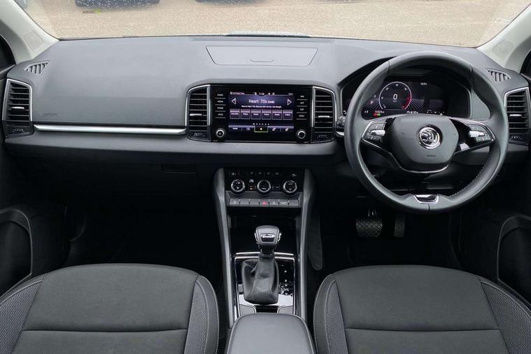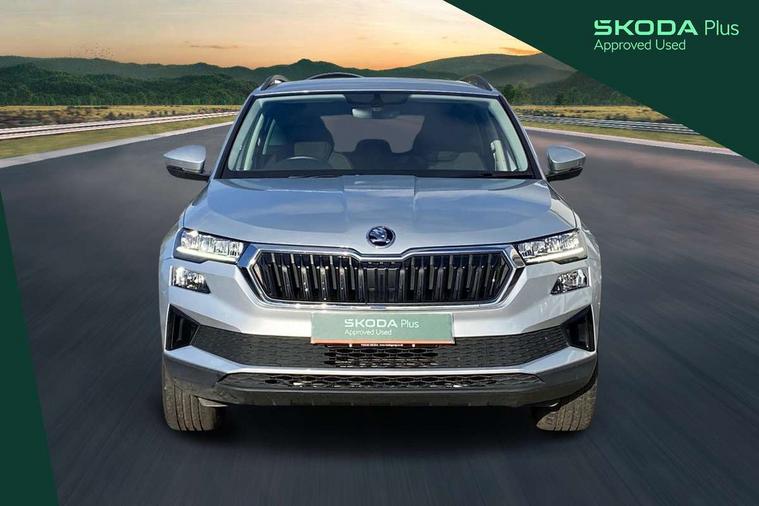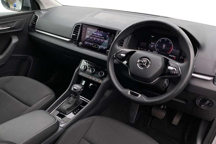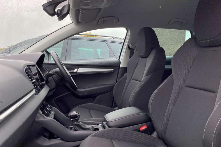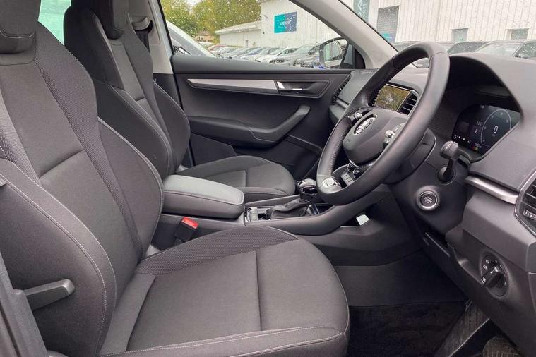 8" Digital display, Amundsen satellite navigation with 8" touchscreen display with maps Europe, WLAN and web radio, Care connect, Driver fatigue sensor, Electro-mechanical PAS, Emergency services call system, Outside temperature gauge, Service interval indicator, SmartLink wireless for Apple and wired for Android, Start/stop system with regenerative braking, USB C Port x 2 in front centre console, Diesel particulate filter, 8 speakers, DAB radio with Bluetooth, USB connection, Acoustic glass, Aero front windscreen wipers with intermittent function, Auto dimming rear view mirror with light and rain sensors, Black electric window control buttons, Body colour door mirrors and handles, Dynamic headlight range control with cornering light function, Electric front and rear windows with child proof lock, Electrically adjustable heated folding and auto dimming door mirrors, Front fog lights, Heated rear windscreen, LED daytime running lights, LED Headlights, LED rear lights with high functionality welcome effect and dynamic indicators, Light assistant (coming/leaving home/tunnel light), Plastic scuff plates, Privacy glass, Rear side wing doors, Rear window wiper with washer system and intermittent control, Safety reflectors on front doors, Third brake light, 1.5 litre bottle holders in driver and front passenger door panels, 12V socket in boot, 12v socket in front centre armrest with storage compartment and rear air vents, 2 x Tablet holder, 3 rear height adjustable headrests, 3 seat bench in 2nd row, 4 foldable roof handles with rear coat hooks, Black floor carpet, Chrome inner door handles, Double sided boot floor, Driver/front passenger reading lights, Foldable hooks in the boot, Folding tables on the front seat backrests, Front head restraints, Height adjustable driver and passenger seat, Height adjustable front three point seats belts with tensioners, Height/reach adjust steering wheel, Ice scraper, Illuminated glovebox, Illuminated luggage compartment, Interior noise suppression, Isofix child seat preparation for front passenger seat, Isofix child seat preparation outer rear, Manual lumbar support for front seats, Pearl grey interior ceiling, Pen holder, Pollen filter, Rear boot cover, Rear reading lights, Rubbish bin door, Safety vest holder, Single front passenger seat, Storage box in upper central dashboard closed, Sunvisors with illuminated vanity mirrors, Textile floor mats, Ticket holder, Tool kit, Umbrella under passenger seat, Boot pack - Karoq, Automatic door unlocking in case of crash, Automatic fuel cut off in case of crash, Child locks on rear doors, Driver airbag, Electronic parking brake with auto hold function, Emergency rear braking signal, ESC including ABS, MSR, ASR, EDS, HBA, DSR, RBS, MKB and traction control, Front side airbags, Hill hold control, Knee airbags, Passenger airbag with switch-off function, Pedestrian monitor, Seatbelt reminder signalisation and pretensioner for all seats, Three point seatbelts rear, Two tone horn, Tyre pressure display, Tyre pressure monitor, Alarm with interior monitoring, back up horn and tilt sensor with safe function, Electronic engine immobiliser, Remote central locking with 2 remote folding keys, Black centre console, Chrome framed air vents, Satin black dashboard, Satin black door trim, Anti-theft wheel bolts protection, Storage on wheel cover,