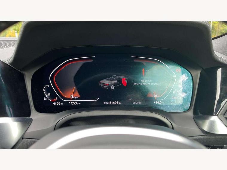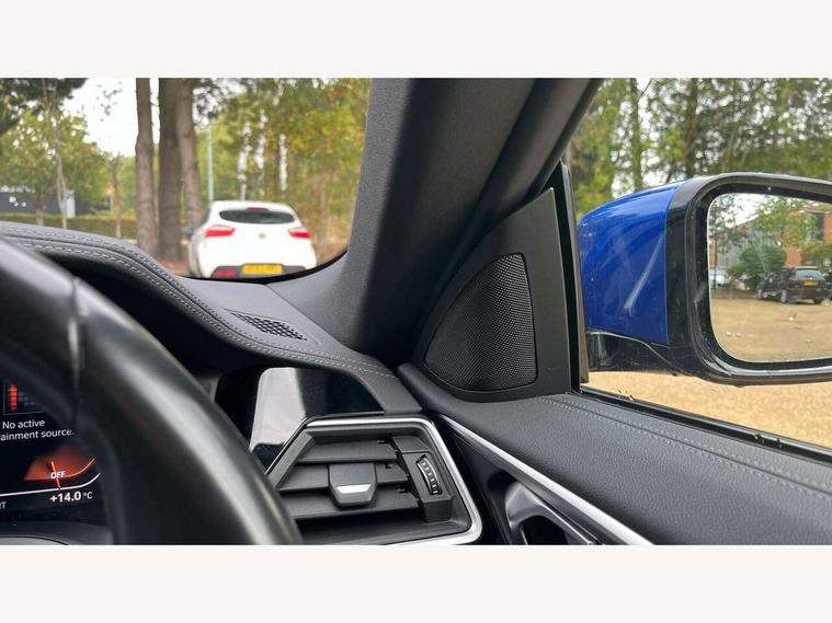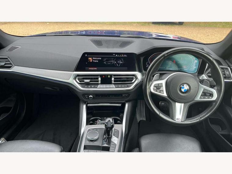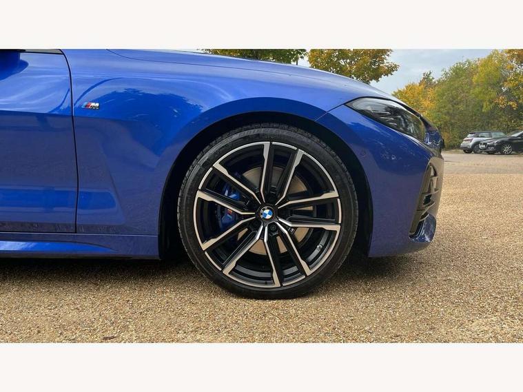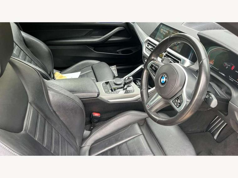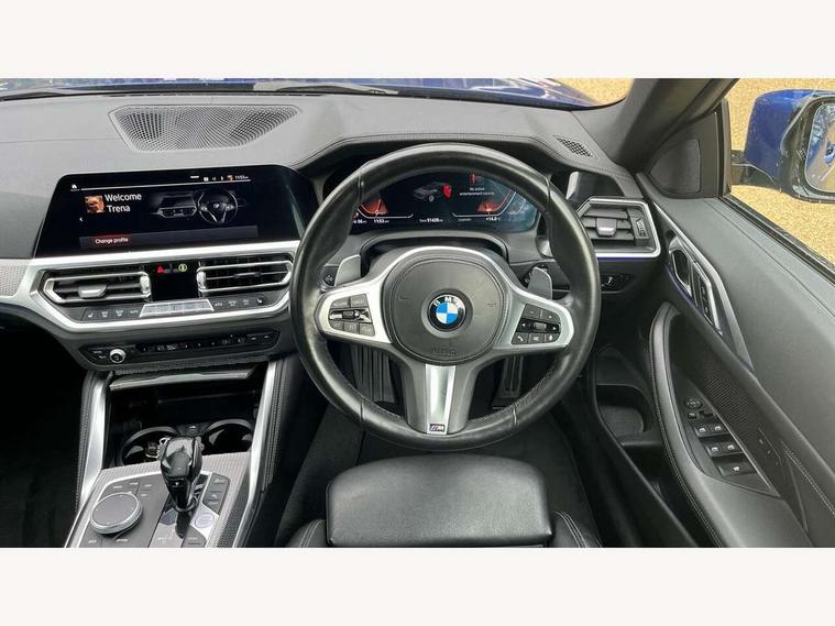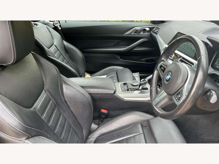 Active guard plus, Attentiveness assist, Auto start-stop, Bluetooth hands free facility with USB audio interface with audio streaming, BMW ConnectedDrive online services, BMW iDrive controller on centre console, BMW Live Cockpit Professional Nav with 12.3" instrument display + 10.25" display, Intelligent Voice Assist, BMW OS 7, HDD, 2USB, 4G LTE connect, BMW service history, BMW Teleservices, Brake pad wear indicator in front and rear, Check Control warning system for monitoring of lights and door/luggage compartment open warning, Condition based service, Cruise control with brake assist, Electric power steering, Electric power steering with Servotronic steering optimised at all speed ranges, Gearshift time display in manual mode, Instrument cluster with speedometer with mph readout, tachometer, fuel gauge and oil temperature gauge, Integrated owners handbook, Oil sensor for level and grade, warning by check control system, On board computer - average speed, fuel consumption, outside temp display with acoustic warning, clock/date, service interval, odometer/trip meter, Optimum shift indicator, Variable sport steering, 8 speed automatic steptronic transmission with gearshift paddles, Balanced 50/50 weight distribution, Double VANOS, Drive performance control - ECO PRO, comfort and sport modes, High precision injection, Low centre of gravity, M sport suspension, Petrol Particulate Filter, Stroke dependent dampers, VALVETRONIC engine management, DAB tuner, Electronic service booklet, Acoustic glazing, Adaptive LED Headlights, Automatic headlight beam throw control with load dependent regulating reaction, dynamic compensation of braking dive and acceleration squat, Automatically dimming electrochromatic rear view mirror, BMW emblem on engine compartment lid and tailgate, BMW kidney grille with mesh grille front side of the nuggets in matt aluminium and frame in chrome high gloss, Body colour fuel filler flap, Body colour roof fin, Brushed aluminium inserts in the front door sill finishers with BMW designation, Dynamic brake lights, Electric windows - front and rear, with open/close fingertip control, anti trap facility and comfort closing function all round, Exhaust tailpipe - split left and right, Exterior mirrors - electrically folding with anti-dazzle, Fading support, Front and rear bumper system, Front apron plastic in body colour, Green tinted heat protection glazing, High gloss shadow line exterior trim, Illuminated bow type door handles in body colour drivers side with door lock, Interior rear view electrochromatic mirror with automatic anti dazzle function, LED front fog lights, Licence plate panel integrated into front bumper and tailgate, Lightweight engineering, M designation on front side panels, left and right, Model designation on right side of tailgate, One piece front bumper cover including towing eye cover in body colour, Preparation for high beam assistant, Rain sensor, Side frame decorative moulding black matt, Two part LED tailights in L-shape with components in smoked glass, brake light, LED turn indicator and rear fog light, Visible VIN plate, Welcome lights in interior and door handle area, Widened track and increased camber values for max transverse dynamics, agility and steering precision, Window recess cover black high gloss, Windscreen wipers with integrated washing jets, 12V power socket in front centre console, 2 front cupholder in centre console with clamping elements and matt black inlay, 2 Rear seat headrests, 3 spoke M sport leather multifunction steering wheel, 3 zone automatic air conditioning, 4 pieces lashing eyelets in luggage compartment, 40:20:40 split folding rear seat and rear centre armrest with two cupholders, Ambient lighting with welcome carpet light, Armrest integrated in front and rear door trim + front centre console armrest, Electric seat adjustment with memory, Four grab handles integrated in roof lining, Front and rear door exit lighting (left / right), Front and rear door pockets, Front and rear footwell lights, Front and rear reading lights, Front headrests, Front seat backrest width adjustment, Front sport seats, Heated driver and front passenger seats, Height adjustable mechanically and infinitely variable steering column, Illuminated armrest storage compartment, Illuminated glove compartment with separate small compartment, Luggage compartment light, Make-up mirror lights, Storage compartment in rear centre console, Sunvisors with vanity mirrors and ticket pocket, Toolkit located in luggage compartment, Velour front floor mats, Vernasca leather upholstery, Connected professional package - 4 Series, M sport exterior styling pack - 4 Series, 2 x 3-point rear seatbelts, Battery safety cut-off, BMW emergency call, Brake energy regeneration, Braking pre-tensioning, Child proof locking system in rear door, Child seat ISOFIX attachment for the two outer rear seats, Coasting in idle in ECO PRO mode, Cornering brake control (CBC), Crash sensor activating of airbags, Unlocking doors, hazard warning lights, fuel cut off, interior lighting+activation of safety battery terminal clamp, Driver and front passenger side airbags, integrated in the door side seat backrest bolsters for all seat variants, Driver/Front Passenger airbags, Dry braking, Dynamic brake control, Dynamic stability control + (DSC+) - Anti-lock Braking System (ABS) with brake assist and cornering brake control + Automatic Stability Control (ASC), Dynamic Traction Control - DTC, Electric parking brake including automatic hold function and automatic release of the parking brake when driving off, Electronic differential lock control (EDLC), Front and rear ventilated brake disc, Front passenger manual airbag deactivation, Head airbags for all 4 outer seats, Hill start assistant, Seat belt security check for driver and front passenger, Seat belt with belt stopper, pyrotechnic belt tensioners and belt force limiters, Side impact protection, Tyre pressure monitoring with three level warnin