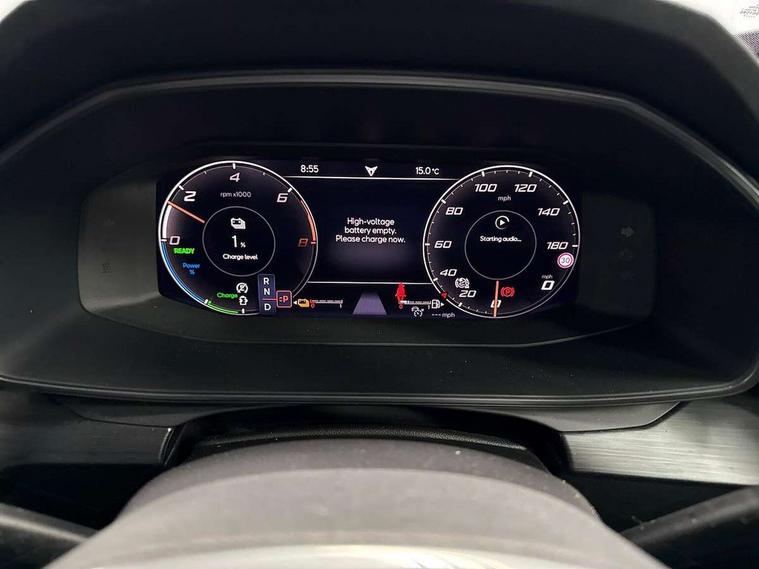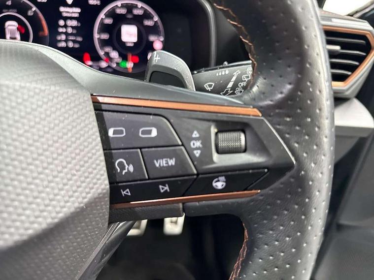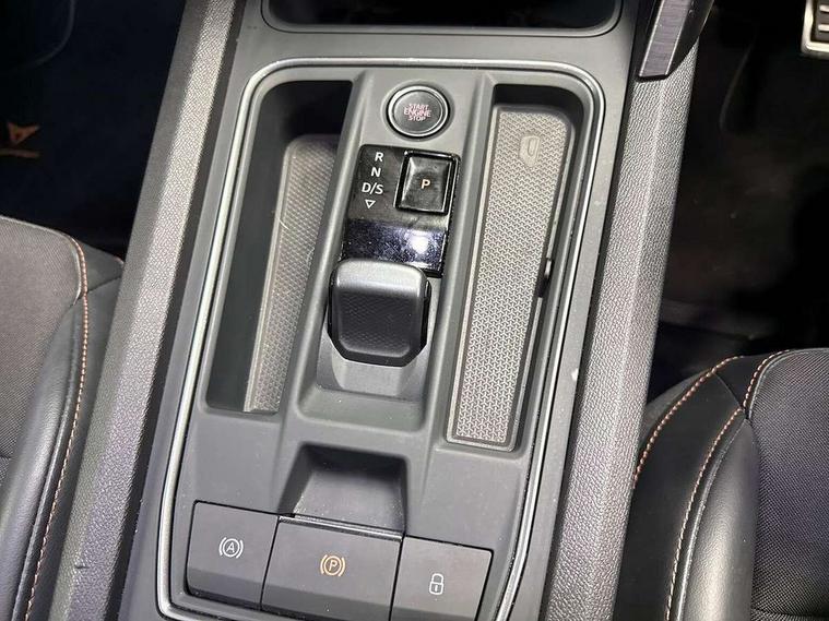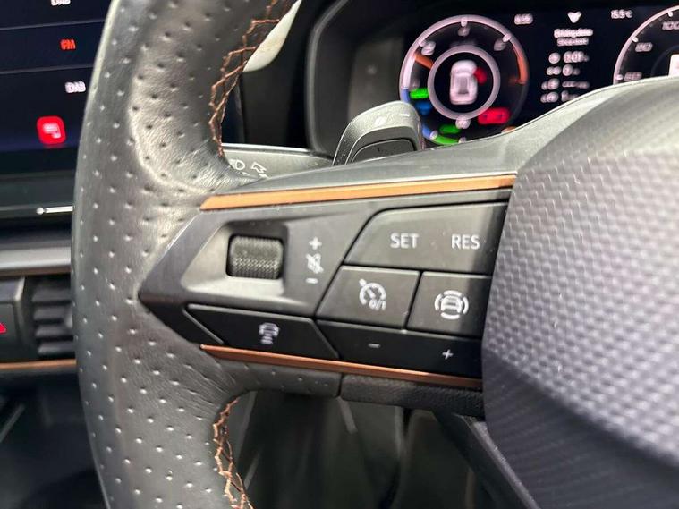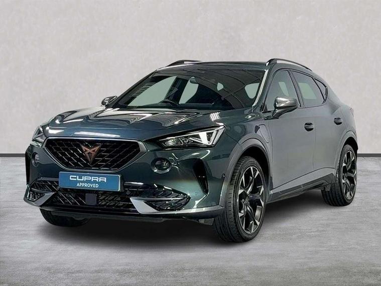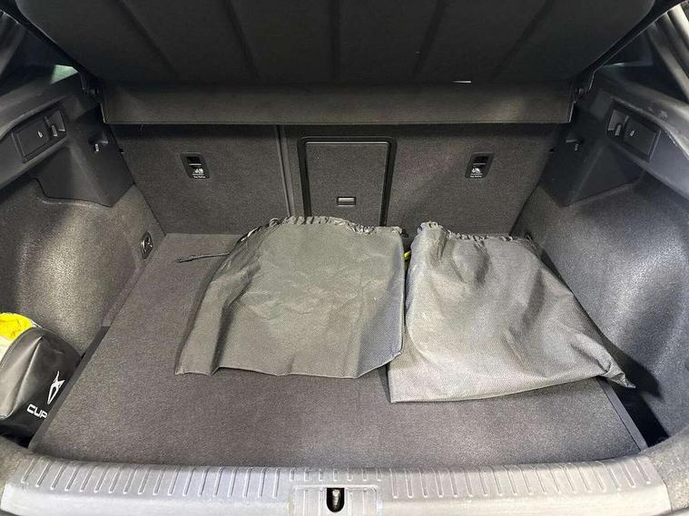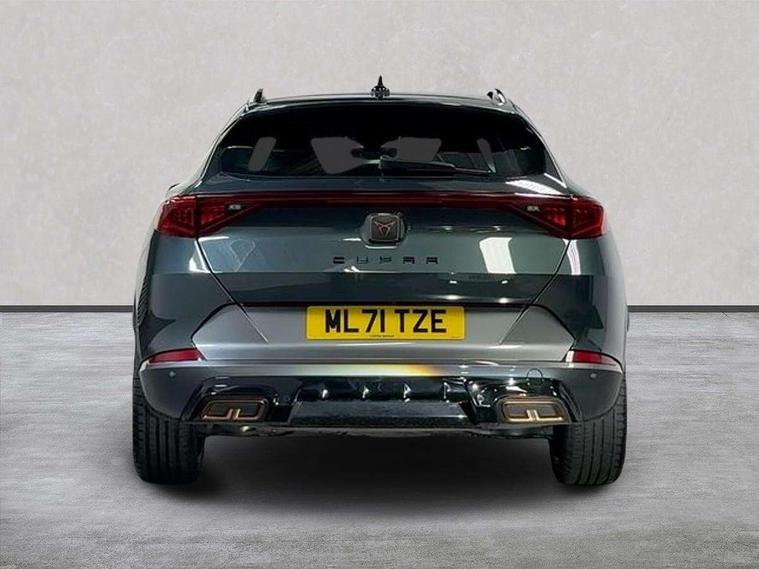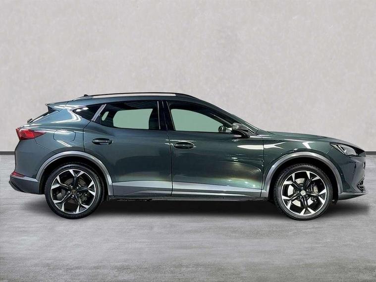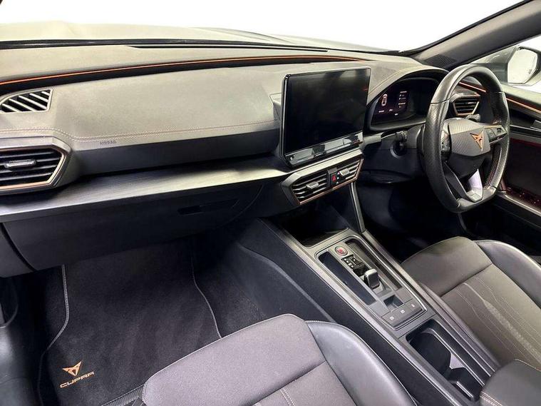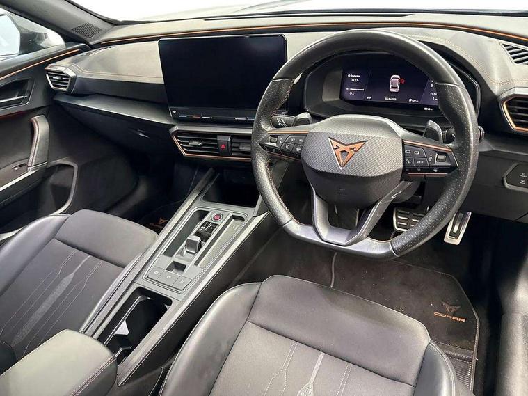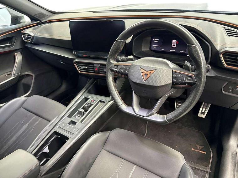 Digital cockpit and configurable dashboard, Driver alert system, Dynamic chassis control with driving profile selection (Comfort, Sport, CUPRA, Individual), Forward collision warning with automatic braking, Lane assist, Park assist (inc front/rear parking sensors), Predictive adaptive cruise control with speed limiter, Rear view camera, RPM, trip computer, outside temp gauge, instrument light brightness, low fuel warning light, lights on reminder, gearshift indicator, Service interval indicator, Speed sensitive power steering, Start/stop system with regenerative braking, Virtual pedal and electric tailgate, Wireless apple carplay, Wireless phone charger, 10 amp mode 2 charging cable, 16 amp mode 3 charging cable, 3.6 kw On-board charger, Electronic locking differential and dynamic traction support, Sports suspension with front shock absoption, 2 front and 2 rear USB type C sockets, 6 speakers, Auxiliary input socket, DAB radio, Auto dimming rear view mirror, Body colour door handles, Body coloured bumpers, Dark grey wing mirror, Daytime running light with automatic headlight control and coming home feature, Dynamic headlight range control, Electric front/rear windows, Electrically adjustable, heated and folding door mirrors, Front fog lamps with cornering function, Gloss black roof rails and window surrounds, LED Headlights, LED Taillights with dynamic indicator, Rain sensing wipers, Rear diffuser with single exhaust pipe on each side with simulated exhaust pipes, Rear wash/wipe, Sports bumpers, Tinted rear windows, Welcome lights, 12v power supply in centre console, 12V socket, 12v socket in loadspace, 2 front and 2 rear reading lights, 230V socket, 60/40 split rear bench seat with armrest and mechanical seat release, Black headlining, Cupra sports pedals, Dust/pollen filter, Front and rear head restraints, Front centre armrest, Height/reach adjust steering wheel, Illuminated interior front door sills, Illuminated sunvisor with mirror, Isofix, Leather multi function heated steering wheel with gear shift paddles, Luggage tie-down hooks, Manually adjustable height and lumbar support for front seats, PVC/Cloth upholstery with copper stitching + bucket seats, Three zone climate control with control panel in rear, Wraparound lighting, Navigation system pack - Formentor, 3 point seatbelts on all rear seats, ABS, Brake control system - ESC and brake booster, Child proof door locks, Driver and front passenger airbags with front passenger airbag de-activation, Electronic parking brake, Front and rear disc brakes, Front side curtain airbags, Hill hold control, Seat belt reminder for front and rear seats, Tyre pressure monitoring system, Anti theft alarm system, Keyless entry and start system (KESSY), Locking wheel bolts, Copper and aluminium interior detailing, 19" 'Exclusive' machined sport matte black and silver alloy wheels, Tyre repair kit,