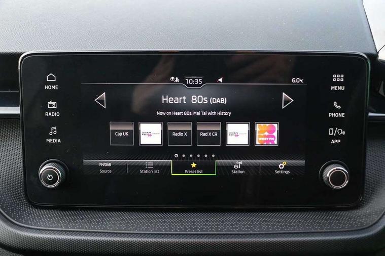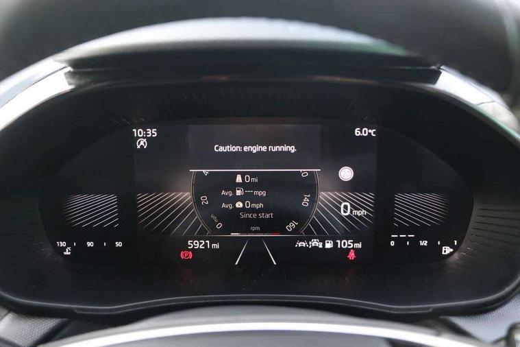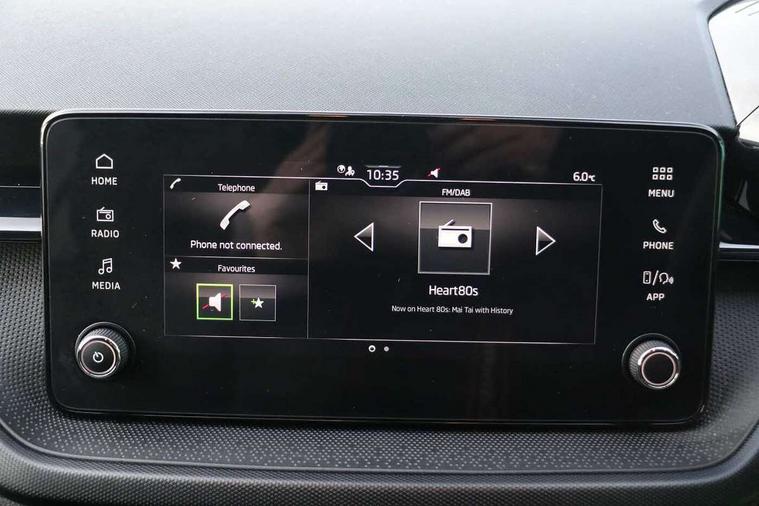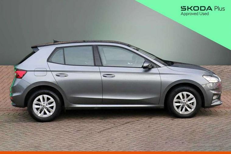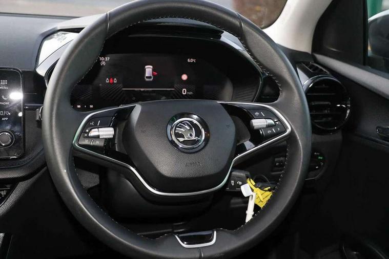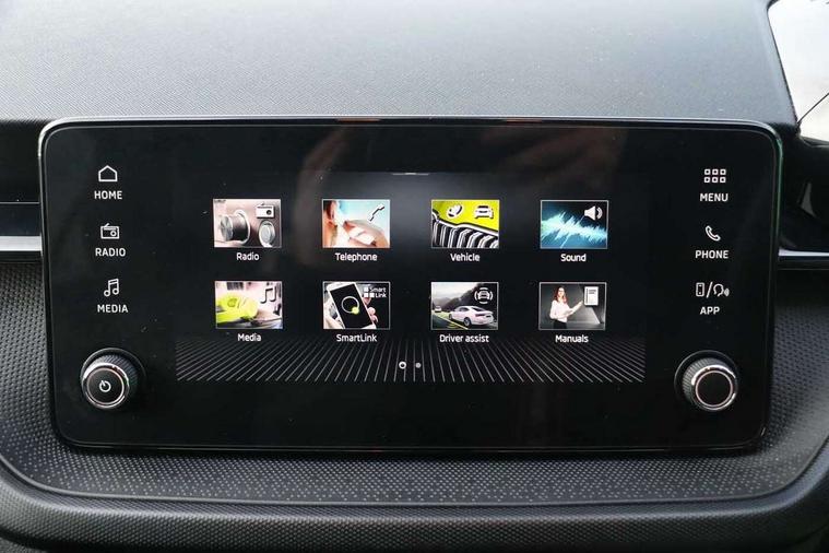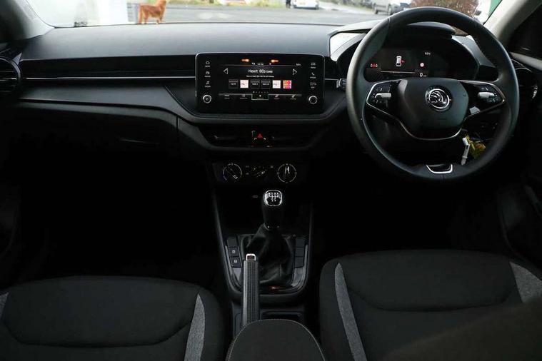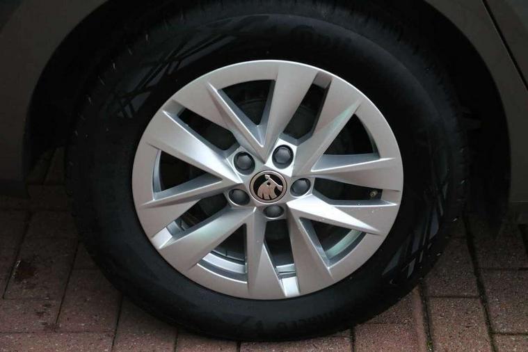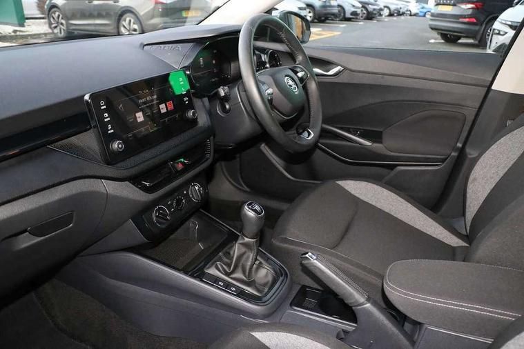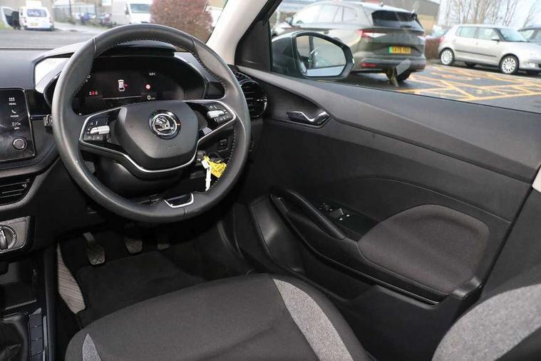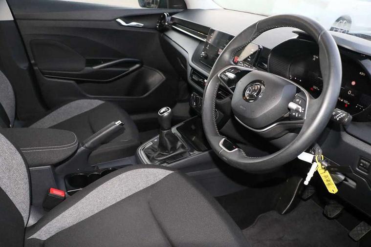 8" Digital instrument display, Advanced driver attention and drowsiness monitor, Bluetooth connection, Electromechanical power steering, Exterior temperature gauge, Lane assist including road edge detection, Rear parking sensors, Service interval indicator, Speed limiter, Traffic sign recognition, Wireless SmartLink for Apple CarPlay and Android Auto, 2x USB-C in the front (for data transmission and charging), 6 speakers (4 speakers/2 tweeters), 8.25" Skoda infotainment touchscreen display, Auxiliary socket for external MP3 player, DAB digital radio reception, Basic LED Headlights, Basic rear lights, Body colour door mirrors, Body coloured bumpers, Dimming rear view mirror with black frame, Door mirror integrated indicators, Electrically adjustable and heated door mirrors, Electrically adjustable front windows with function auto up/down, Front fog lights, Front window wiper intermittent control, Headlight range control - Automatic, Ice scraper in fuel cap, LED daytime running lights with coming and leaving home feature, Mechanical adjustable rear windows, Rain sensor, Rear LED fog light, Rear side wing doors, Rear window wiper with washing nozzles, Roof mounted spoiler, SKODA tailgate lettering in chrome, Third brake light, 2 reading lights in front and 2 reading lights in rear, 2 spoke leather multifunction steering wheel, 3 rear headrests, Backrest split and folding, Central console with removable cup holder and storage box, Chrome handbrake release button, Fabric upholstery, Front centre armrest, Gearshift knob/handle in leather, Grain satin black interior door handles, Hand brake lever handle in leather, Height adjustable driver seat, Height adjustable front headrests, Height adjustable steering wheel, ISOFIX and TopTether anchorage points to the outer rear seats, ISOFIX and TopTether on the front passenger seat, Luggage compartment lighting, Manual air conditioning, Pollen filter, Rear seat bench unsplit, Single front passenger seat, Storm grey headlining, Sun visors with mirror and airbag label on passenger side, Textile floor mats, Ticket holder, 3-point height adjustable front seats belts with pretensioner and force limiter, Automatic warning lights in case of crash, Driver and passengers airbag with switch off function, e-Call+, ESC including ABS, MSR, ASR, EDS, HBA and XDS, Front and rear seat belt warning, FRONT ASSIST (AEB City and AEB Inter Urban), Front side airbags, Head airbags, One tone horn, Pedestrian protection, Three rear 3-points safety seat belts with pretensioner and force limiter including stop function for outer rear seat belts, Tyre pressure monitoring system, Anti-theft alarm system including immobiliser, interior monitoring, backup horn, and towing protection, Central locking with radio remote control, interior controls, SAFE function and 2 foldable keys, Black painted air vents, Glossy black decorative trim, Grain satin black central console cover, Grain satin black lower decorative trim, Satin black door and side trim panel in front, Anti-theft wheel bolts protection, Super-low rolling resistance tyres,