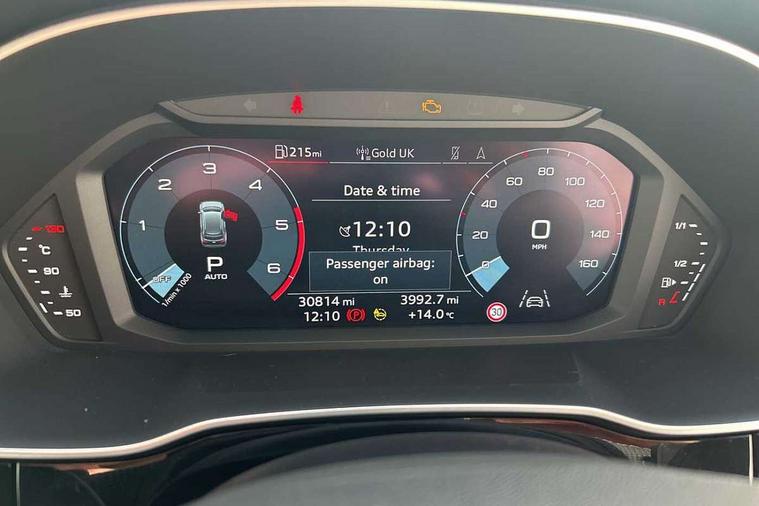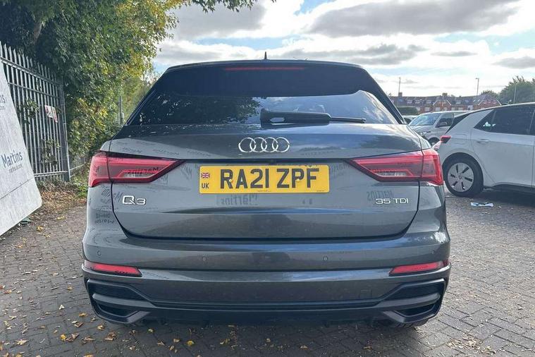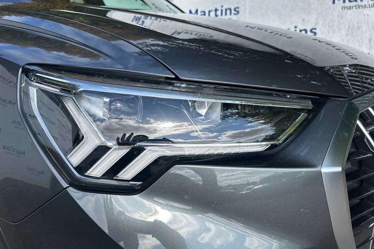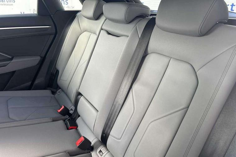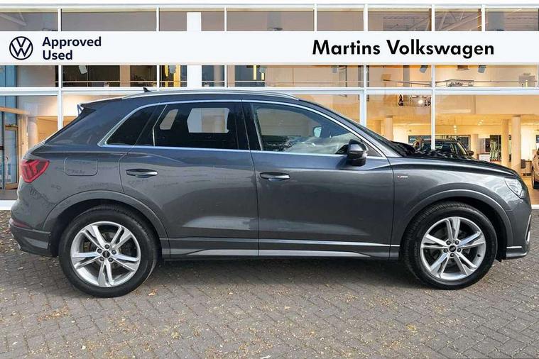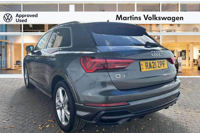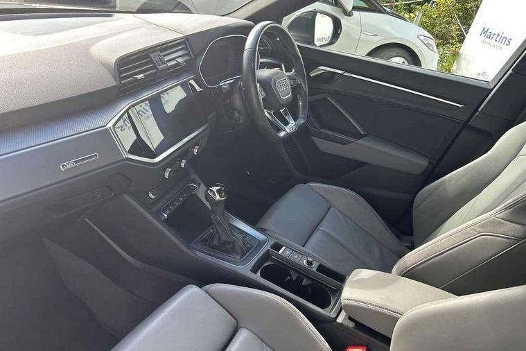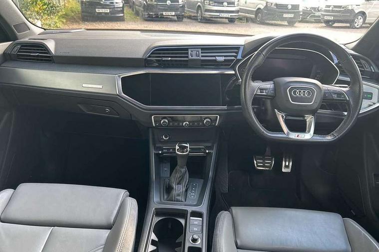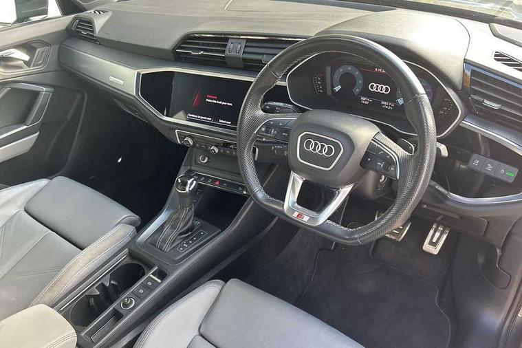 Amazon alexa Integration, Audi connect safety and service (e-call), Audi drive select, Audi lane departure warning, Audi Virtual Cockpit - 10.25" display, Bluetooth interface, Camera based traffic sign recognition, MMI Navigation Plus with high resolution 10.1 inch touchscreen colour display, Power operated tailgate, Progressive steering, Service interval indicator, Smartphone interface includes wireless Apple carplay/Android Auto, Start stop system with recuperation, Voice control system with natural language interaction, Diesel particulate filter, Sports suspension, 2 USB-C ports with charge and data functions, 6 passive loudspeakers, DAB digital radio module, Acoustic windscreen, Aluminium roof rails, Aluminium window trim, Auto dimming frameless rear view mirror, Body coloured bumpers, Electrically folding, adjustable and heated door mirrors with integrated LED side indicators and kerb view function for passenger side, Front and rear electric windows, Front fog lights, Front side air inlets in matt platinum grey, Front spoiler blade in matt platinum grey, Grille vertical bars in aluminium silver/Matt, High gloss black finish B and C pillars, LED headlights with LED daytime running lights and dynamic rear indicator, LED rear lights, Privacy glass dark tinted rear and rear-side windows (from B-pillar backwards), Rain and light sensors, Rear diffuser strip in matt titanium black, S line badges on front wings, S Line front and rear bumpers, Side skirt insert in matt Platinium grey, Silver chrome grille surround, Titanium black radiator grille, 12V socket in rear centre console, 40:20:40 folding with manual adjustment for 60:40 forwards/backwards position and backrest angle, Adjustable rear seat bench/backrest with centre armrest and cupholder, Black cloth headlining, Dual zone electronic climate control, Front and rear black floor mats with contrast stitching in rock grey, Front and rear headrests, Front and rear roof module including reading lights, Front centre armrest, Glove compartment lighting, Height and reach adjustable steering wheel, Illuminated door sill trims with S logo, ISOFIX child seat mounting for front passenger with airbag deactivation and outer rear seat including top tether attachment point for outer rear seats, Luggage compartment light, Manual front seats with height adjustment, Perforated leather gearknob, Stainless steel luggage compartment sill finisher, Stainless steel pedals, Non smoking pack - Q3, 3x3 point rear seatbelts, 6 airbags - Driver, front passenger, curtain and side windows, Audi pre-sense front with pedestrain and cyclist recognition, Electrically operated child locks on rear doors, Electromechanical parking brake, Electronic stabilisation control including ABS, ASR and EDL, Hill descent control, Hill hold assist, Pre sense basic, Seatbelt monitoring, Tyre pressure warning, Warning triangle and first aid kit, Anti theft alarm, Anti theft wheel bolts, Remote central locking, Dark matt brushed aluminium inlay, Detail dashboard around MMI touch colour display in glass look, black with surround in aluminium look, Leatherette door armrest,