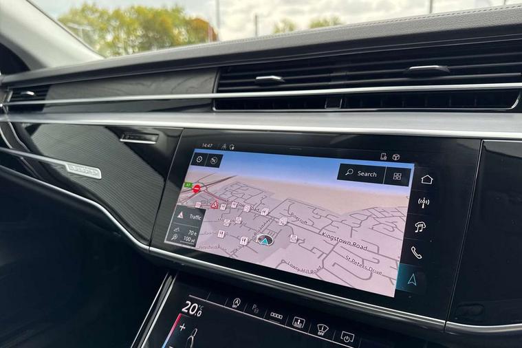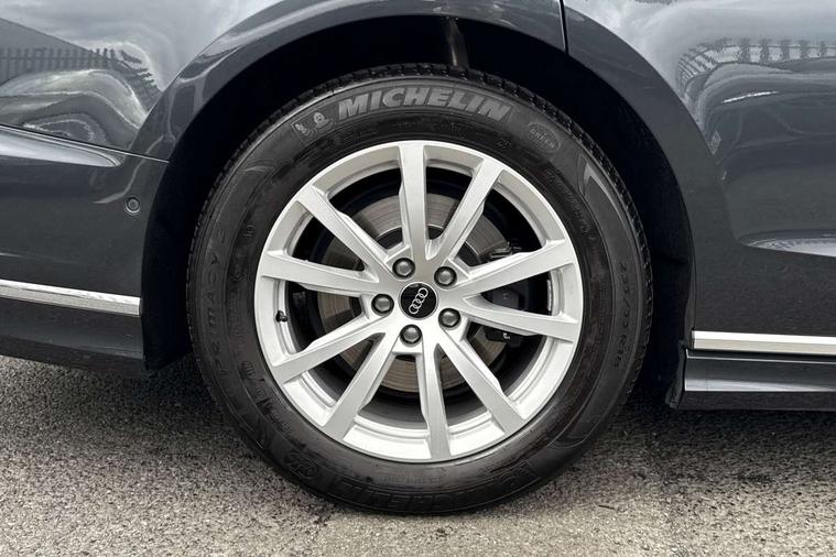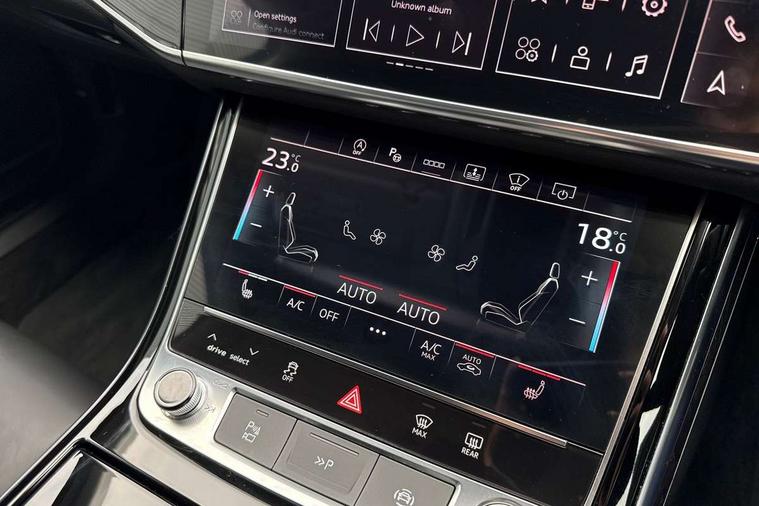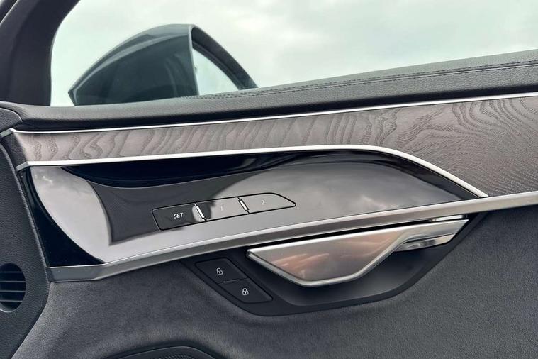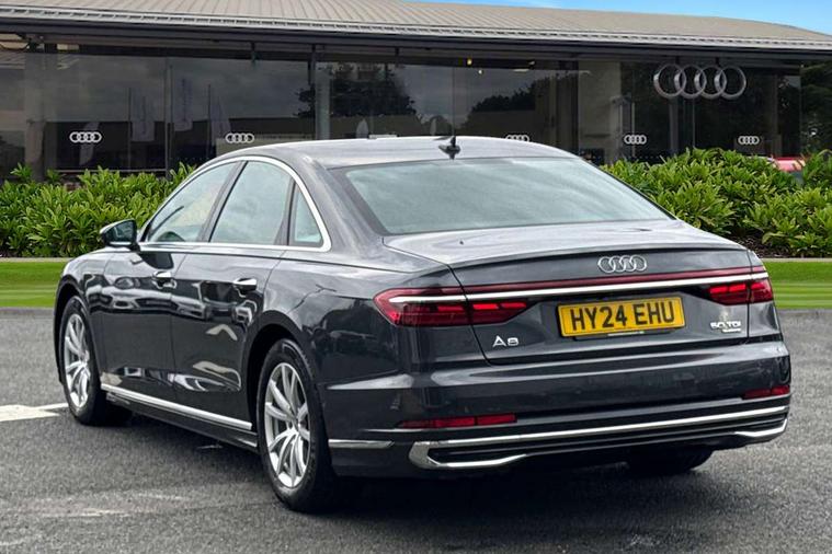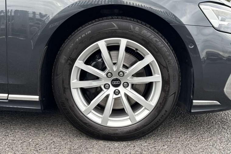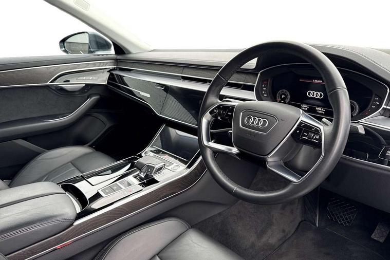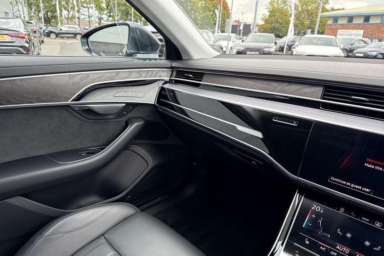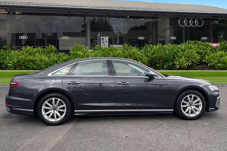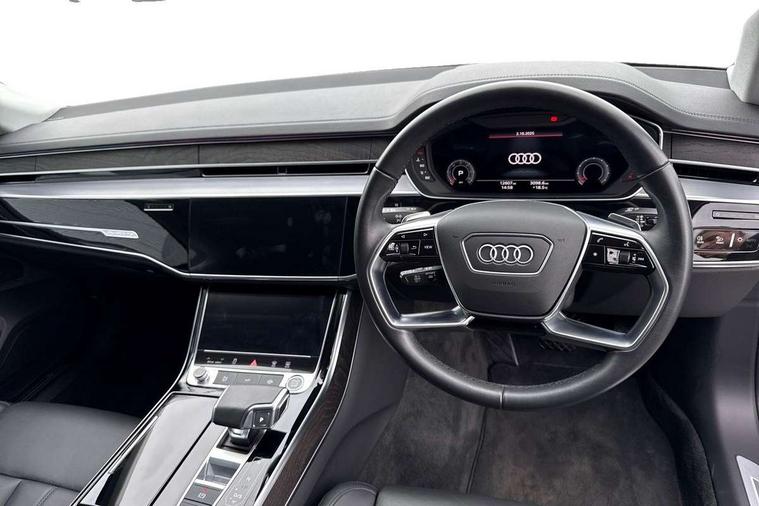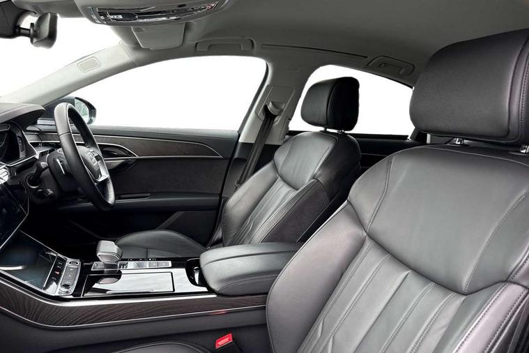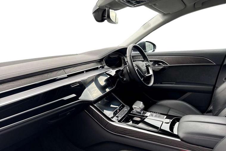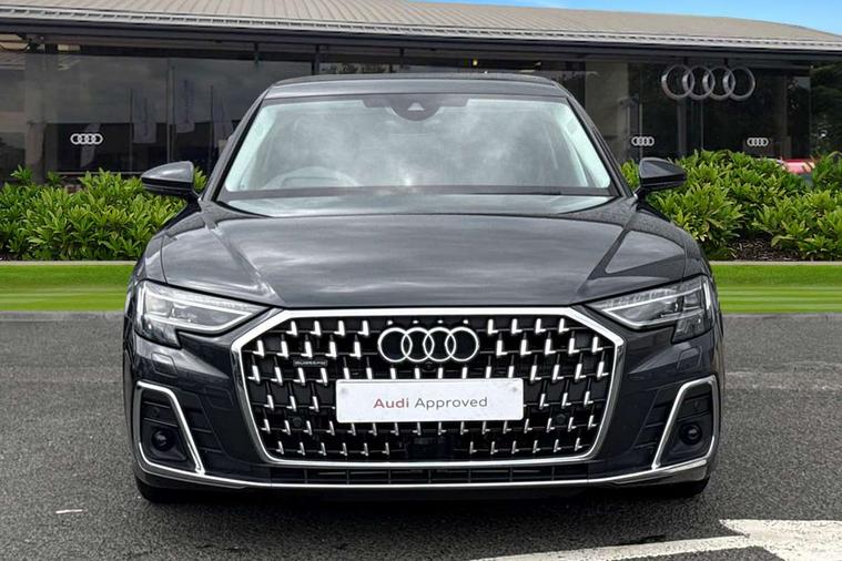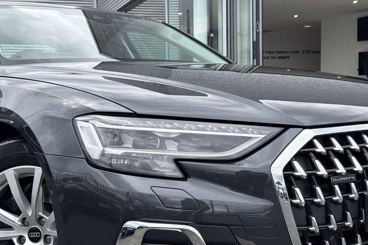 'Lights On' Reminder warning buzzer, Adaptive cruise control with cruise assist, emergency assist, efficiency assist, swerve assist, turn assist and speed limiter, Audi connect safety and service (e-call), Audi drive select, Audi parking system plus with front and rear sensors, Audi smartphone interface with app store includes wireless Apple carplay, Android auto and Amazon alexa integration, Audi virtual cockpit, Bluetooth interface, Camera based traffic sign recognition, Convenience key, Electro - mechanical power assisted steering, Head up Display, MMI navigation plus with MMI touch + Twin touch screens with haptic feedback, Operating buttons in black, glass look with haptic feedback, Power door closure, Power operated tailgate, Rear central control unit, Rear view camera, Remote fuel filler release, Service interval indicator, 24 litre AdBlue tank, 48V Mild hybrid technology, 8 speed transmission with hill hold assist, 82 litre fuel tank, Adaptive air suspension, Diesel particulate filter, Quattro all wheel drive with self locking centre differential, Audi music interface, Audi sound system, DAB digital radio module, DVD System, MMI radio plus, USB connection, USB ports with charging function in the rear, All-weather, manoeuvring, position, static cornering, turning and motorway lights with automatic dynamic headlight range control, Audi space frame, Auto dimming rear view mirror, Body colour bumpers, Body colour exterior mirror housings, Body colour side protection with aluminium trim strips, Electric front windows, Electric rear windows with isolation switch, Electric sunblinds for rear window and rear door windows, Electrically adjustable heated folding + automatically dimming exterior mirrors with memory function and integrated LED indicators, Front wash/wipe with interval delay, HD matrix LED headlights with dynamic light presentation and dynamic indicators, Headlight cleaning system, Heat insulating darkened glass in side and rear windows, Heat insulating glass windscreen, Heated rear window, Heated windscreen washer jets, High beam assist, LED brake lights, LED daytime running lights, LED third brake light, OLED rear lights with changeable rear light signature, Rear boot, Rear side wing doors, Side skirts, Welcome/leaving lighting, 4 zone control automatic air conditioning, Audi phone box light, Centre console with cupholders, Comfort centre armrest, Comfort rear headrests, Door pockets with bottle holder, Driver and front passenger side sunvisors with illuminated vanity mirrors, Dust/pollen filters, Electric front seats with memory function, Front floor mats, Glove compartment cooling, Heated front seats, Heated rear seats, Height/reach electric steering column with easy exit function, Isofix child seat mounting points on outer rear seats, Leather gearknob, Passenger footwell storage net, Roof mounted sunglasses holder, Silver cloth headlining, Single front passenger seat, Valcona leather upholstery with contour comfort front seats, Chrome exterior pack - A8, Extended LED Interior multi coloured light pack - A8, High gloss styling pack - A8, 3 point seatbelts on all rear seats, ABS/EBD, Active front headrest system, ASR traction control, Audi pre sense basic, Audi pre sense front, Black brake calipers, Driver/Front Passenger airbags, EDL traction control, Electromechanical parking brake, ESP, Extended pedestrian protection measures, Front and rear disc brakes, Front and rear side airbags with head airbag system, Front passenger airbag deactivation, Rear child proof door locks, Seatbelt reminder + electric contact in buckle + advanced safety equipment, Tyre pressure loss indicator, Warning triangle and first aid kit, Anti theft alarm tow away protection, Anti-theft wheel bolts and wheel loosening detection, Remote central locking, Dark matt brushed aluminium lower inlays, Fine grain ash natural grey brown upper inlay,