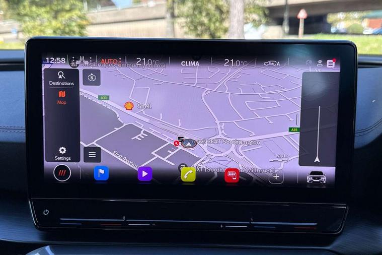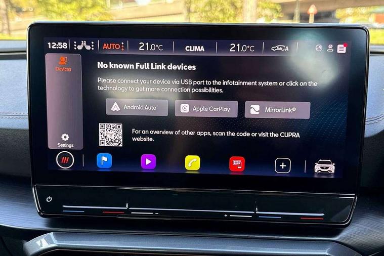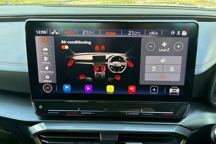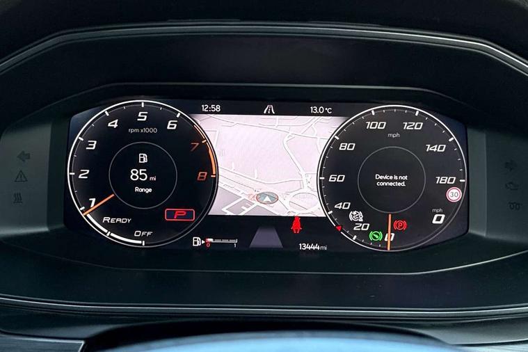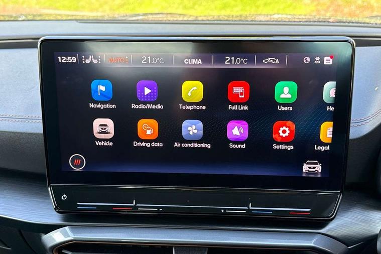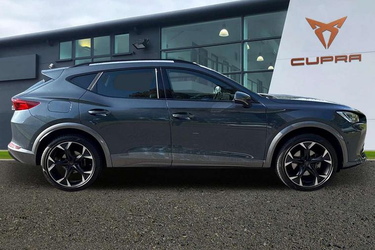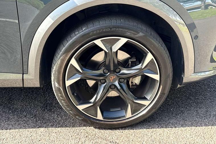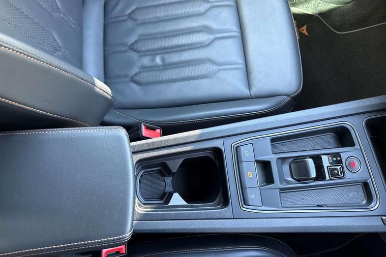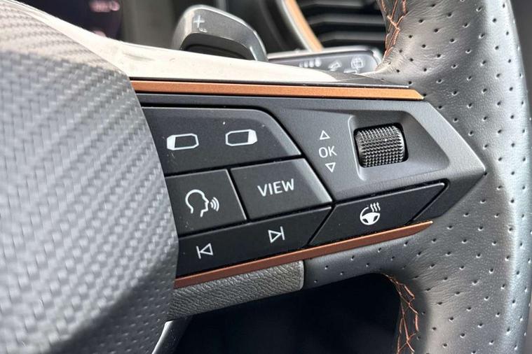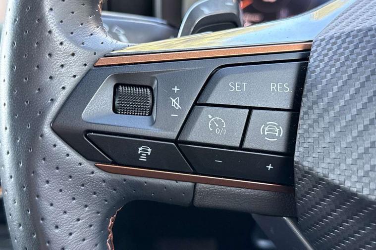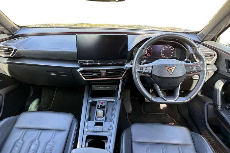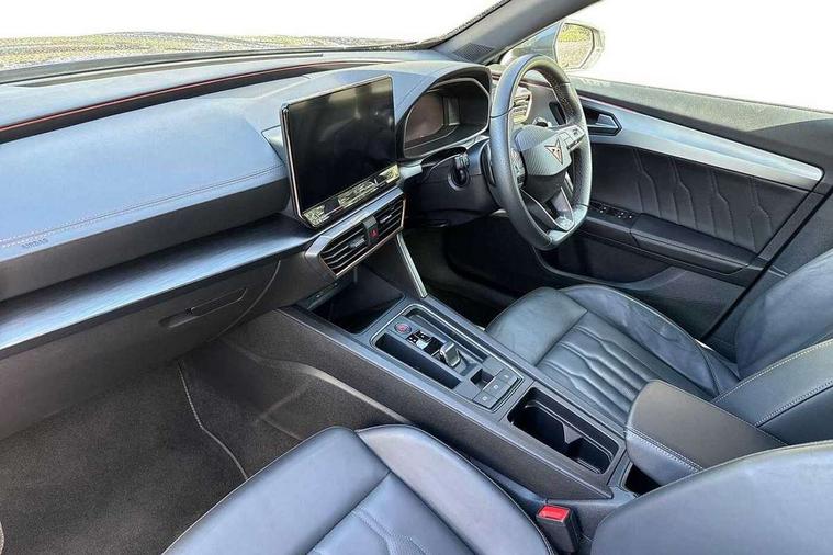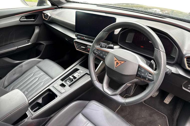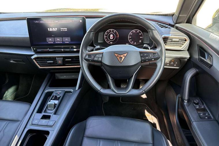 Digital cockpit and configurable dashboard, Driver alert system, Driving profile selection, Forward collision warning with automatic braking, Lane assist, Navigation system with 12'' Touchscreen Display, Park assist (inc front/rear parking sensors), PAS, Predictive adaptive cruise control with speed limiter, Rear view camera, RPM, trip computer, outside temp gauge, instrument light brightness, low fuel warning light, lights on reminder, gearshift indicator, Service interval indicator, Start/stop system with regenerative braking, Voice control system, Wireless apple carplay, Wireless phone charger, Electronic locking differential and dynamic traction support, Standard suspension, 2 front and 2 rear USB type C sockets, Auxiliary input socket, DAB radio, Auto dimming rear view mirror, Body colour door handles, Body coloured bumpers, Dark grey wing mirror, Daytime running light with automatic headlight control and coming home feature, Dynamic headlight range control, Electric front/rear windows, Electrically adjustable heated and folding door mirrors with memory function, Front fog lamps with cornering function, Gloss black roof rails and window surrounds, LED Headlights, LED Taillights with dynamic indicator, Rain sensing wipers, Rear diffuser with black simulated exhaust pipes, Rear side wing doors, Rear wash/wipe, Third brake light, Tinted rear windows, Welcome lights, 12v power supply in centre console, 12V socket, 12v socket in loadspace, 2 front and 2 rear reading lights, 230V socket, 3 seat bench in 2nd row, 60/40 split rear bench seat with armrest and mechanical seat release, Black headlining, Dust/pollen filter, Front and rear head restraints, Front centre armrest, Height/reach adjust steering wheel, Illuminated interior front door sills, Illuminated sunvisor with mirror, Isofix, Leather multi function heated steering wheel with gear shift paddles, Luggage tie-down hooks, Single front passenger seat, Three zone climate control with control panel in rear, Variable luggage/load compartment floor, Wraparound lighting, Genuine Nappa leather Pack - Cupra, 3 point seatbelts on all rear seats, ABS, Brake control system - ESC and brake booster, Child proof door locks, Driver and front passenger airbags with front passenger airbag de-activation, Electronic parking brake, Front and rear disc brakes, Front side curtain airbags, Hill hold control, Public e-call, Seat belt reminder for front and rear seats, Tyre pressure monitoring system, Anti theft alarm system, Keyless entry and start system (KESSY), Locking wheel bolts, Copper and aluminium interior detailing, 19" 'Exclusive' machined sport matte black and silver alloy wheels,