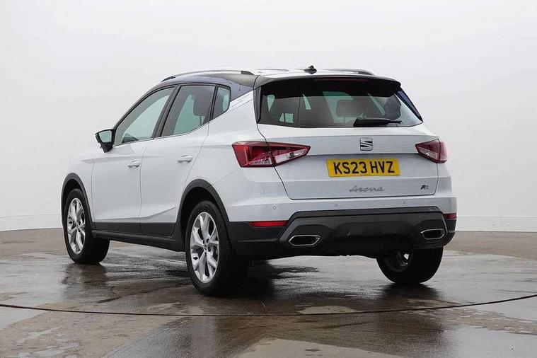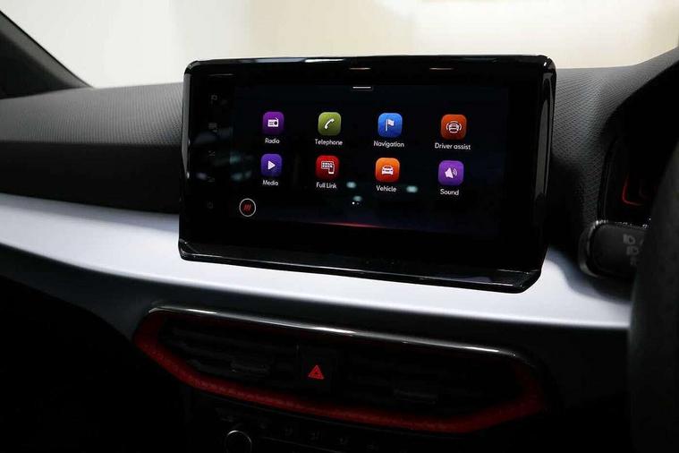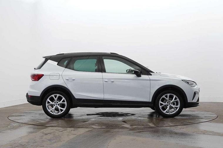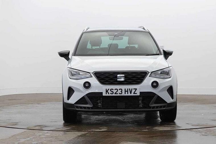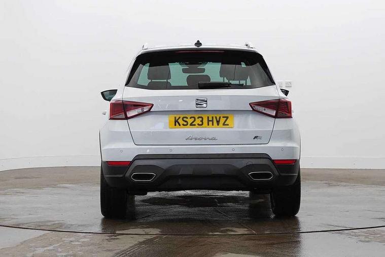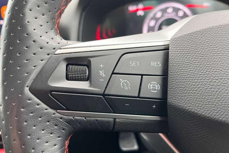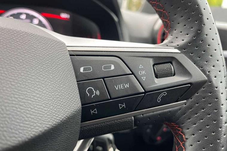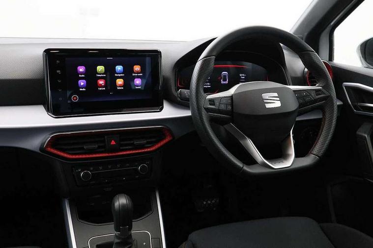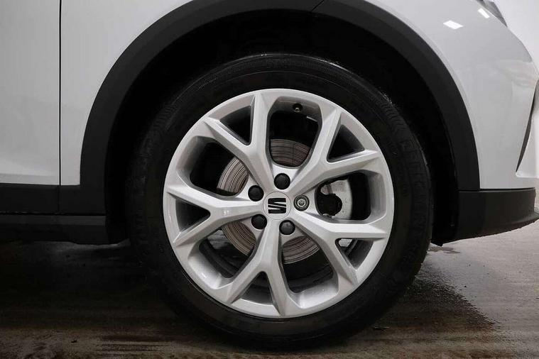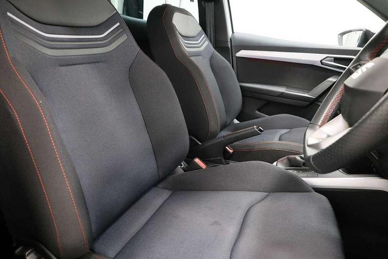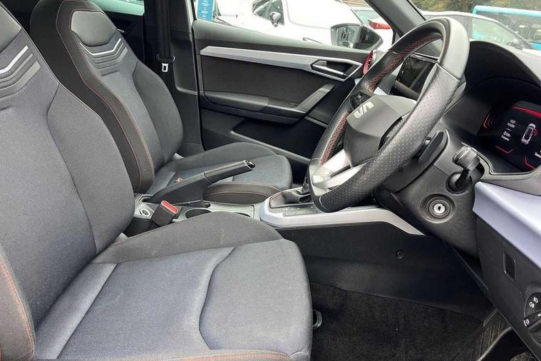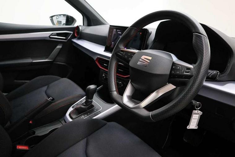 'Lights On' Reminder warning buzzer, 8" Digital cockpit, Digital clock, E-call, Electric speed sensitive power steering, Full Link Smartphone Integration with Mirror Link, Apple Car Play, Google Android Auto with USB Type C cable for Apple and Android compatibility, Lane keeping system, Low fuel warning light, Outside temperature display, Rear parking sensor, RPM counter, Seat connect with safety, service, remote and online, SEAT Drive profile - Four different models normal-sport-eco-individual, steering response, throttle response and gear shifts mode, Trip computer, Wireless phone charger, 9.2" colour touchscreen with navigation system, voice control and USB port (type c), Bluetooth interface for hands free and audio streaming, DAB digital radio and AM/FM radio, Steering wheel mounted audio controls, Anti theft roof antenna, Auto dimming interior rear view mirror, Automatic activation of hazard warning lights, Body coloured bumpers, Body coloured door handle inserts, Chrome roof rails and window surrounds, Dark tinted rear windows, Electric front/rear windows, Electrically adjustable, heated and folding door mirrors, Front fog lights with cornering function and rear fog light, FULL LED automatic headlights with dynamic headlight range control, coming and leaving home, LED daytime running lights, LED rear tail lights and licence plate lights, Protective side mouldings, Rain sensing wipers, Rear side wing doors, Rear spoiler, Rear window wash/wipe, Roof colour door mirrors, Third brake light, Twin exhaust pipe styling hidden exhaust pipe, Visible VIN plate, Windshield wiper with intermittent control and potentiometer, 2 cupholders, 3 seat bench in 2nd row, 60/40 split folding rear seat, Aircare filter, Black interior roof, Cloth upholstery, Double boot floor, Driver sunvisor with covered mirror + card holder, Dual zone climate control, Front courtesy light with 2x front and 2x rear reading lights, Front sport seats, Gear shift indicator, Height adjustable front seats, Height/reach adjustable steering column, Illuminated boot, Instrument lighting with brightness control, Interior ambient lighting, Interior light in footwell, central console and door panel, ISOFIX points in outer rear seats with top tether anchorage points, Passenger sunvisor with vanity mirror, Perforated flat bottomed leather steering wheel/gear knob/handbrake with red stitching and FR logo, Single front passenger seat, Steering wheel mounted gearshift paddles, Two front and three rear height adjustable headrests, Interior chrome pack - Arona, 3 point seatbelts on all rear seats, ABS, Active front headrests, Child locks on rear doors, Driver and front passenger airbags with front passenger airbag de activation, front side and curtain airbags, Electronic stability control, Emergency Brake Assist (EBA) and front assist, Front and rear seatbelt reminder, Hill hold control, Multi-Collision braking, Tiredness recognition system, Traction control, Tyre pressure monitoring system, Alarm with back-up horn, Electronic engine immobiliser, Locking wheel bolts, Remote central locking + deadlocks, Tow away protection, Titan black dashboard, 17" Dynamic alloy wheels,