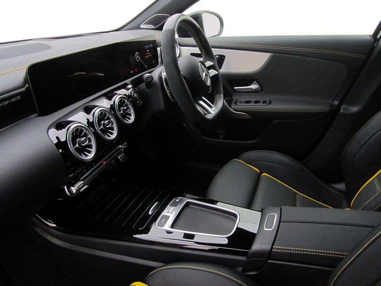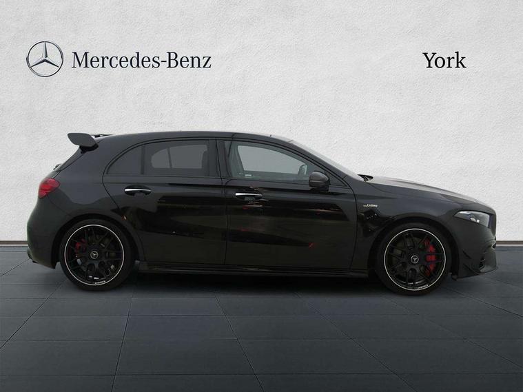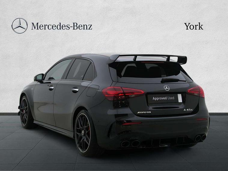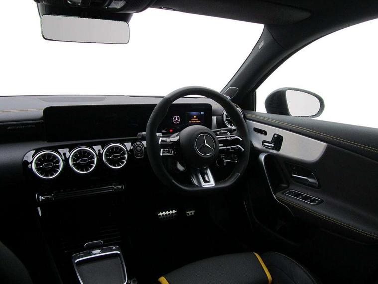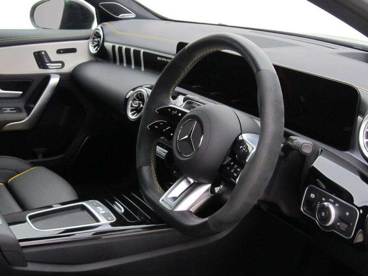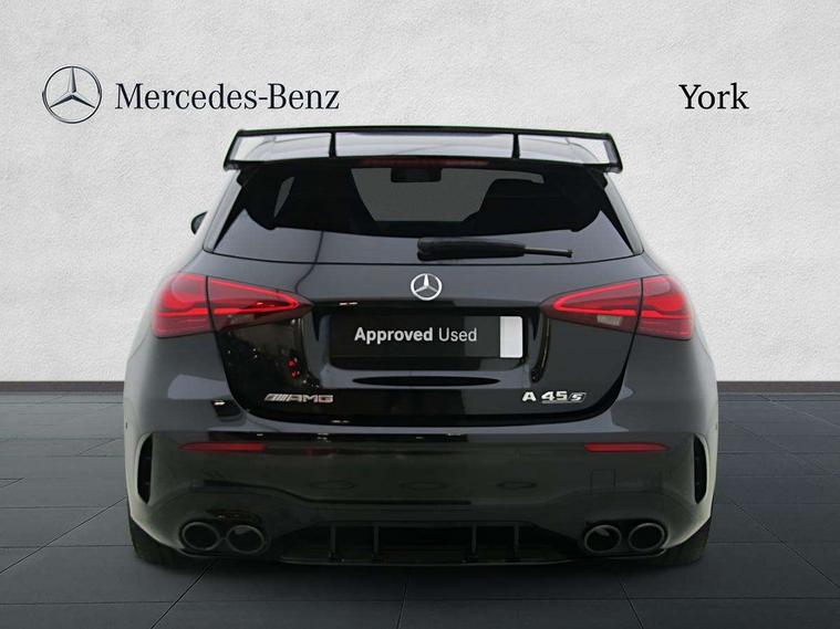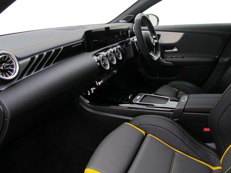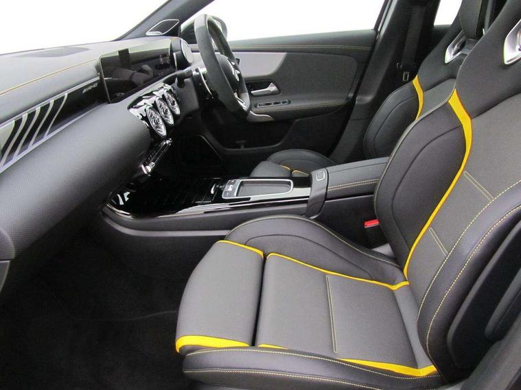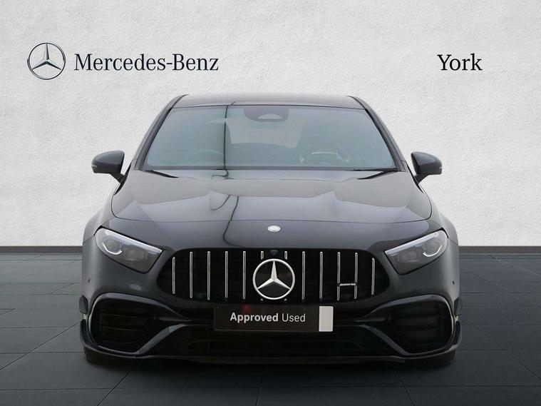 10.25 inch touchscreen central media display with AMG specific, AMG start up logo, visualisation of the AMG drive programs, vehicle and engine data, 10.25" Digital instrument cluster display screen, AMG DYNAMIC SELECT with drive modes(Slippery, Comfort, Sport, Sport+, Individual and Race) incl drift mode via steering wheel shift paddles+Race Start, AMG menu with sporty additional information - Gear indicator with yellow M symbol manual mode, Warm Up menu and Set Up menu, AMG speed sensitive steering with two sets of steering characteristics, Attention assist, Brake pad wear indicator warning light, Car wash mode, Direct steering, Dual bluetooth interfaces, ECO start/stop function, Engine start/stop button, Fingerprint scanner, Fluid level warning indicator for fuel, oil, coolant and washer fluid, Fluorescent jacket for driver, Hard-disk navigation, Head up Display, Hey Mercedes Voice activation, Lamp failure indicator, MBUX augmented reality for navigation, MBUX Interior assistant, Mercedes me connect including emergency call system, accident recovery, breakdown and maintenance management, Mercedes me remote services, Outside temperature gauge, Owners manual in English, Pre-installation of private car share, Preinstallation for Mercedes Benz link, Remote boot closing, Service indicator (ASSYST), Smartphone integration with Apple CarPlay and Android auto, Speed sensitive power steering, Tailgate, Traffic sign assist, Trip computer in multifunction display with current consumption indicator, Wireless charging, AMG performance 4MATIC+ with torque control, AMG suspension including AMG specific axles and sporty spring/damper setup, Suspension with adaptive damping system, Burmester surround sound system (590W) with Dolby atmos, speakers - 1 center+4 doors+2 in C pillars, tweeter, subwoofer, DSP amp, burmester lettering, DAB Digital radio, MBUX multimedia system, 4 Electric Front and Rear windows, Adaptive brake lights, AMG A45 S bodystyling -rear apron, four vertical fins, side sill panels, roof spoiler lip, specific front apron, diffuser look and S label on boot lid, AMG real performance exhaust sound system, AMG specific radiator grille in high gloss chrome with AMG lettering, Beltline strips in High gloss Black, Body colour bumpers, Body colour door handles with chrome inserts, Body colour side skirt, Electric adjustable and heated door mirrors with integrated LED side indicators, Headlamp assist automatic headlamp activation, Heat insulating dark tinted rear and rear side windows, Heated glass rear windscreen + timer control, LED daytime running lights, LED High level third brake light, LED tail lamp, Multibeam LED headlamps with adaptive highbeam assist and cornering function, Panoramic sliding sunroof, Privacy glass, Radio aerial, Rain sensing windscreen wipers with two sensitivity settings, Rear fog lights, Rear side wing doors, Rear windscreen wiper, Surround lighting with logo projection, Two round twin tailpipe trim elements each measuring 90 mm in diameter and AMG lettering plus ribbing on the inside of the pipe, Valve control dependent on drive program, Wider wheel arches for AMG wheels, Window line trim strip in black, 3 seat bench in 2nd row, 3 Spoke flattened lower section sporty design AMG Performance steering wheel in nappa leather/microcut microfibre, 40:20:40 split folding rear seats, Air conditioning - Two zone thermotronic luxury automatic climate control with display, AMG brushed stainless steel sports pedals with rubber studs, AMG centre console finished with trim in silver chrome, AMG floor mats, AMG performance seats, AMG sporty centre console with raised front section and integral control switched for manual transmission mode, AMG steering wheel buttons, Automatic child seat recognition sensor, Black air vents with surround in silver chrome, Black roof lining, Electrically adjustable front memory seats including lumbar support and backrest inclination, Front centre armrest with stowage, Front seat head restraints, Height/reach adjustable steering column, Illuminated AMG front door sills with changeable cover, Interior lighting - 64 colour Ambient lighting, Interior mirror with reading lamps in black and frameless, Rear armrest with 2 cupholders, Rear head restraints, Seat occupancy sensor for front passenger seat, Silver coloured aluminium gear shift paddles on steering wheel, Single front passenger seat, Stowage compartment in centre console with retractable cover, Sunvisors with illuminated vanity mirrors, Twin front cupholders, Aerodynamic pack - A Class, AMG Driver's pack - A Class, AMG night pack - A Class, AMG performance high-end seat pack - A Class, Light and sight package - A Class, Mirror package - A Class, Multi-contour seat pack - A Class, Parking pack with 360 degree camera - A Class, Seat comfort pack - A Class, USB pack plus - A Class, Winter pack - A Class, 3 rear 3 point seatbelts, 3 stage electronic stability programme, ABS with Brake Assist, Active bonnet, Adaptive brake assist with hold function and hill start assist, AMG high performance brake system with red painted brake callipers and black AMG lettering at the front, ventilated and perforated brake discs, Black seatbelts, Bonnet with power domes, Childproof locks manually operated for rear doors and electrically operated for rear power windows, Crash responsive emergency lighting, Driver and passenger head and side airbags, Drivers knee airbag, Dual stage driver/passenger airbags, Electronic parking brake, ESP curve dynamic assist, ESP with ASR, Exit warning, Front and rear seatbelt reminder, ISOFIX and top tether child seat fixing points in two outer rear seats, Tyre pressure monitoring system, Warning triangle and first aid kit, Window airbags, Alarm system/interior protection/immobiliser, Guard 360 degree vehicle protection, Keyless entry lock/unlock, Keyless Go, Remote central locking and crash sensor with emergency opening function, Aluminium AMG design black/silver interior trim, 19" AMG