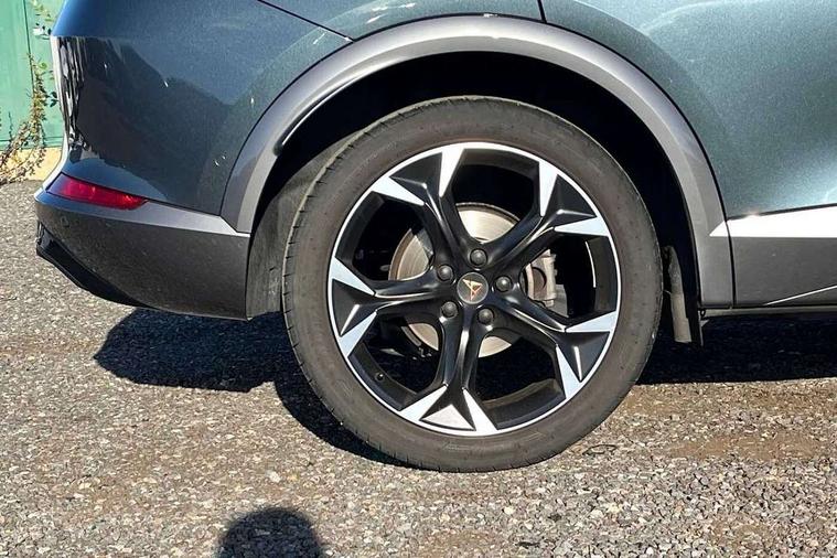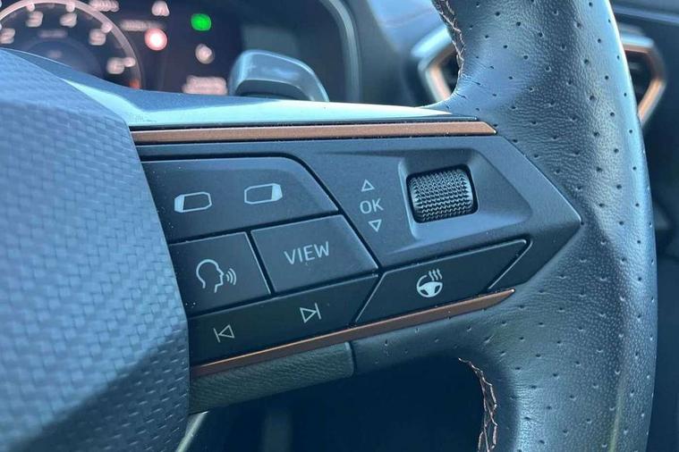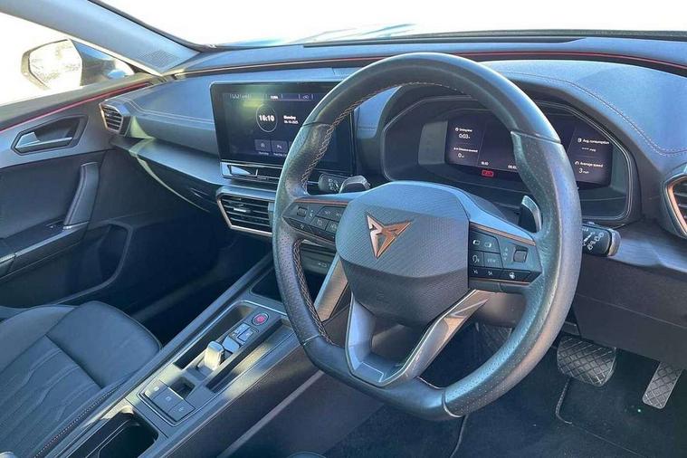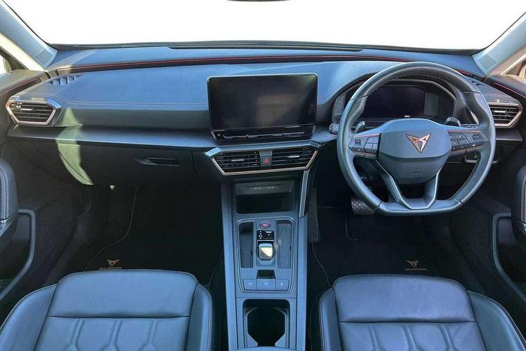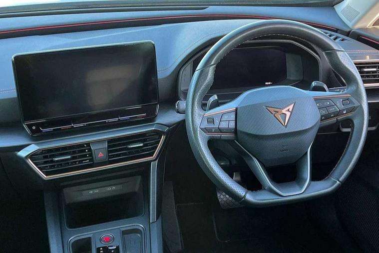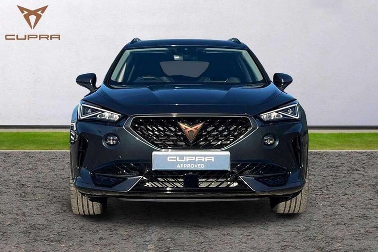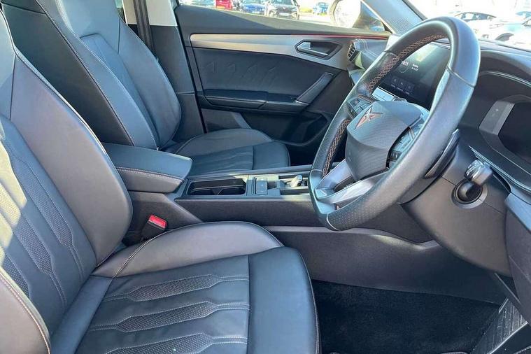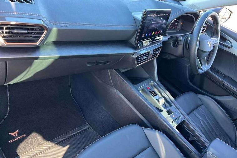 Digital cockpit and configurable dashboard, Driver alert system, Driving profile selection, E-call, Forward collision warning with automatic braking, Lane assist, Park assist (inc front/rear parking sensors), PAS, Predictive adaptive cruise control with speed limiter, Rear view camera, RPM, trip computer, outside temp gauge, instrument light brightness, low fuel warning light, lights on reminder, gearshift indicator, Service interval indicator, Start/stop system with regenerative braking, Wireless apple carplay, Wireless phone charger, Electronic locking differential and dynamic traction support, Standard suspension, 2 front and 2 rear USB type C sockets, Auxiliary input socket, DAB radio, Auto dimming rear view mirror, Body colour door handles, Body coloured bumpers, Dark grey wing mirror, Daytime running light with automatic headlight control and coming home feature, Dynamic headlight range control, Electric front/rear windows, Electrically adjustable heated and folding door mirrors with memory function, Front fog lamps with cornering function, Gloss black roof rails and window surrounds, LED Headlights, LED Taillights with dynamic indicator, Rain sensing wipers, Rear diffuser with black simulated exhaust pipes, Rear side wing doors, Rear wash/wipe, Third brake light, Tinted rear windows, Welcome lights, 12v power supply in centre console, 12V socket, 12v socket in loadspace, 2 front and 2 rear reading lights, 230V socket, 3 seat bench in 2nd row, 60/40 split rear bench seat with armrest and mechanical seat release, Dust/pollen filter, Front and rear head restraints, Front centre armrest, Height/reach adjust steering wheel, Illuminated interior front door sills, Illuminated sunvisor with mirror, Isofix, Leather multi function heated steering wheel with gear shift paddles, Luggage tie-down hooks, Single front passenger seat, Three zone climate control with control panel in rear, Variable luggage/load compartment floor, Wraparound lighting, Genuine Nappa leather Pack - Cupra, Navigation system pack with 10" navigation system - Formentor, 3 point seatbelts on all rear seats, ABS, Brake control system - ESC and brake booster, Child proof door locks, Driver and front passenger airbags with front passenger airbag de-activation, Electronic parking brake, Front and rear disc brakes, Front side curtain airbags, Hill hold control, Seat belt reminder for front and rear seats, Tyre pressure monitoring system, Anti theft alarm system, Keyless entry and start system (KESSY), Locking wheel bolts, Copper and aluminium interior detailing, 19" 'Exclusive' machined sport matte black and silver alloy wheels,